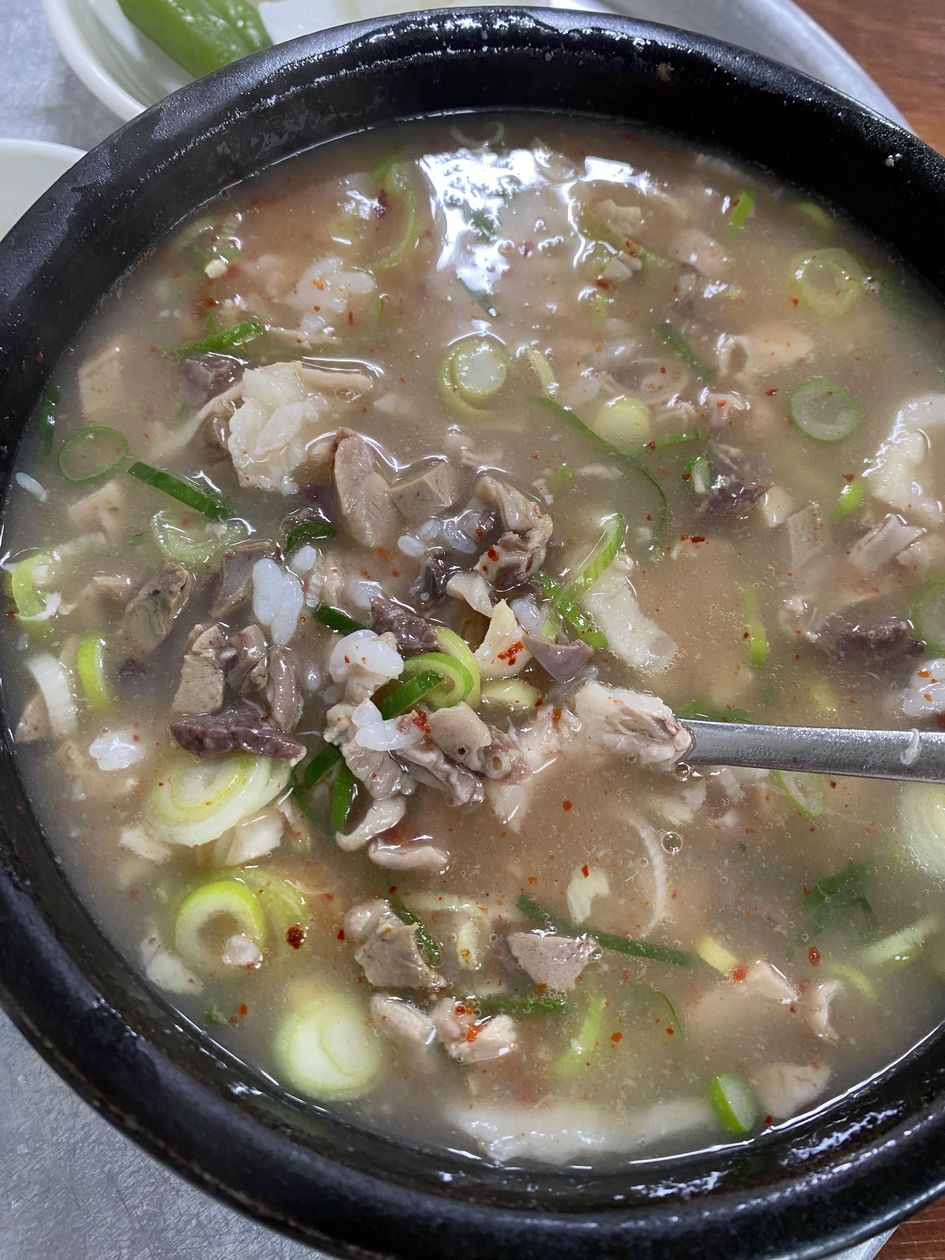 하동식당의 돼지국밥은 바로 고기가 잘게 썽글려서 진짜 국에 밥이 말아져 나온다는 건데요, 일반 돼지국밥처럼 소면이 따로 나오지는 않습니다. 뜨끈한 국물에 미리 말려져 나오는 돼지국밥이라 호호 불어가며 조금씩 먹게 되는데 흰쌀이 충분히 불려 국물에 진득하게 우려 나오는 시간까지 좀 기다려서 먹는 게 하동식당 돼지국밥을 제대로 즐기는 방법 아닌가 생각됩니다.