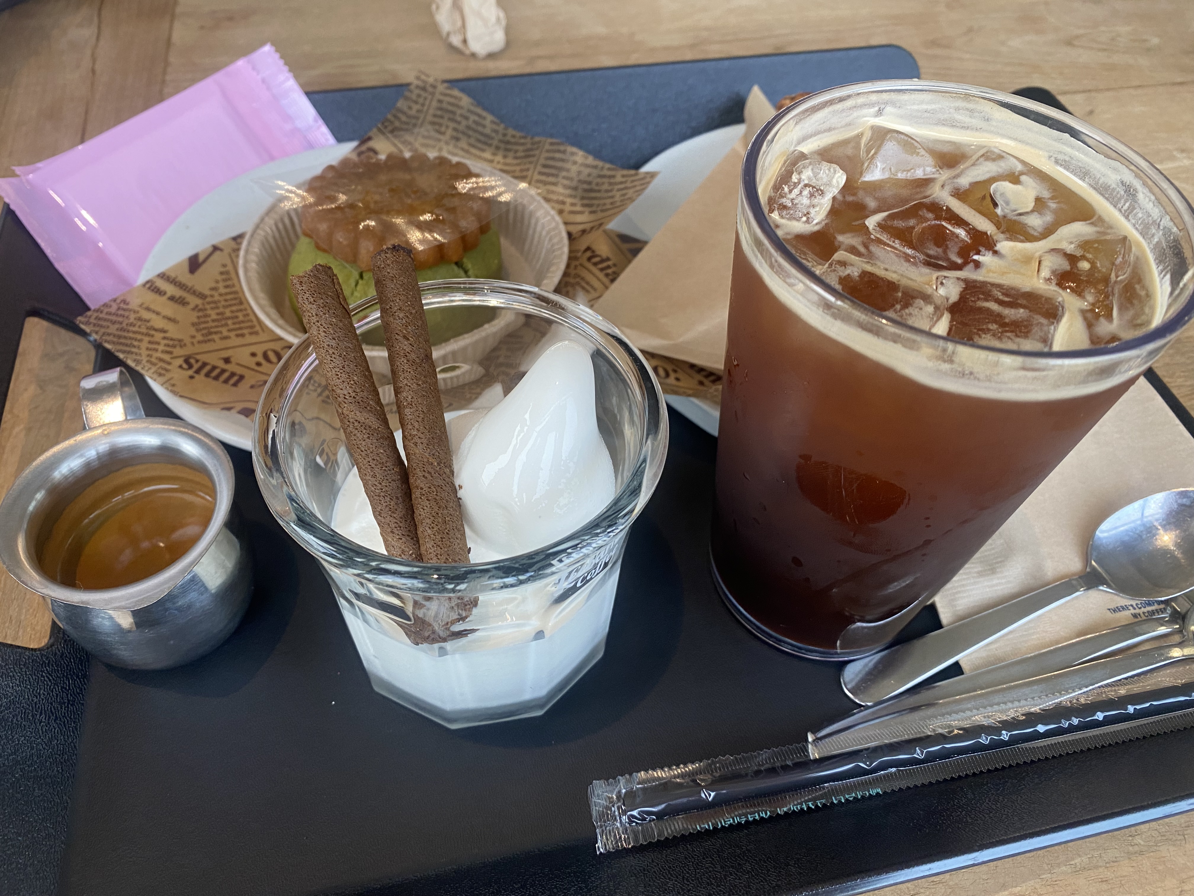방문 당시 오후 4시쯤이었는데 벌서 맛있는 디저트는 다 나가고 겨우 간식거리 약과가 올려져 있는 디저트를 고를 수 있었습니다. 아아랑 아포가토 커피가 나왔고요~~