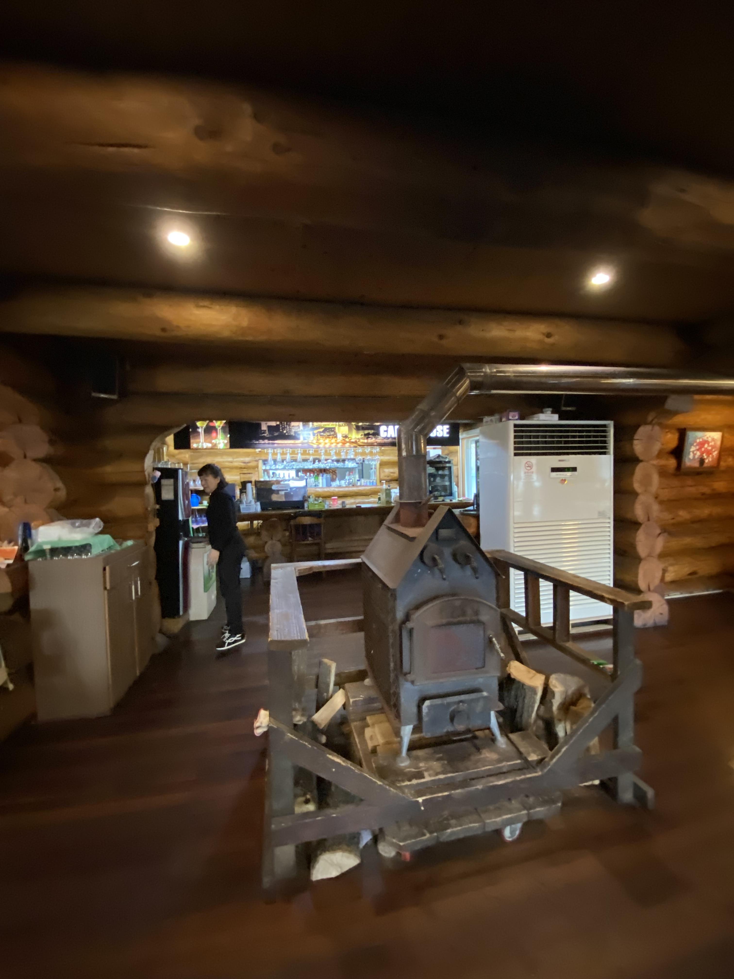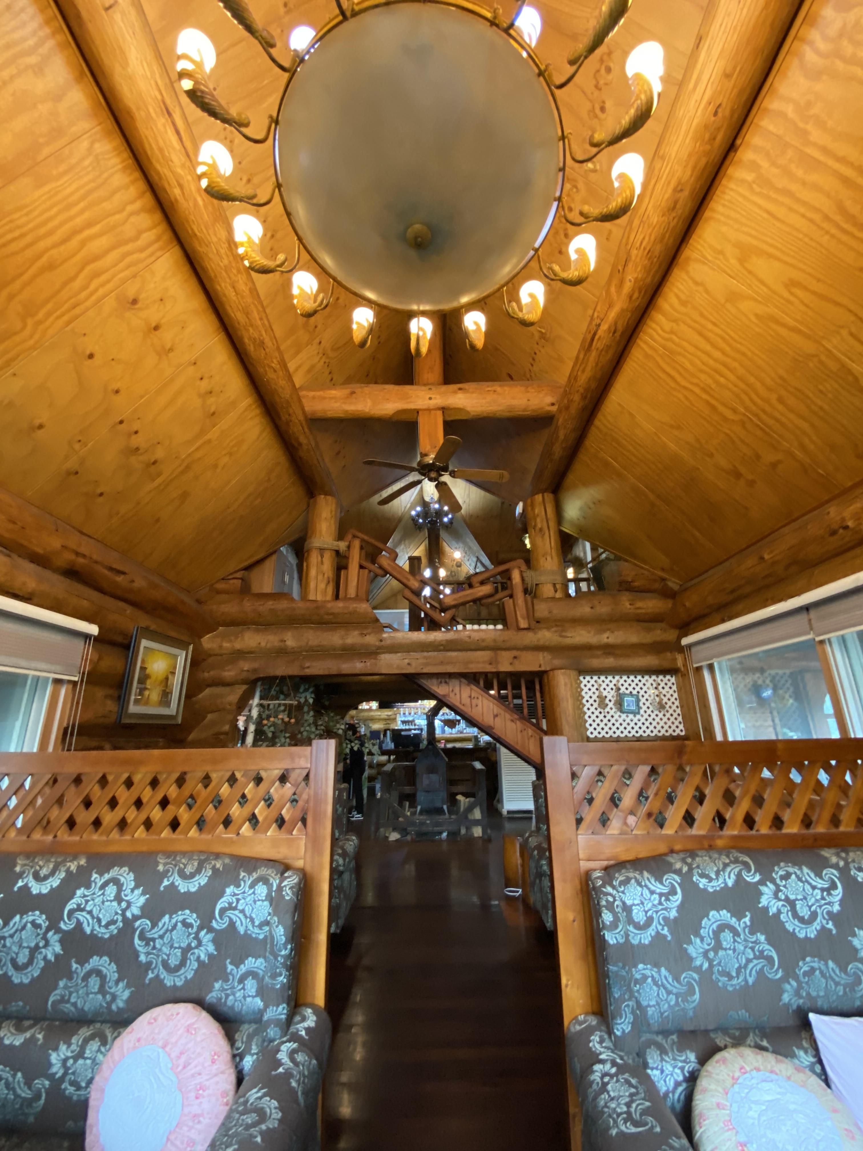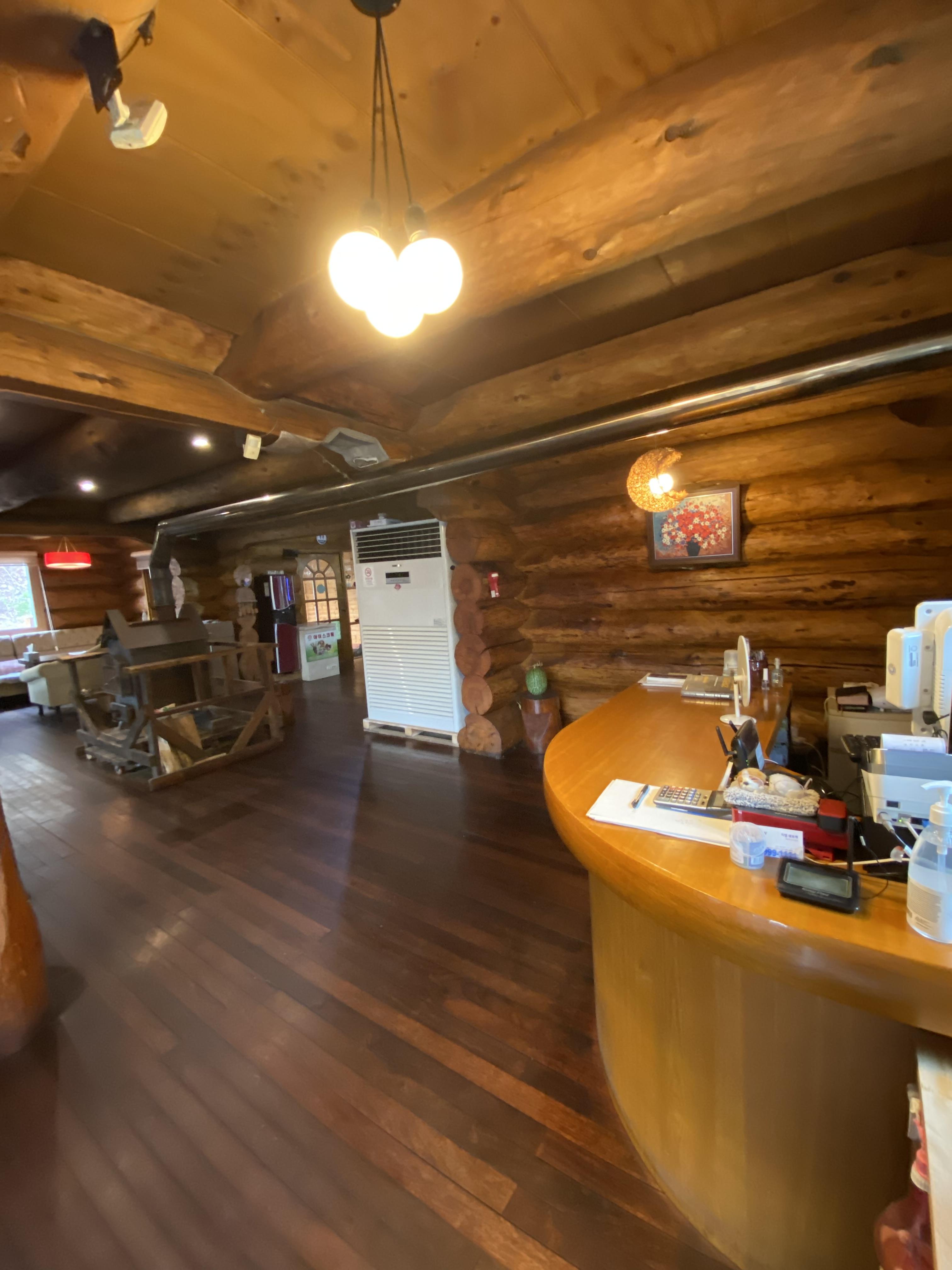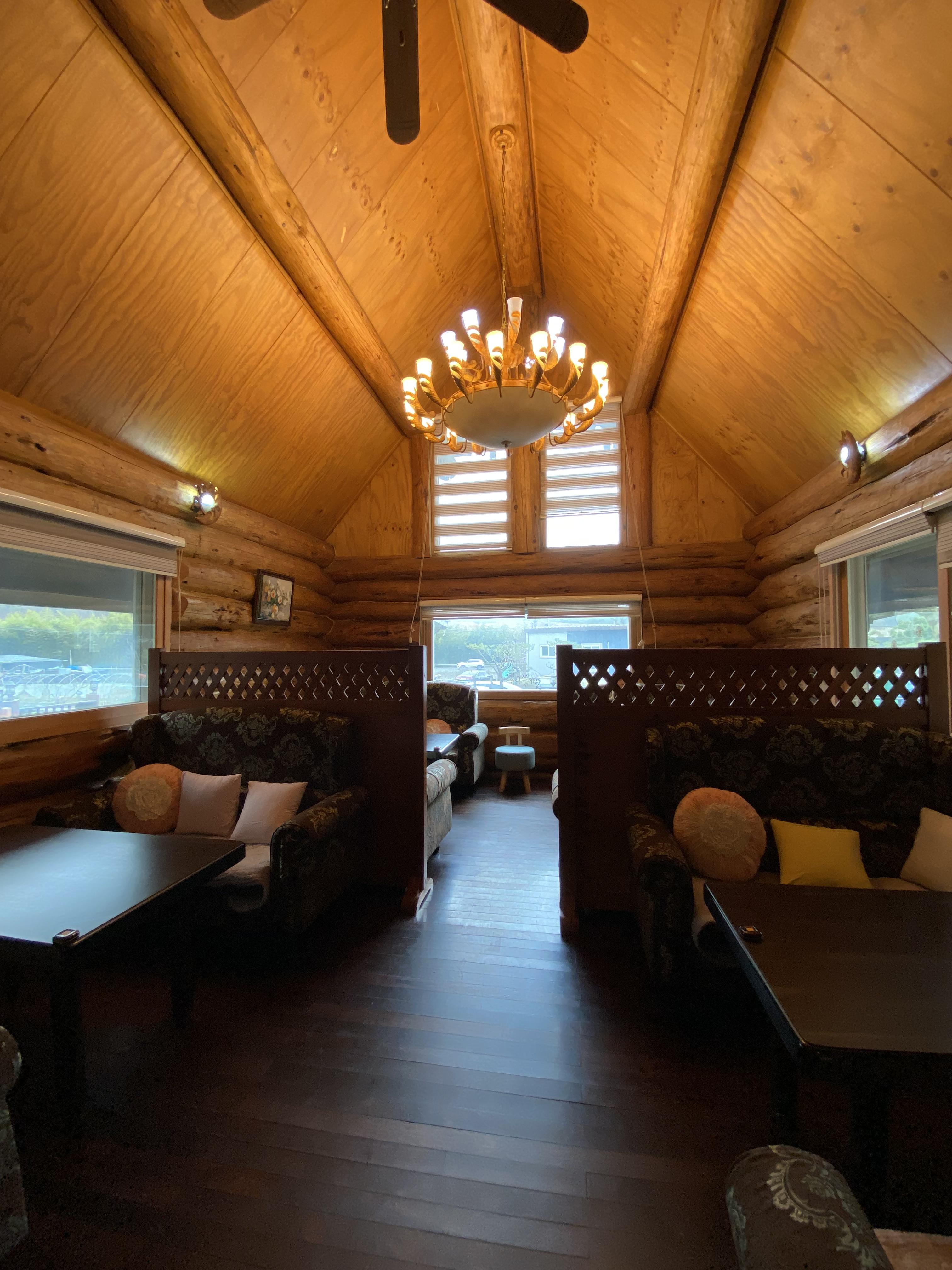 실내로 들어가니 우와~~~ 2층 통나무 하우스입니다. 쇼파도 큼직하고 실내 인테리어도 30년쯤 되어 보이는 분위기의 경양식집이네요.