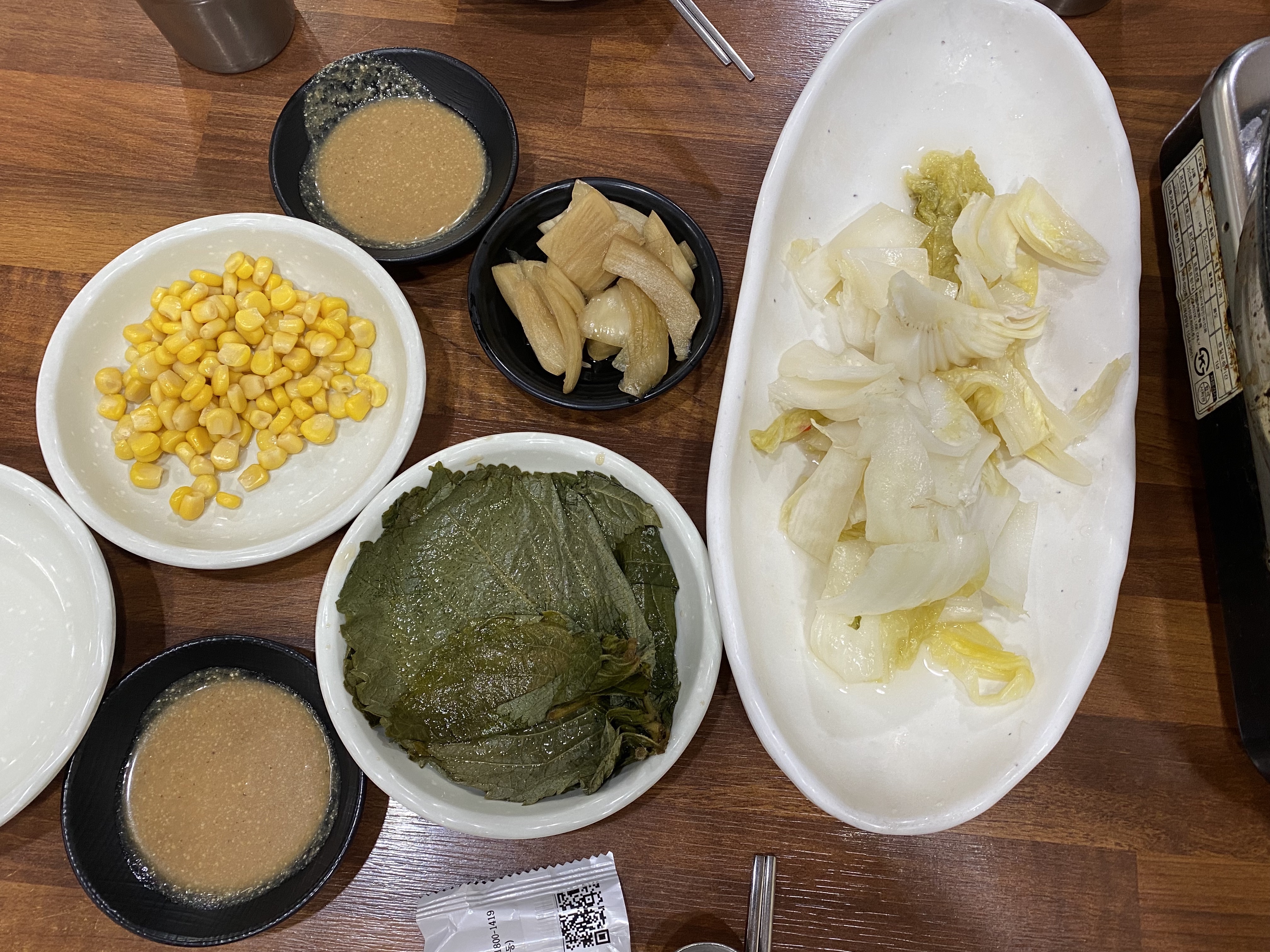 기본 찬과 땅콩 소스 같은 게 차려졌습니다.