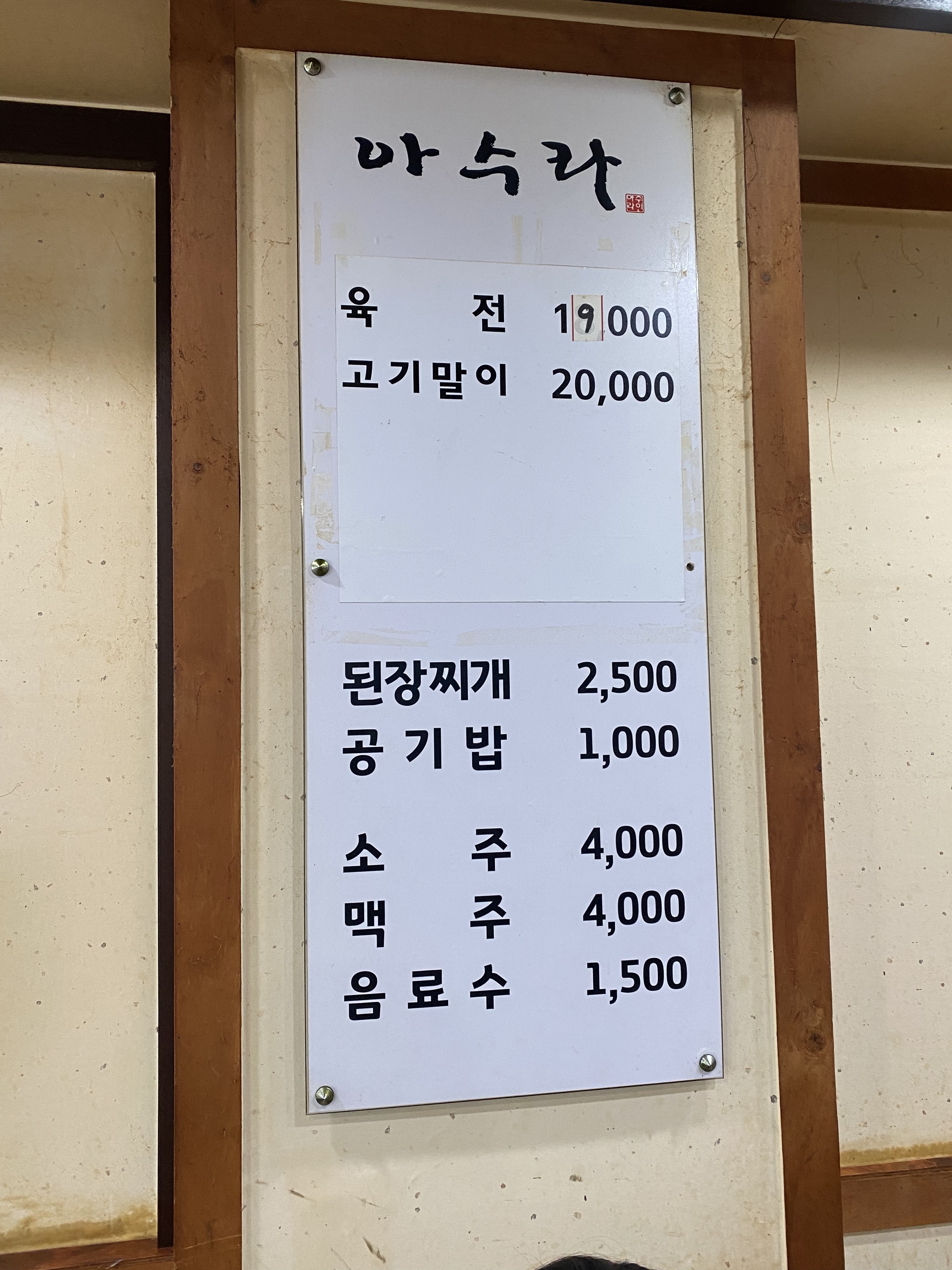 실내에는 4인용 테이블이 열 개 정도 갖춰져 있는데 저희가 도착했을 때는 굿타이밍으로 사람들이 다 나와 쉽게 테이블을 안내받을 수 있었습니다. 메뉴는 초간단 육전, 고기말이 요게 끝입니다. 된장찌개, 공깃밥, 음료는 개별 주문이고요. 소식 좌 가족이라 아들 먹고 싶다는 육전에 고기말이 2인분까지 주문하고 싶었으나 무조건 남기는 각이기도 하고 처음 보는 메뉴기도 해서 맛이 어떨는지 몰라 그냥 고기말이 2인분만 주문했습니다.