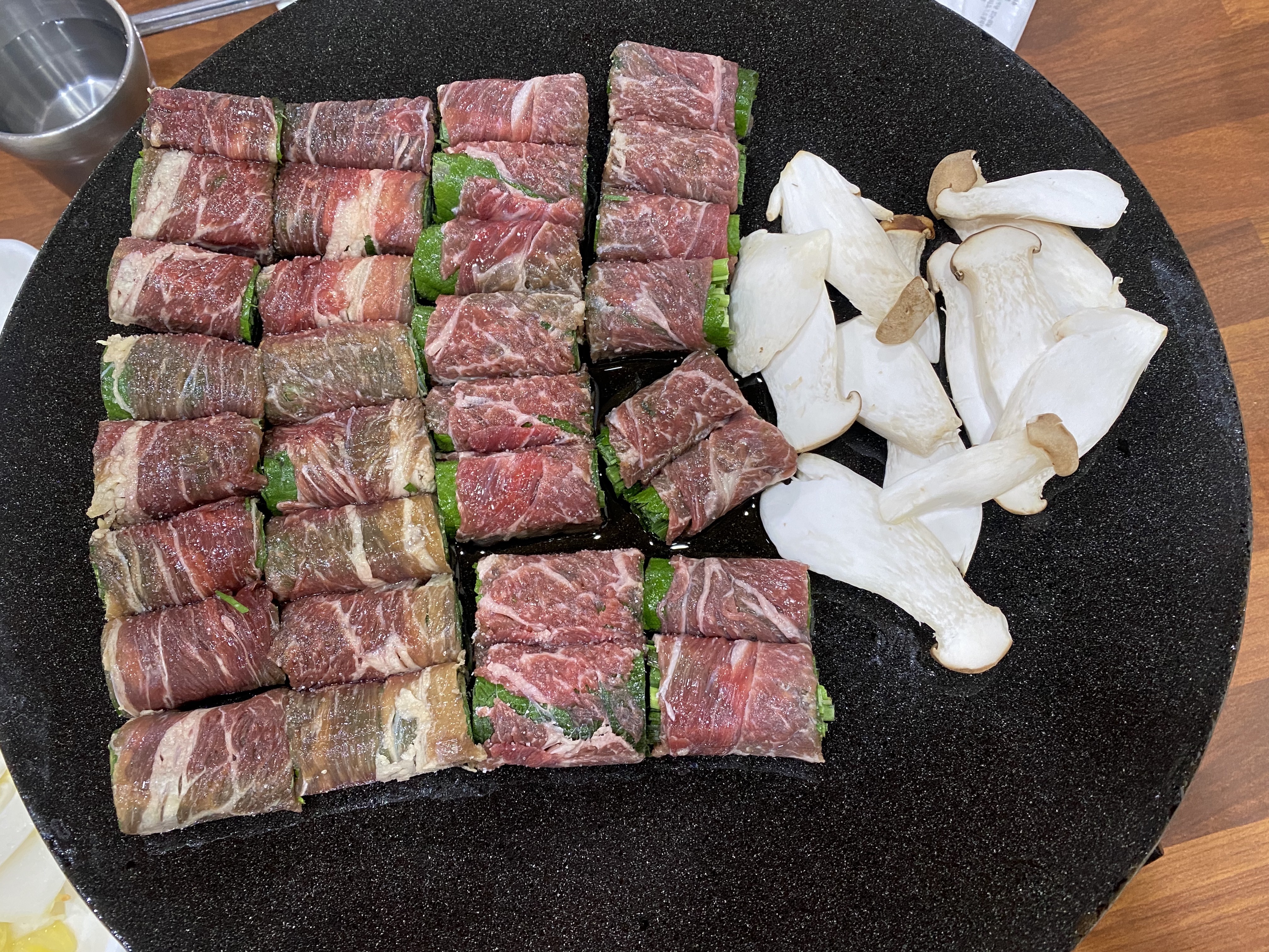 금세 다 익고 솥 바깥으로 고기말이를 쌓아주는데요, 아들 얼굴을 보니 고기 사이에 야채가 가득 들어가 있어 인상이 팍팍~!! 그런 눈치를 채고 엄마가 바로 아들 좋아하는 된장찌개를 주문했더니 세상에 고기말이 구운 불판 위에 세팅되어 나온 된장찌개 한 그릇을 부어줍니다. 보글보글 된장찌개 냄새도 기가 막히더군요. 맛있는 냄새난다고 금세 기분 업된 아들입니다^^