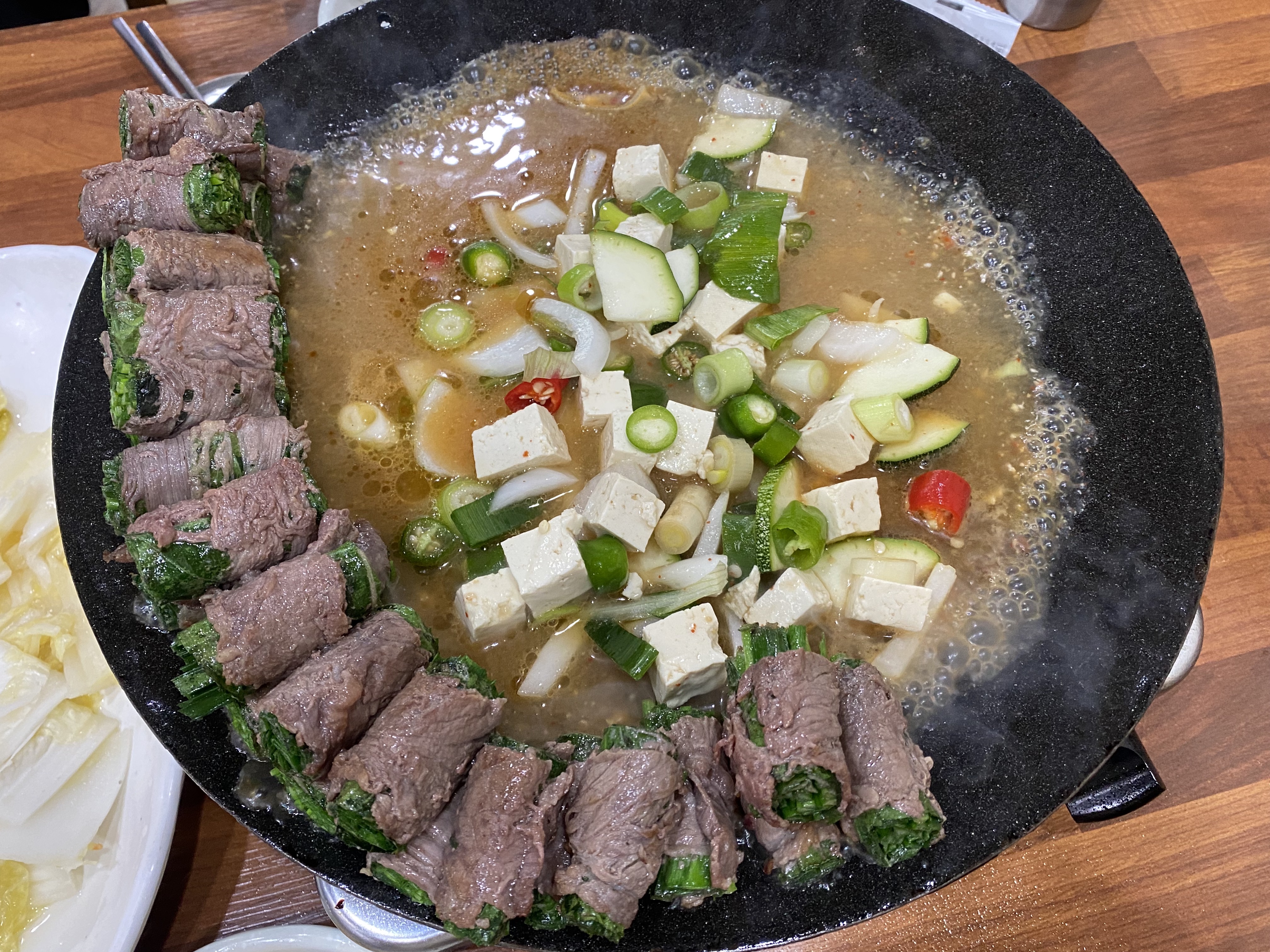 우와~~~ 고기말이 2인분이 무쇠솥에 가득 올려집니다. 고기말이 속은 부추와 깻잎으로 가득 채워져 있었고요~ 고기말이가 익혀지는 동안 군침이 한없이 흘러나왔습니다.