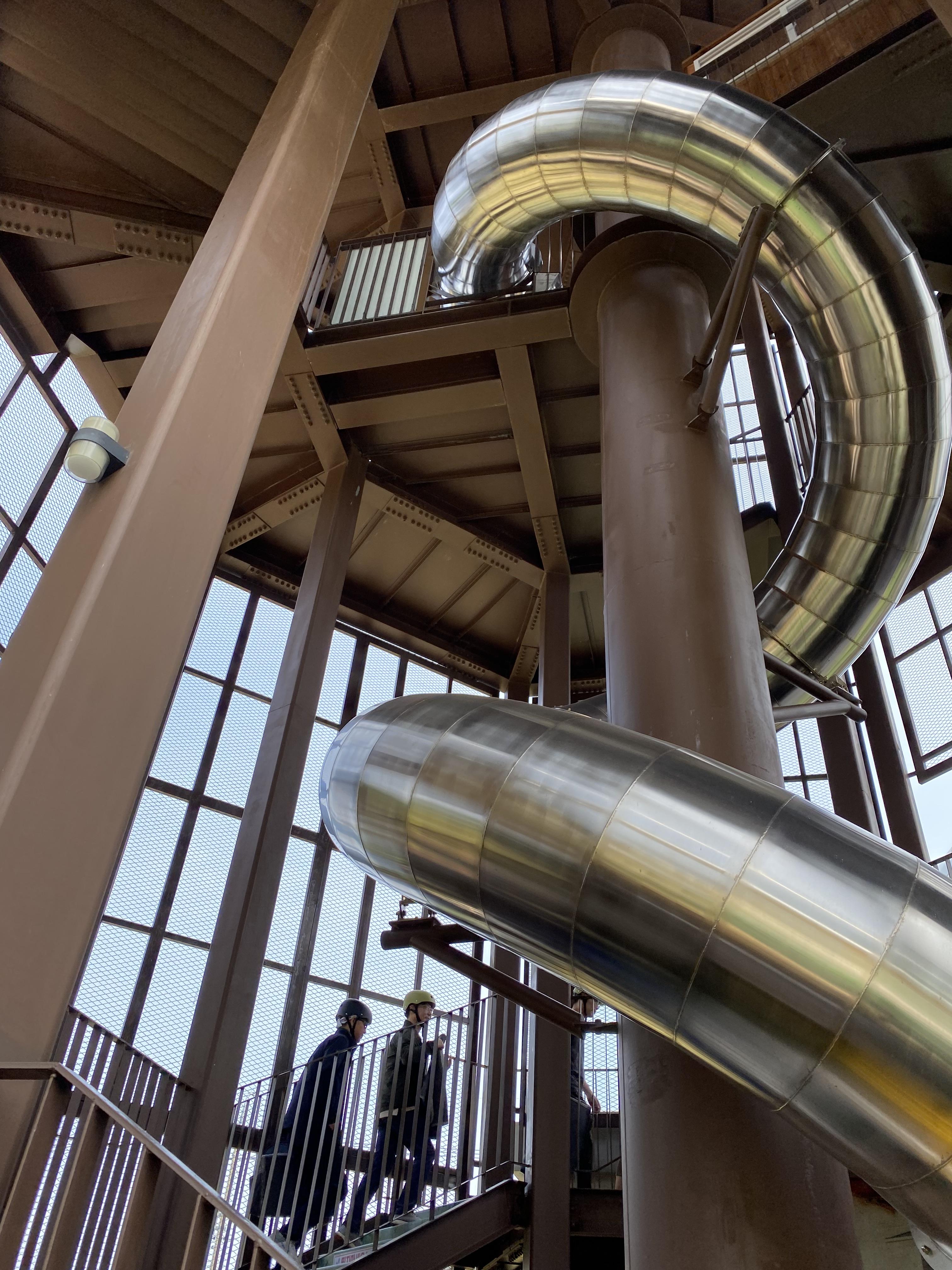 꼭대기까지 올라오니 바람도 많이 불고 건물이 흔들리는 게 느껴집니다. 살짝 쪼랐다는... 저 멀리 파란색과 노란색 장소가 보이는데요 자이언트 스파이럴은 노란색이 최종 도착하는 곳 되겠습니다.