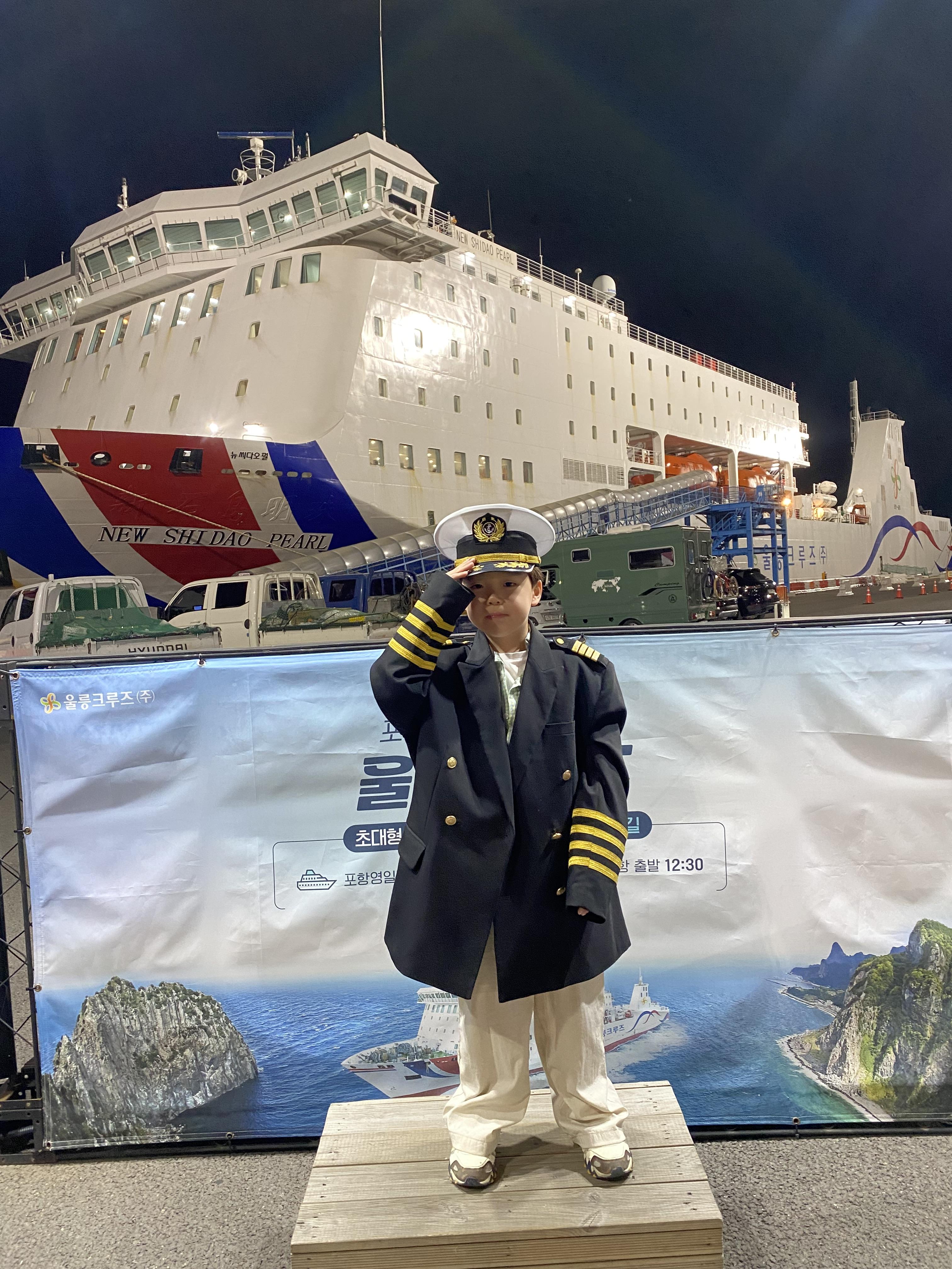 주차 안내 직원에서 차량 승선권을 보여주고 다시 안내하는 곳으로 차량을 이동시키면 차량 선적은 직원들이 해줍니다. 그러고 나서 이제 배 승선하는 곳으로 이동을 하는데 ~ 의복을 입고 기념촬영을 하는 이벤트 장소가 마련되어 있어 아들도 선장님 포즈로 기분 좋게 찰칵!! 그러고 나서 이제 크루즈 승선을 하러 갑니다.