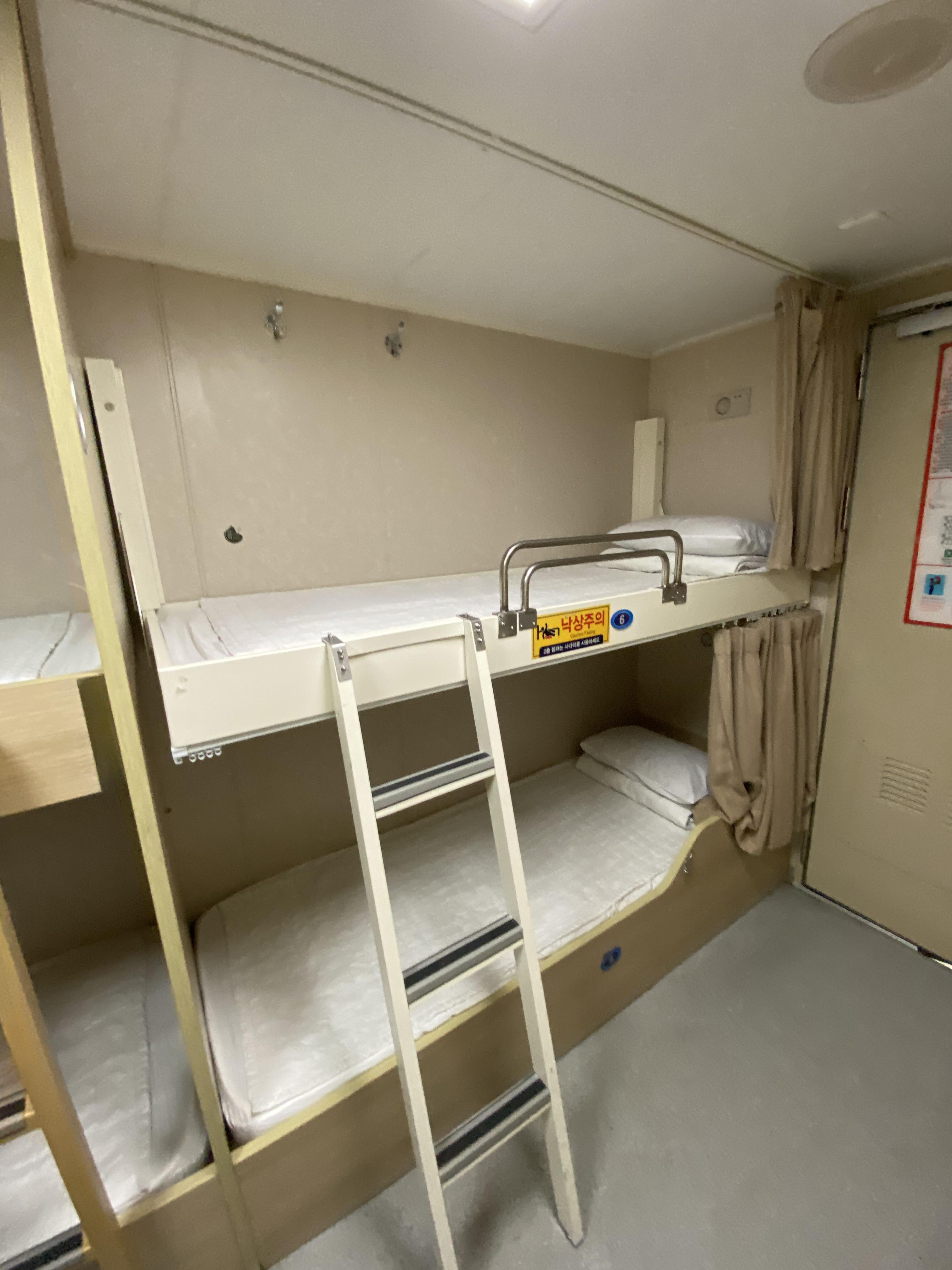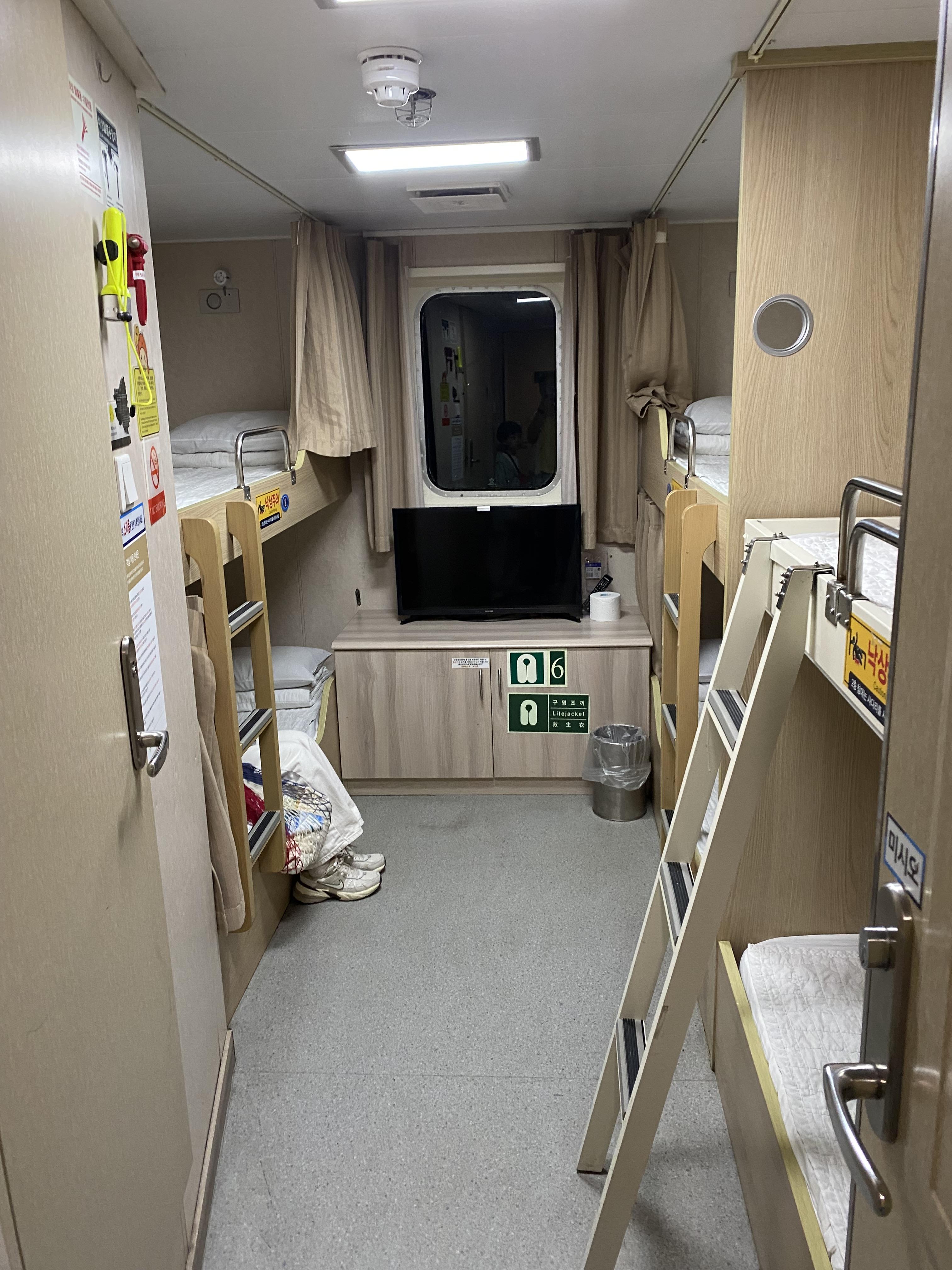 울릉크루즈 6인실은 1층과 2층간에 층고가 확보되어 있어서 1층 침대에 앉아 있어도 불편함이 안 느껴졌습니다. 화장실에는 사진으로는 안 나와 있지만 샤워기도 설치되어 있는데 공간은 좁은 편입니다. 전체적으로 좁은 6인실이나 매우 쾌적하고 깨끗한 관리 상태를 보여줍니다.