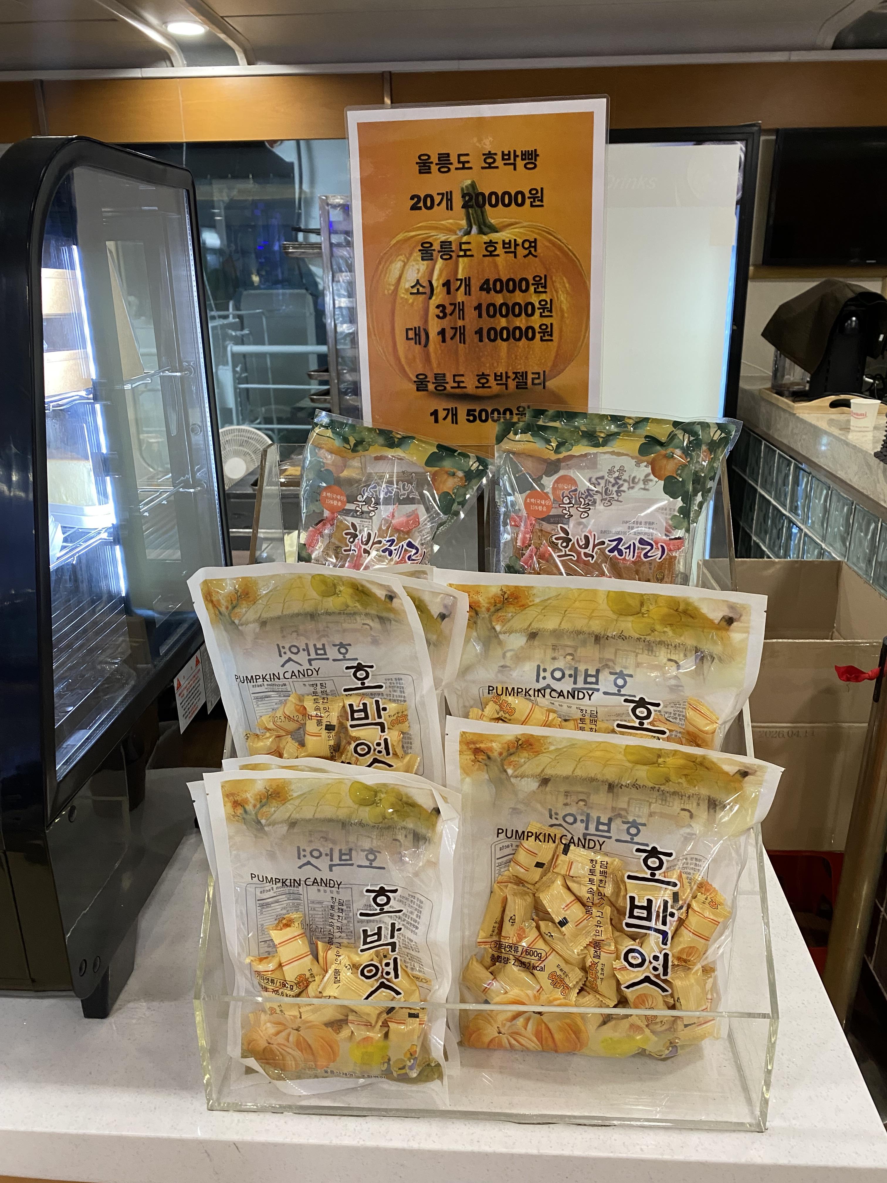 울릉도 호박빵과 호박엿도 팔고 빵 종류도 많이 있었습니다. 촬영한 당시엔 몰랐으나 호박빵과 호박엿은 울릉도에 가서 저희가 직접 공장에 들러 구매한 빵, 엿과 동일한 제품을 배에서도 팔고 있었네요. 공장 가격 동일함.