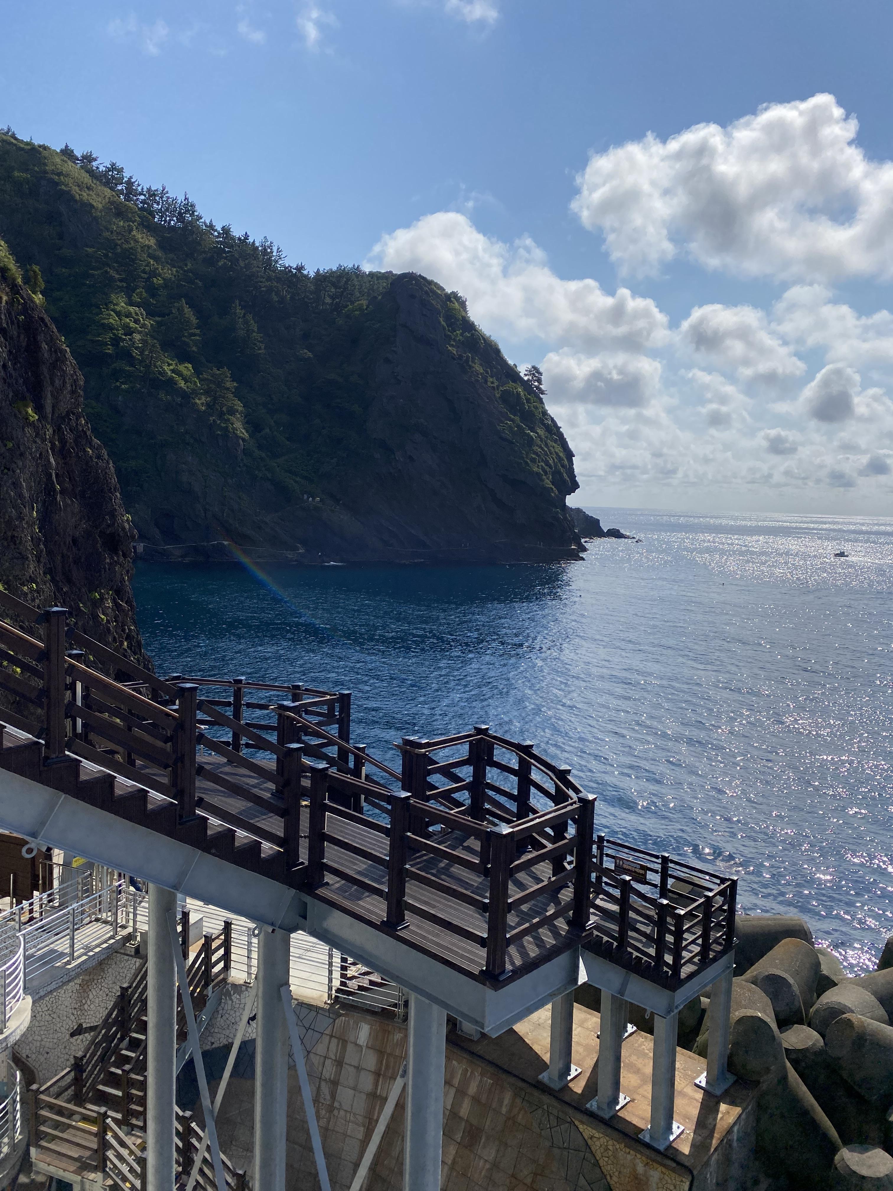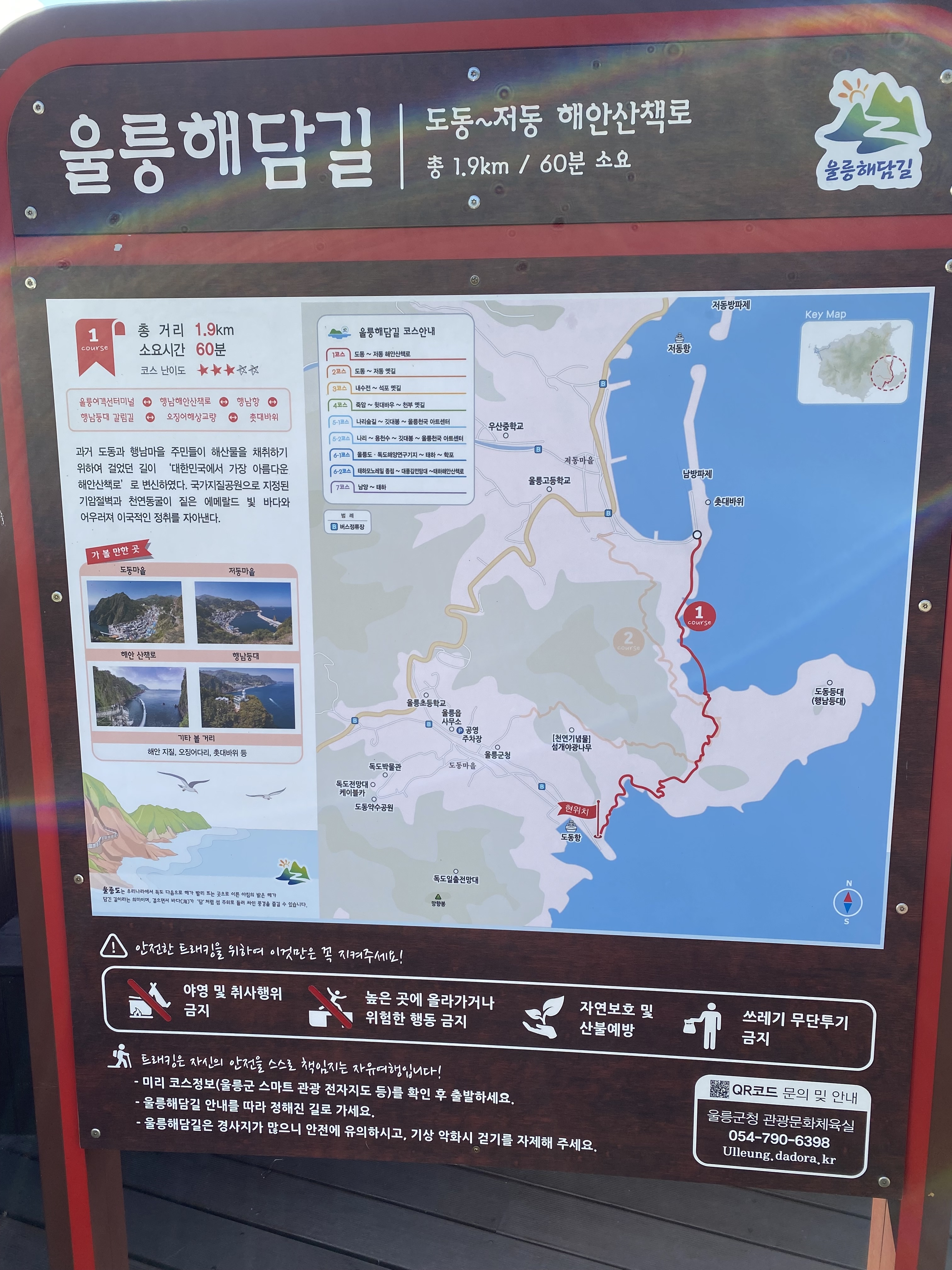 이른 아침 든든한 나주곰탕으로 배를 채웠더니 그제야 주변 환경이 눈에 들어오고 어디를 갈지 목적지가 정해지기 시작합니다. 도동항 여객터미널에 사람들이 엄청 붐비던데 이유가 있더만요. 여객터미널 윗길로 이어지는 행남해안 산책로가 아주 유명한 울릉도 뷰 포인트로 관광객들의 발길을 불러 모으는 곳이었습니다. 그래서 저희도 오늘 첫 번째 행선지는 바로 행남해안 산책로 정하고 아침 8시에 본격적인 탐방에 나서봅니다.