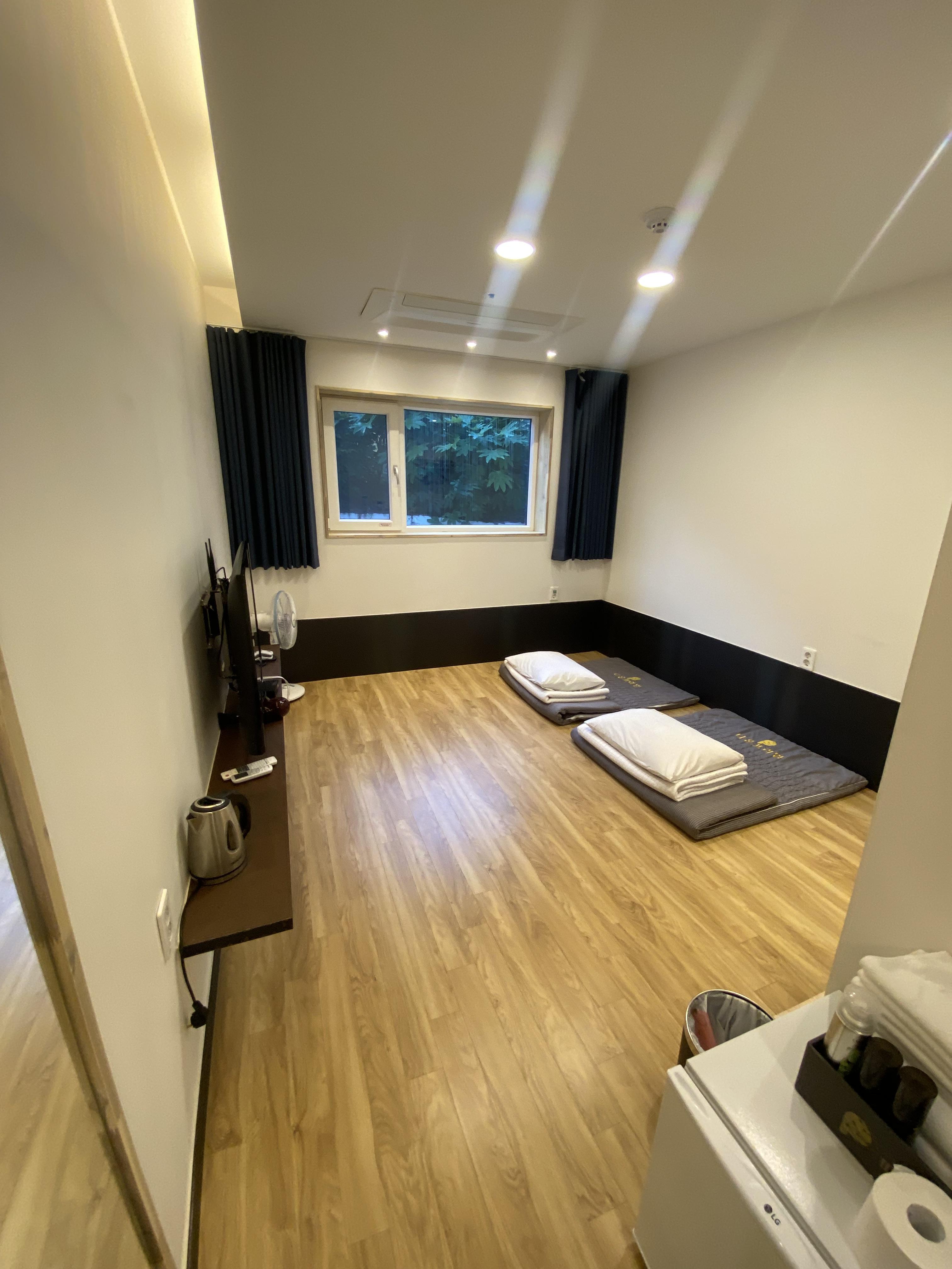 안내받은 방으로 들어가니 짜잔~ 굳이 매트 추가를 안 해도 세 식구 누울 자리 충분한 듯 살짝 좁은듯한 일반실 공간이 나옵니다. 들고 온 짐을 잘 정리하니 공간은 충분히 나오네요. 6월이라도 울릉도는 밤이 추워서 낮에는 에어컨을 틀고 밤에는 난방을 해야 따듯하게 잘 수 있는데 중앙난방 식이라 방이 생각보다 찹다면 로비에 연결해 온도 올려달라고 얘기를 해줘야 합니다.
