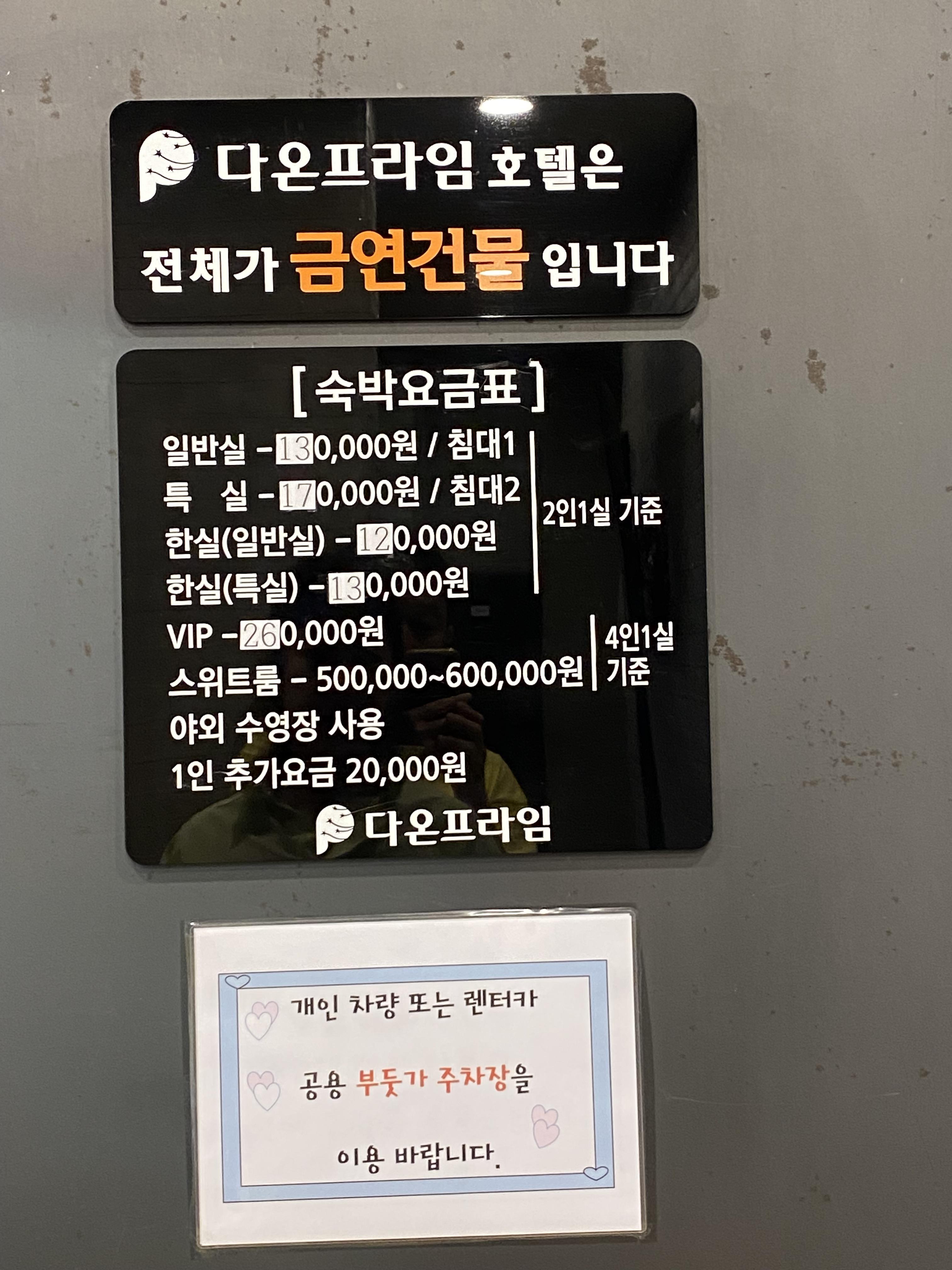 6/5 기준 다온프라임 호텔 이용 가격표인데요, 저희는 온라인 사이트에서 한실(일반실) 2박 26만 원으로 결제를 했는데 헌장에서는 가격이 1박당 1만 원 더 저렴해서 살짝 당황했다랄까요? 아무래도 수수료 챙겨줘야 하니 온라인 예약 비용이 좀 더 비싼 게 아닌가..... 비수기 때는 현장에서 바로 결재를 하는 게 좋을듯합니다.