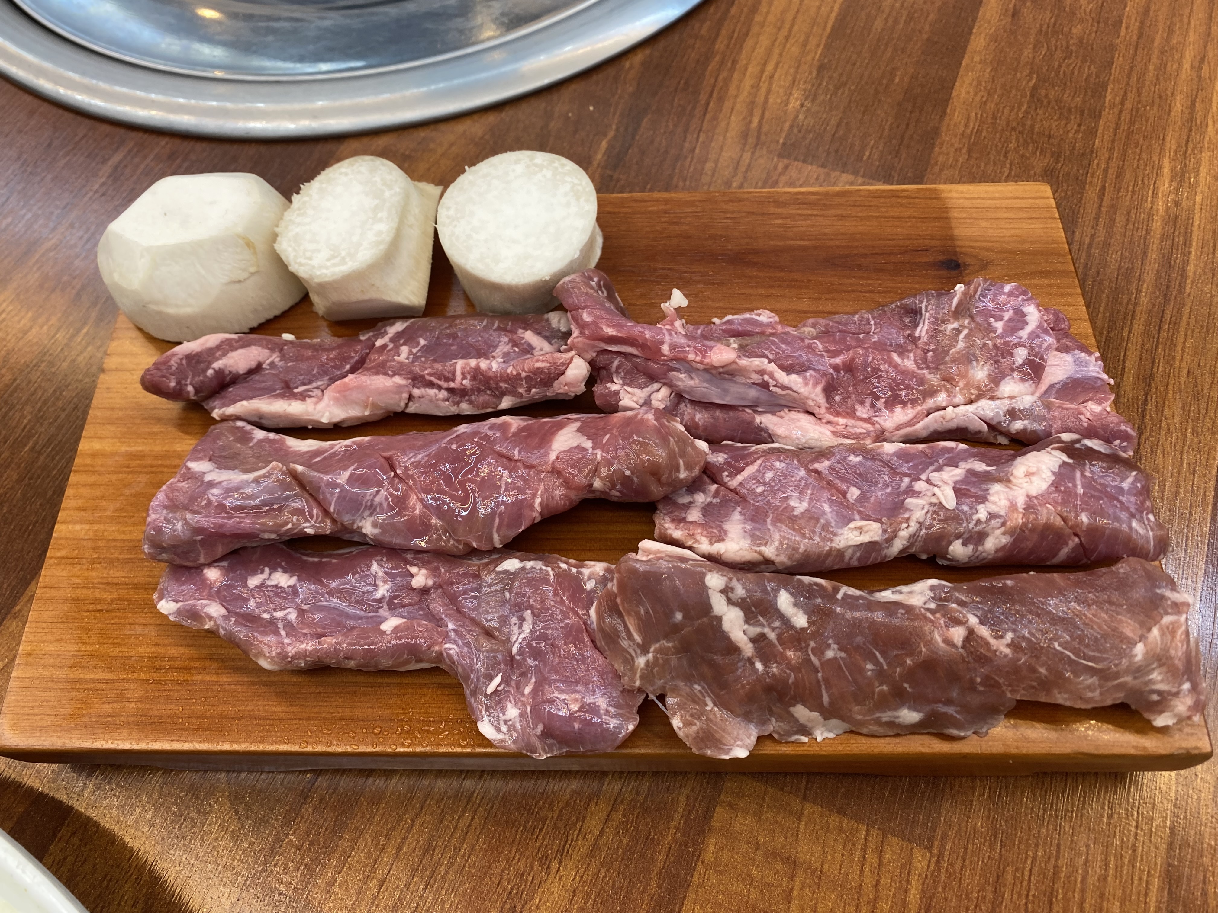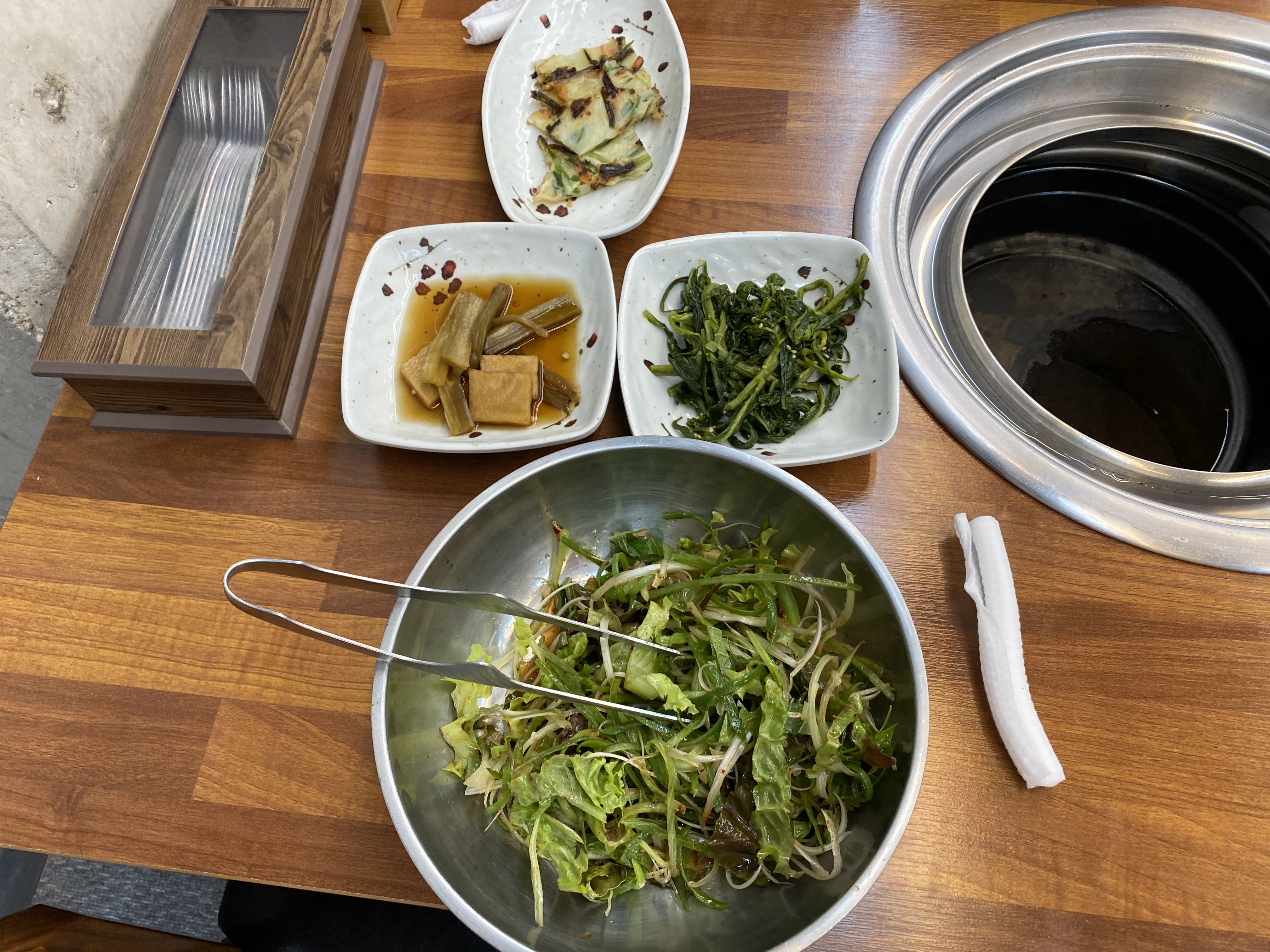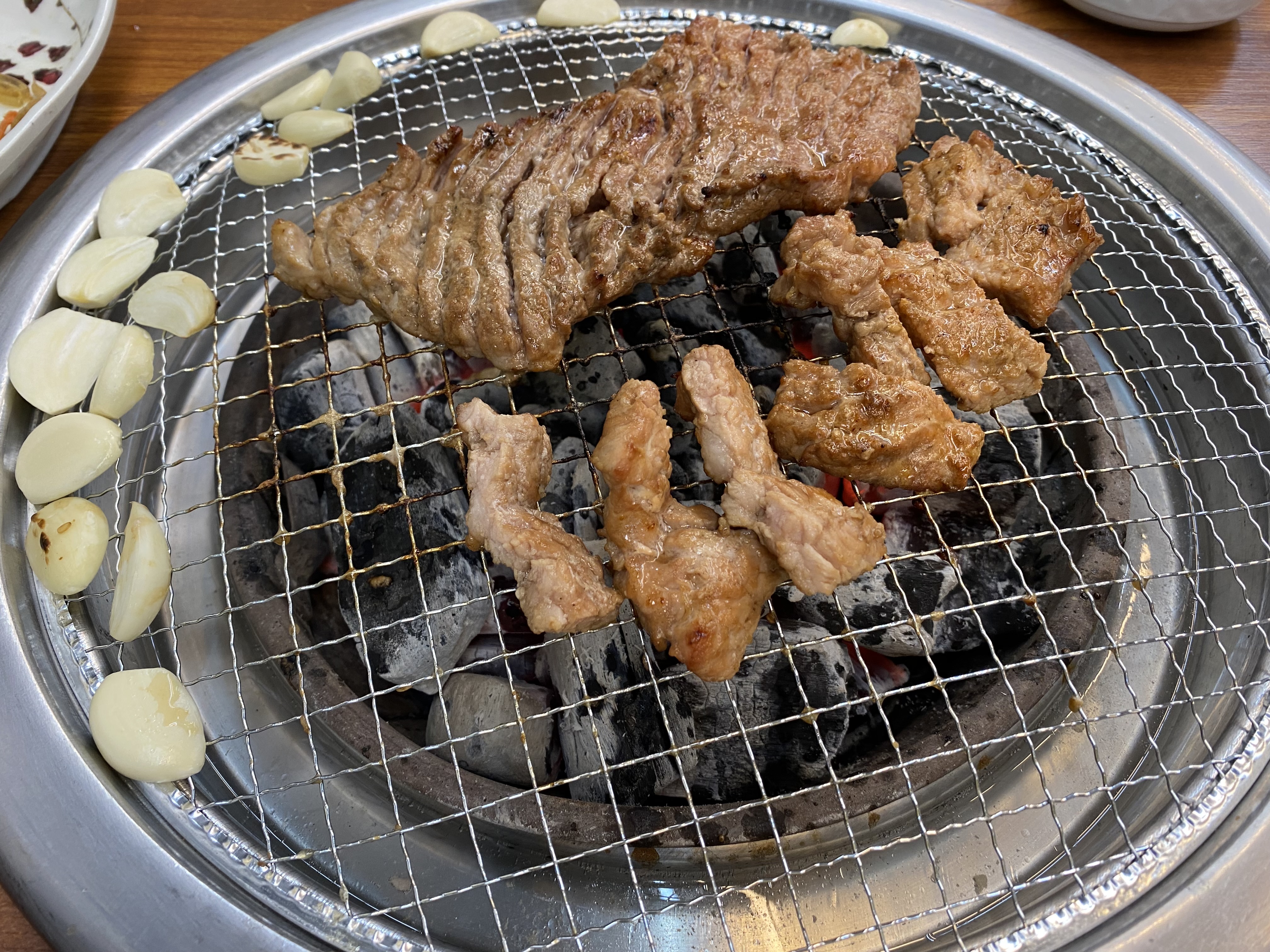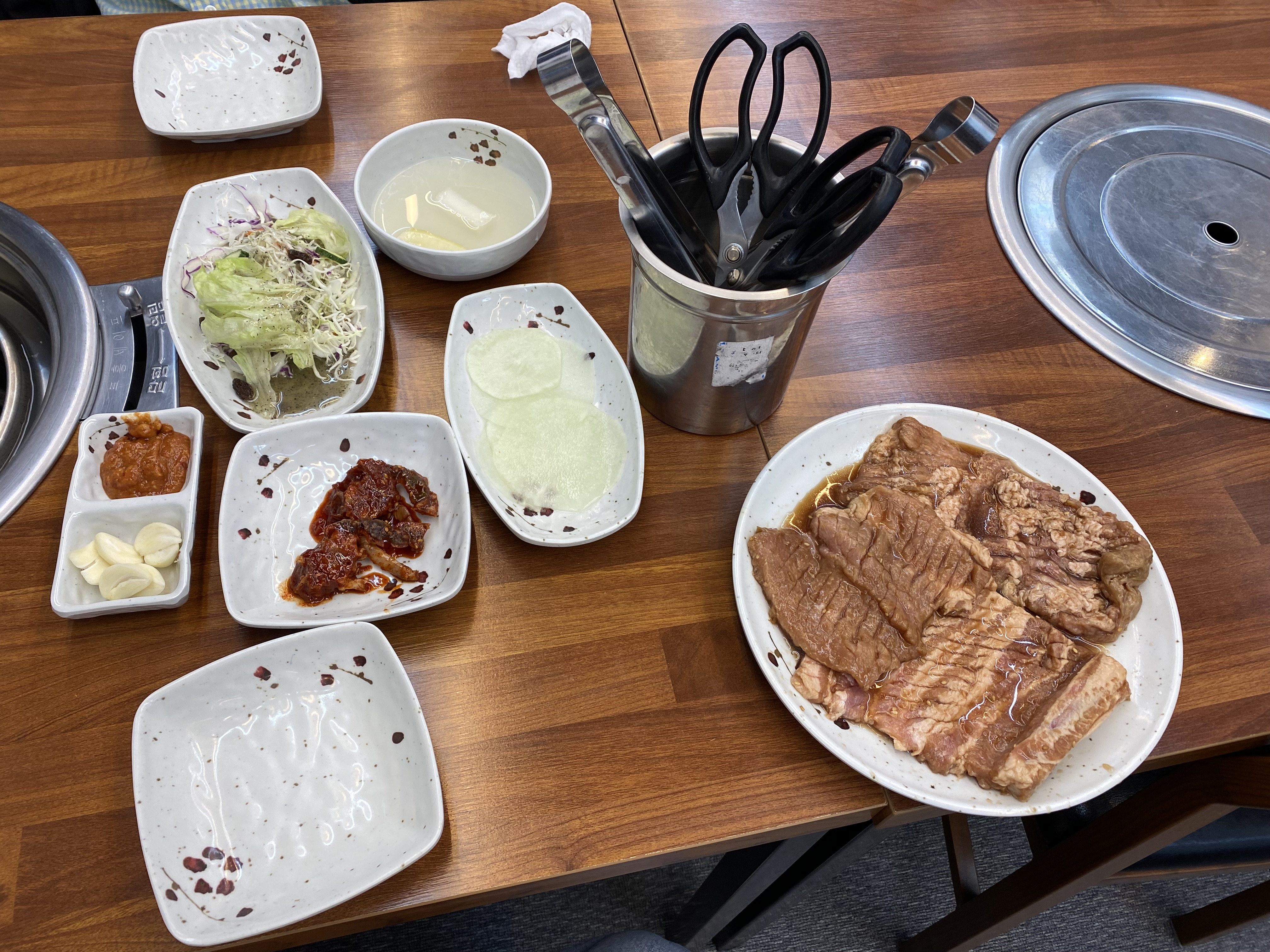 기본 상 차림이 준비되고 고기도 함께 나옵니다. 기본 상 메뉴 크게 기대를 안 했는데 고기 먹기 전 샐러드만 세 접시를 먹었습니다. 소스가 심하게 달거나 하지 않고 제 입맛에 착 감기는 게 너무 맛있어 쥔장님께 물어보니 샐러드 소소를 직접 만드신다고 하네요. 와이프님이 무슨 샐러드를 세 접시나 먹냐고 핀잔을 주는데 넘 맛있어서 맛보라고 한입 줘봤더니 와이프님도 엄지척하면서 수긍을 하더군요. 샐러드뿐만 아니라 기본 상차림 메뉴가 전부 다 깔끔하고 맛이 좋아 고기와 함께 먹는데 식욕을 업 시켜 줍니다.