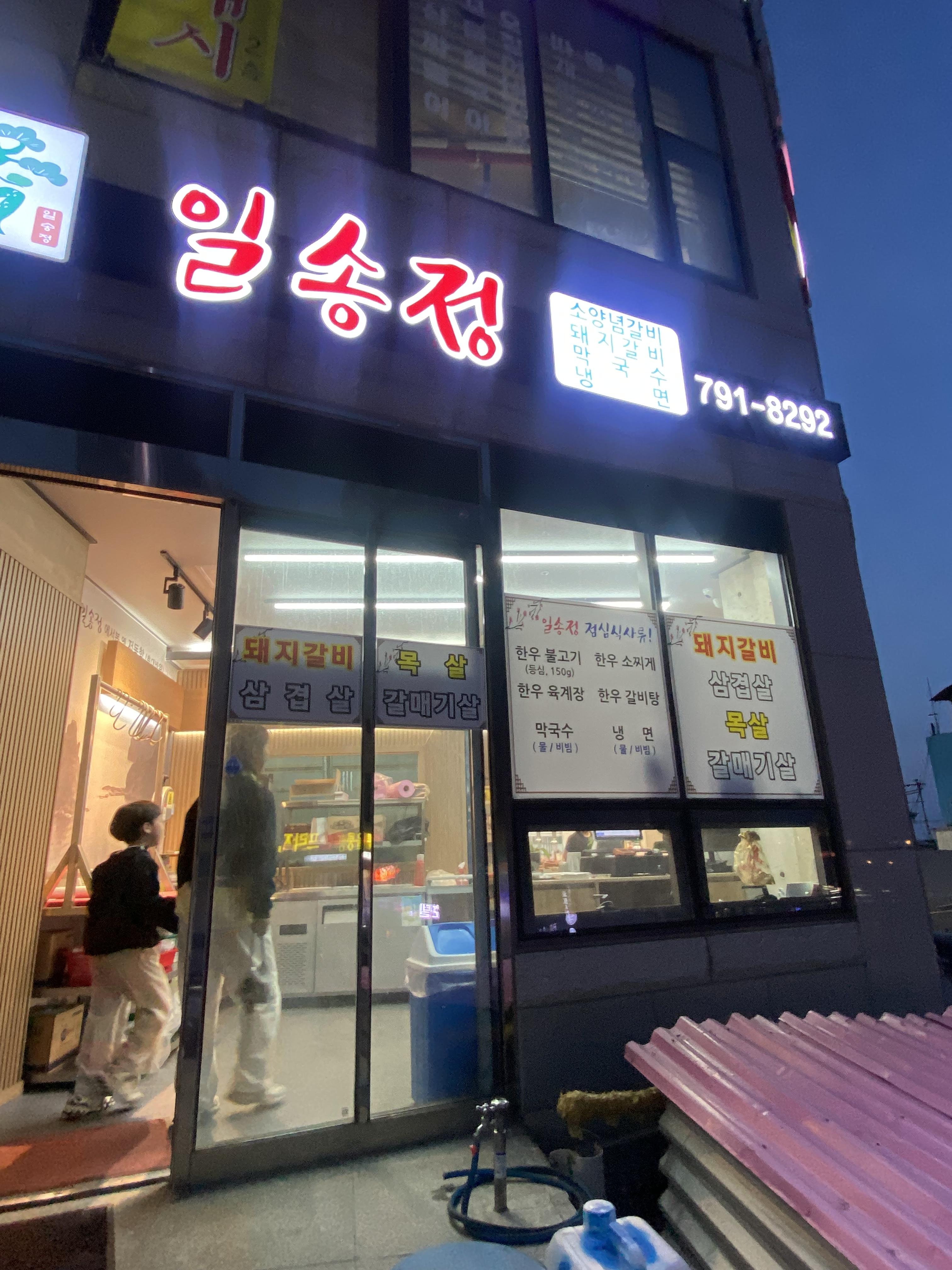 다온프라임 호텔에 체크인하고 짐을 풀고 나서 밀려오는 피곤과 쏟아지는 잠을 깨끗하게 샤워로 한방에 날려보냅니다. 역시 여행 피로는 일단 샤워로 싹 씻어줘야 컨디션이 올라온다니께요~^^ 그러고 나니 급 체력 방전에 시장기가 돌더니 너무너무 배가 고프면서 정신이 나갈 거 같은 메가톤급 피곤이 어깨를 짓누르더군요. 원래는 저녁을 간단하게 편의점 같은데 가서 한 끼 때우려 했으나 너무 힘든 일정을 소화했던 터라 아들이 무조건 고기!!!라며 강조합니다. 평일 저녁인데 저동항은 일찍 잠잠해지면서 조기 영업 마감 분위기라 맛집 찾아 돌아다닐 분위기가 나질 않습니다. 그래서 고깃집 검색해 보니 호텔 바로 앞 상가에 '일송정' 고깃집이 검색 됩니다.