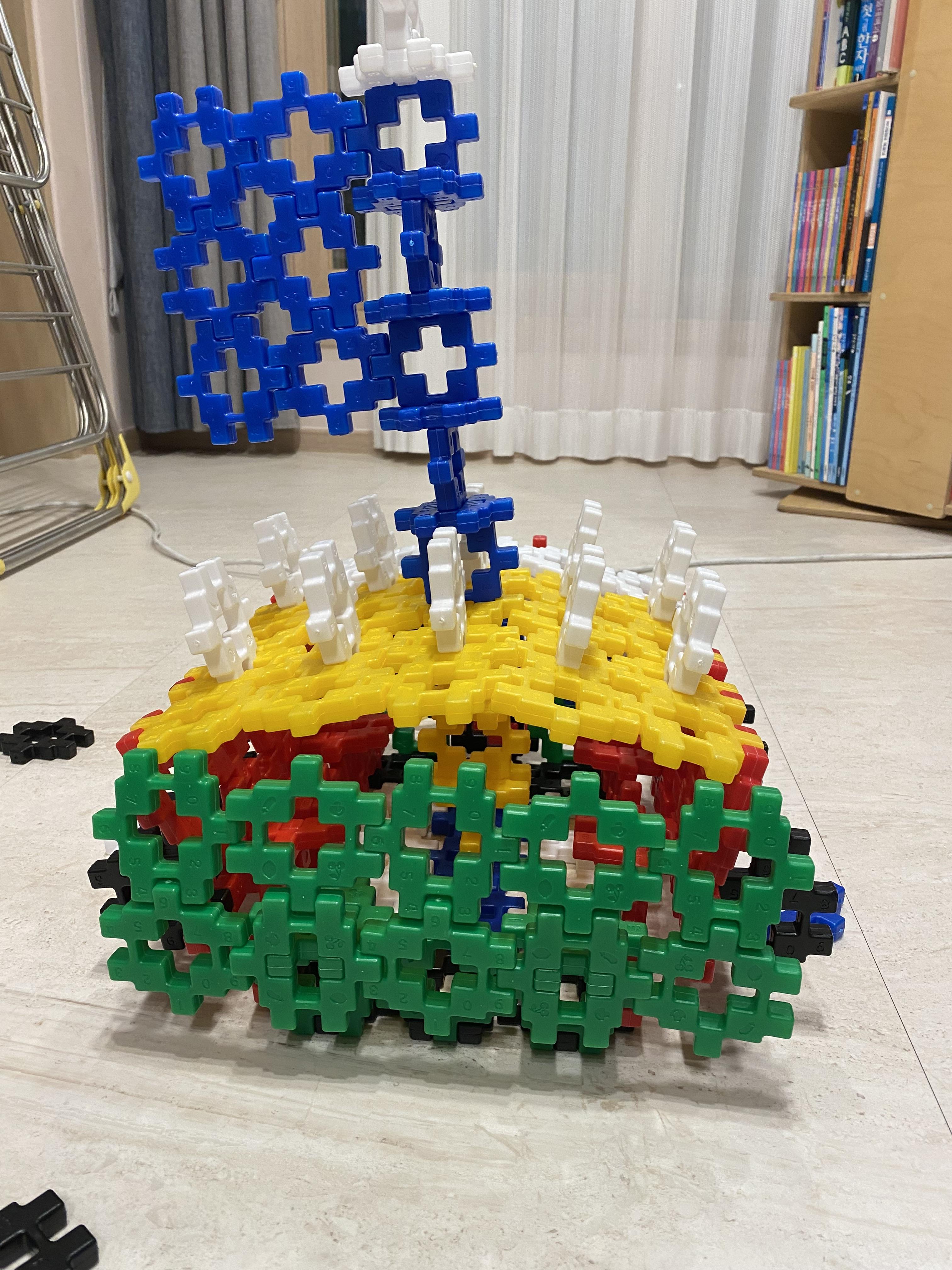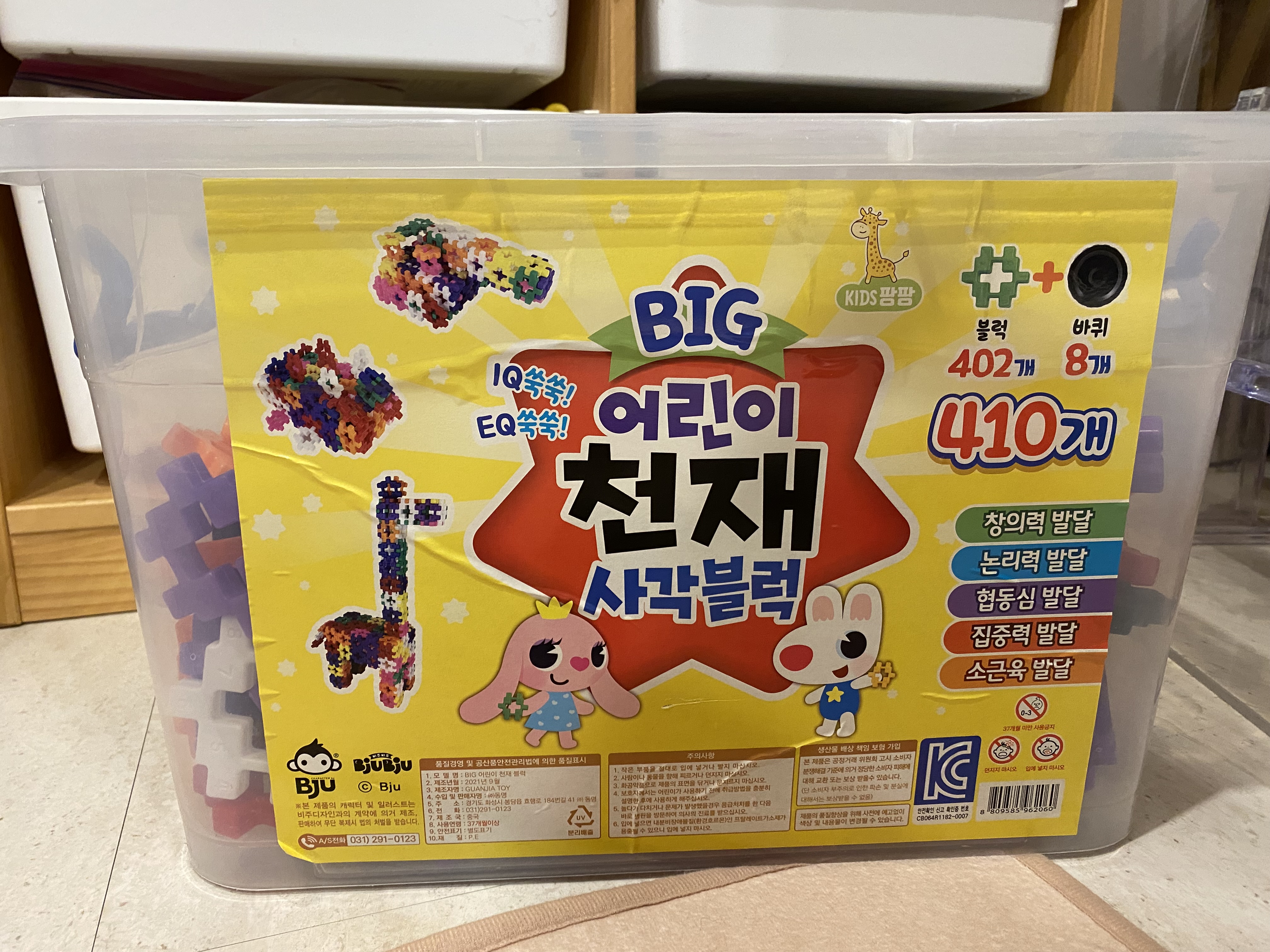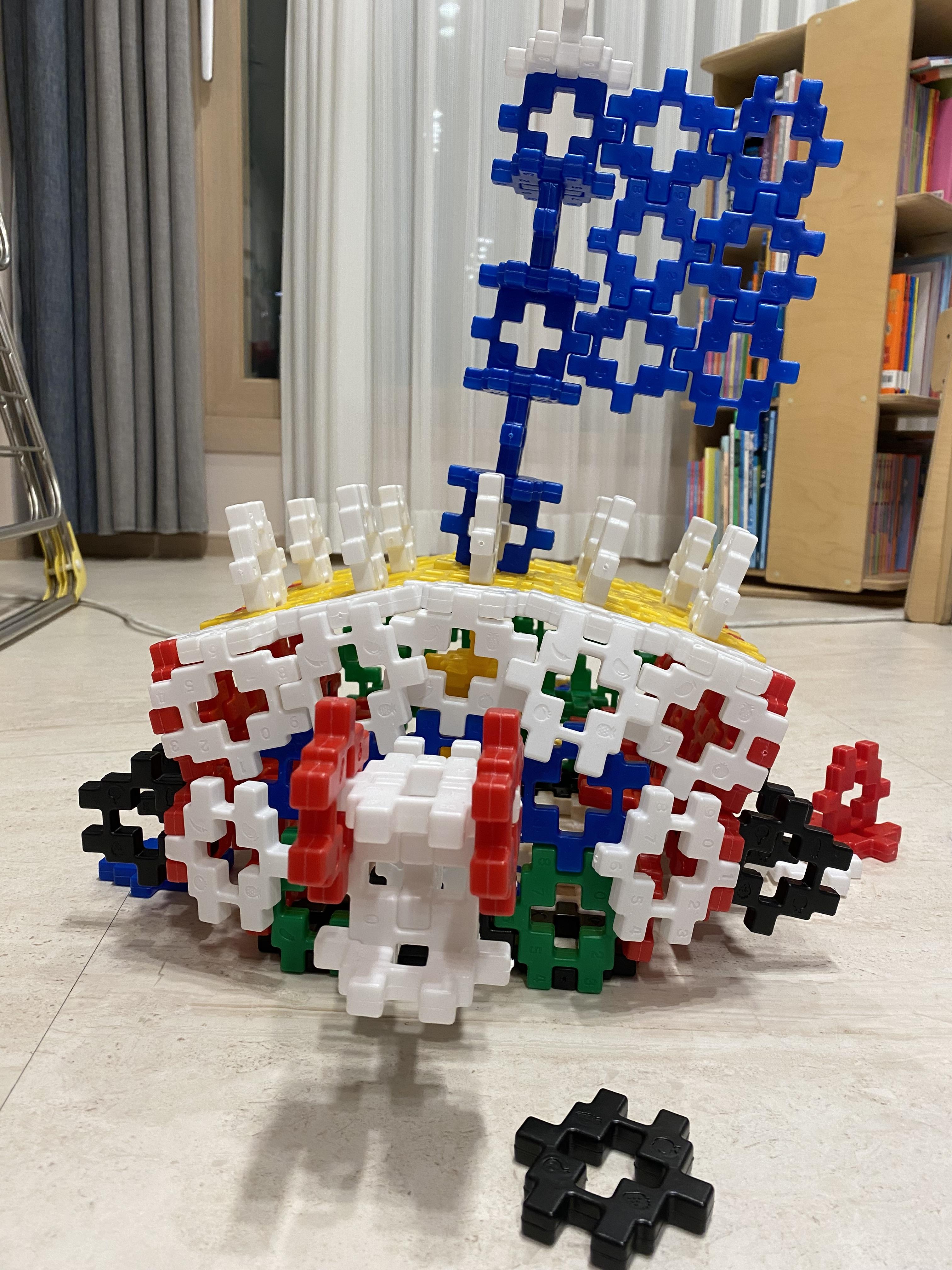 저희 집은 거실 쇼파 뒤 공간이 아들 놀이터인데 거기엔 다양한 놀이 물건들이 있습니다. 레고블럭, 색종이, 책, 총, 무기, 그림 그리기 재료, 종이접기로 만든 다양한 것들, 박스로 만든 다양한 것들 등등 그야말로 아들 최애 장소 중 하나인데 그중에서 아들 6살 때 아빠한테 첨으로 천재 블럭을 사달라고 요청해서 바로 쿠팡에 주문해 준 가장 오래 가지고 놀고 있는 '키즈팡팡 BIG 천재블럭(410p)'이 있습니다. 그 천재블럭을 가지고 그렇게 한참을 만들며 완성시킨 엄빠눈에는 기가 막힌 작품(?) 소개하는 시간을 가지려고 합니다.^^