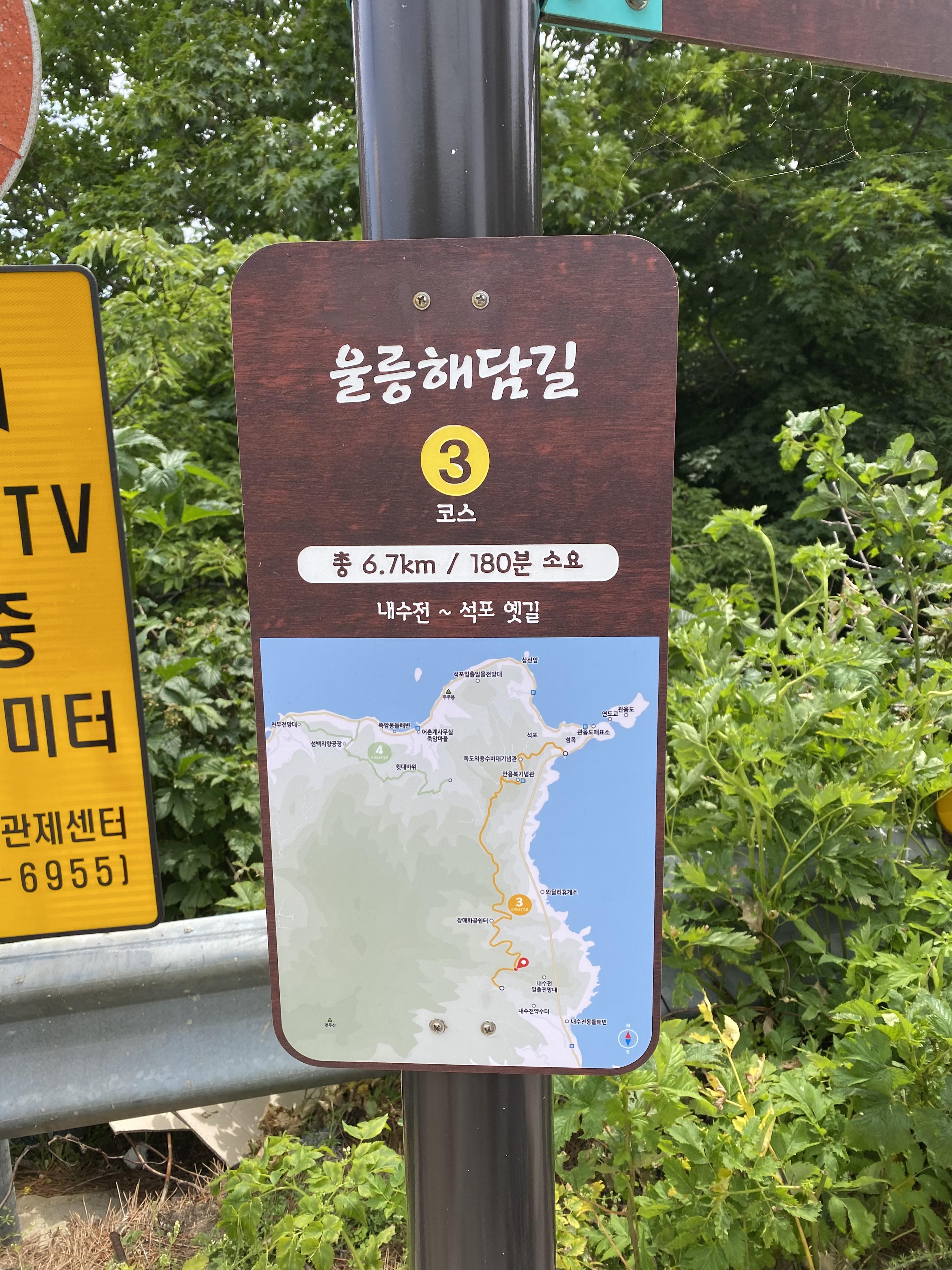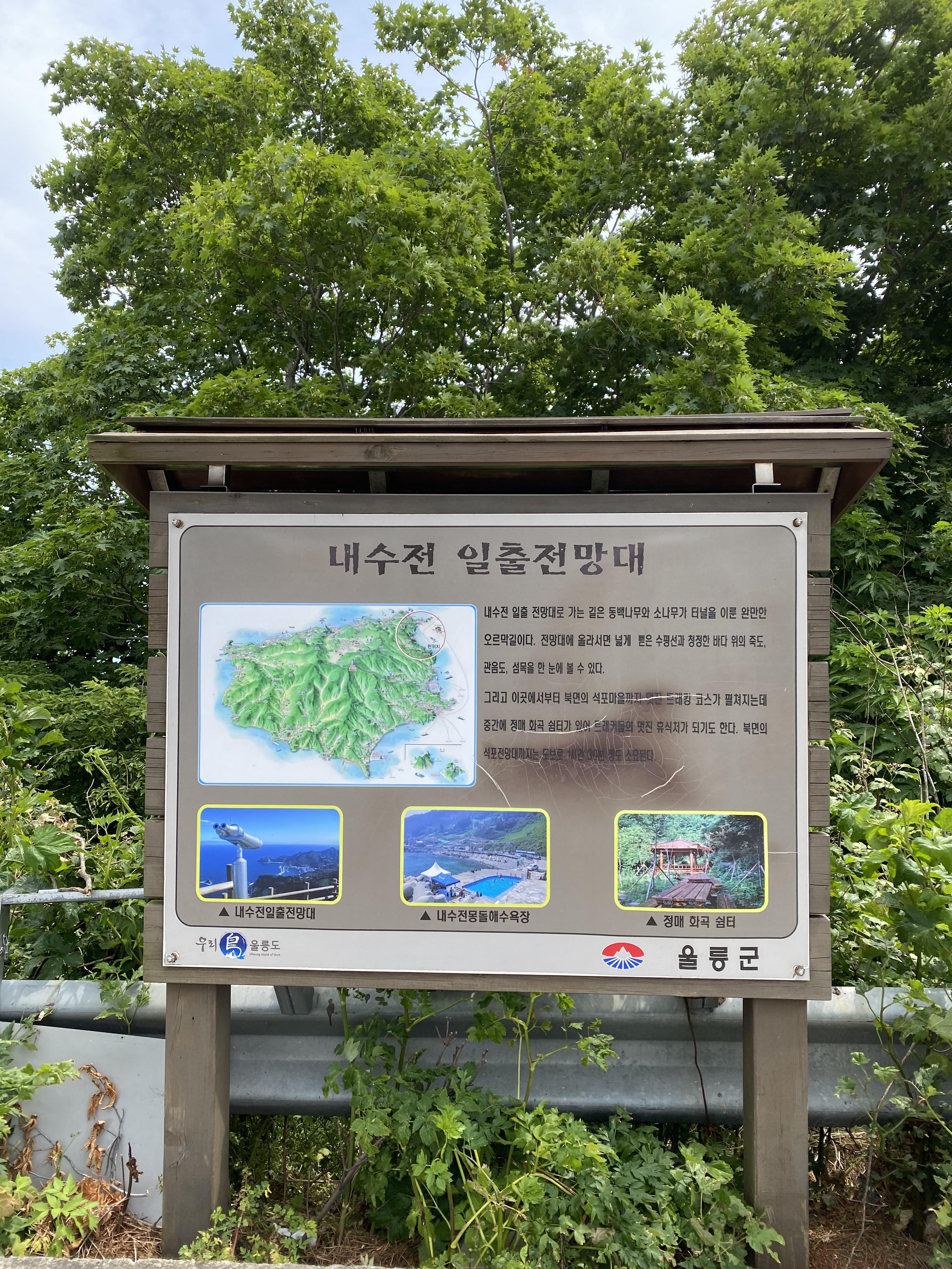 저동항 울라웰컴센터하우스에서 기대했던 거보다 더 좋은 정보를 많이 얻은 다음 둘째 날 울릉도 탐사는 어디로 가볼까 고민하다가 울릉도 북부지역을 쭉 한번 보면서 관음도와 나리분지 두 군대는 꼭 가보기로 방향을 잡고 울릉 순환로를 타고 북부로 올라갑니다. 그러다가 갈림길에서 카톡 네비를 잘못 보고 우연히 산길 쪽으로 방향을 잘못 잡았는데 올라가다 보면 유턴 구간 나오겠지~ 하다가 길 끝에 도착하고 보니 글쎄 내수전 일출전망대 주차장입니다. 울릉도는 길이 좁아서 마음대로 불법 유턴했다간 사고 나기 십상이라 안전운전을 꼭 하셔야 해요!!!