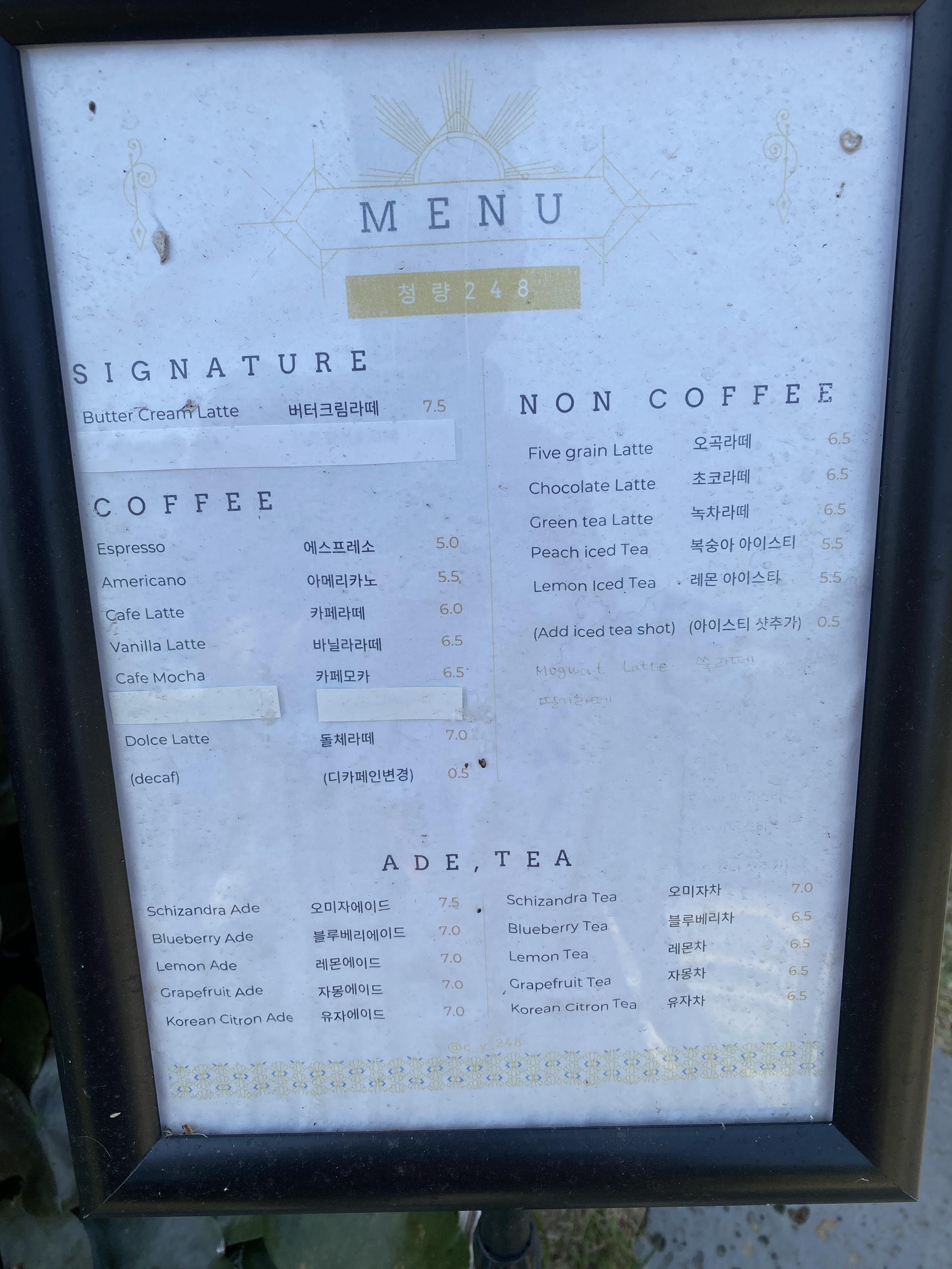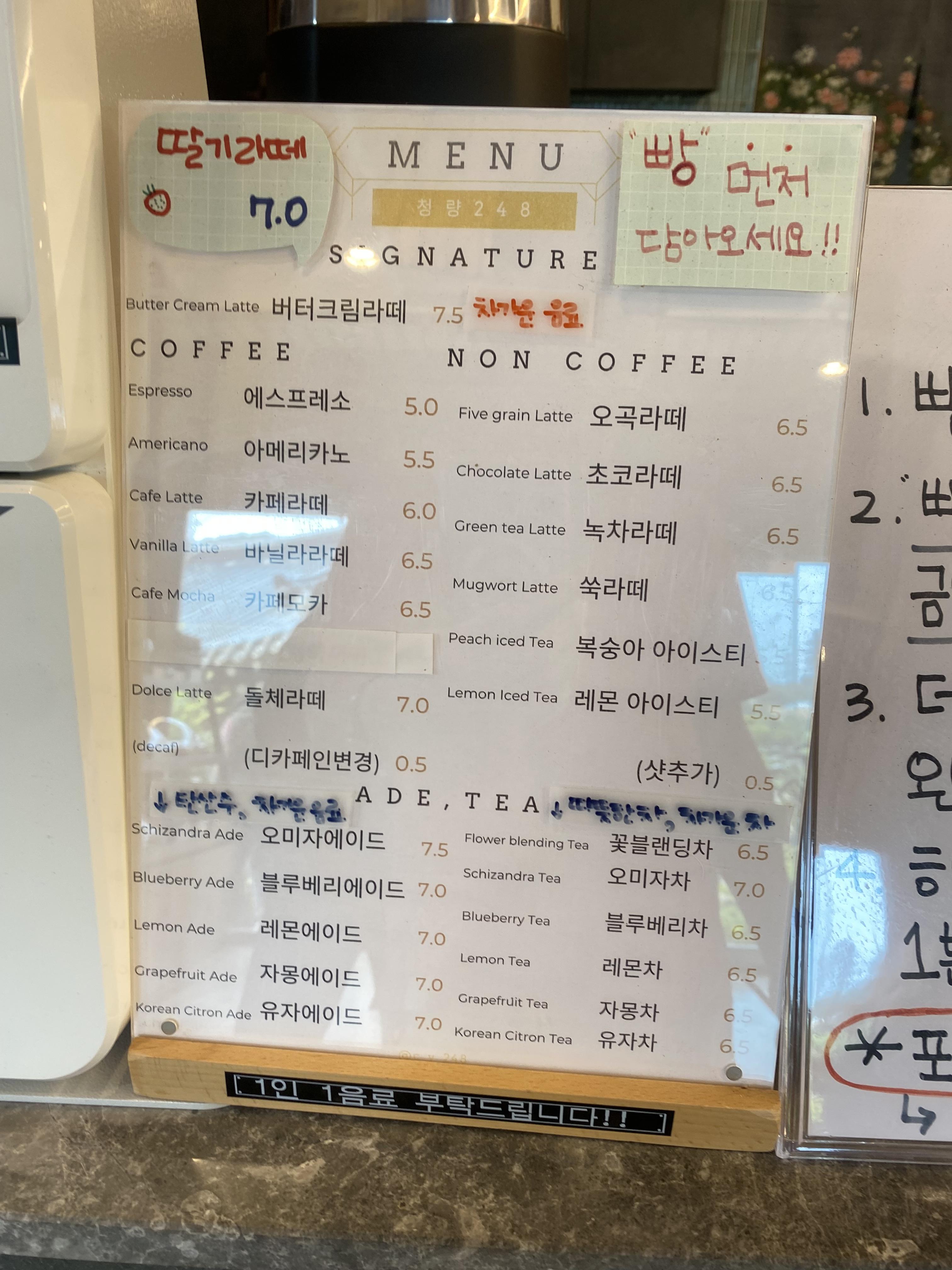 그럼 지극히 개인적인 입맛 기준으로 청량 248 카페 후기를 적어보자면 팥빙수는 일단 팥이 직접 삶은 건지는 모르겠으나 의외로 많이 달아서 슴슴한 맛을 선호하는 저희들에겐 아쉬운 팥빙수였달까요? 양은 합격인데 연유가 너무 많이 들어있었나? 팥이 달았나? 결론은 연유도 단맛을 더했고 팥도 달아서 달달한 팥빙수 선호하시는 분들께 추천하는 메뉴입니다. 시그니처 아이스 터키커피는 원두를 터키산으로 사용해서 시그니처인지는 모르겠으나 맛이 연해서 혹시라도 아이스 터키커피 주문하실 분들은 샷을 추가해서 드시는 걸 추천합니다. 요것도 좀 아쉬웠네요. 빵은 음.... 다 달아요. 특히 코코넛크림 케잌이 많이 달았습니다. 거기다 파운드케잌 타입 중에서 쇼트닝이 많이 들어가서 그런지 눅눅하고 진득한 느낌의 빵이라 요런 타입은 제가 별로 안 좋아해서 결국 반만 먹고 포기!
