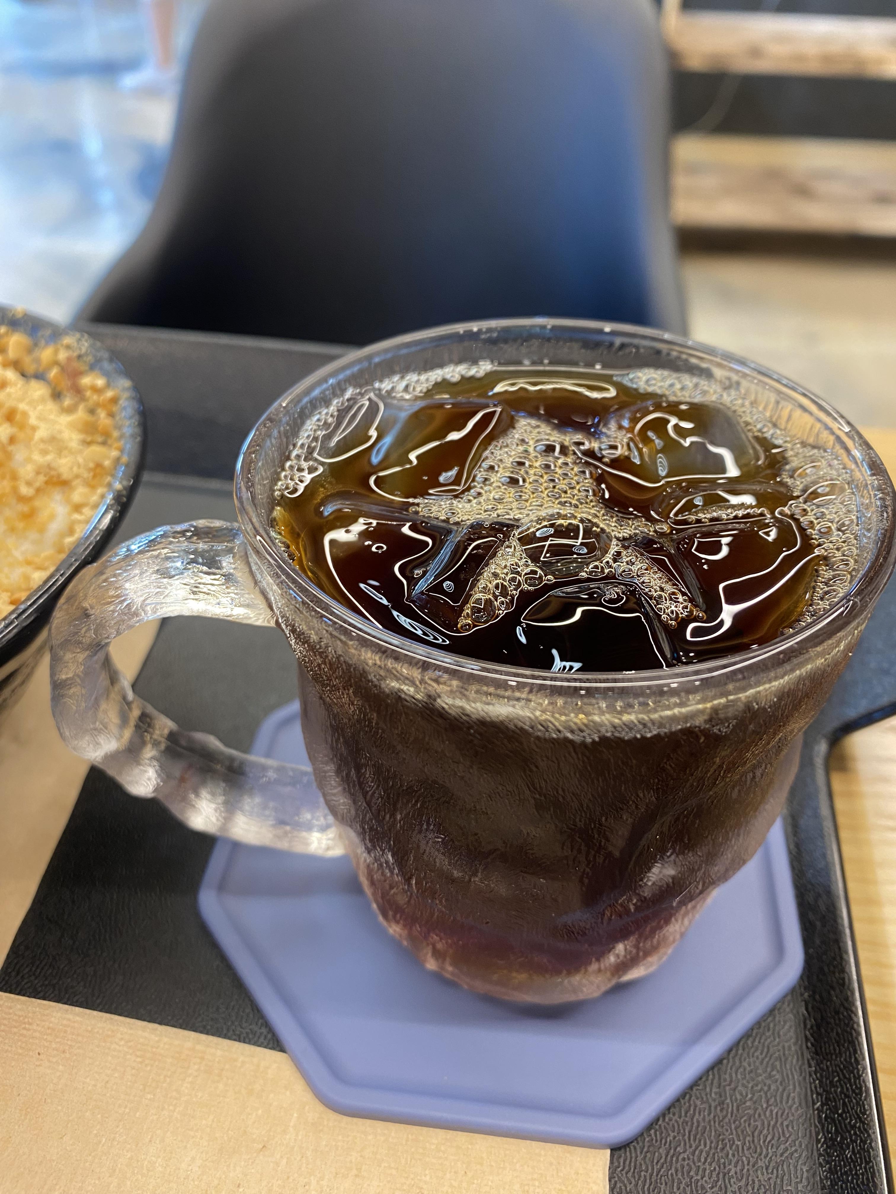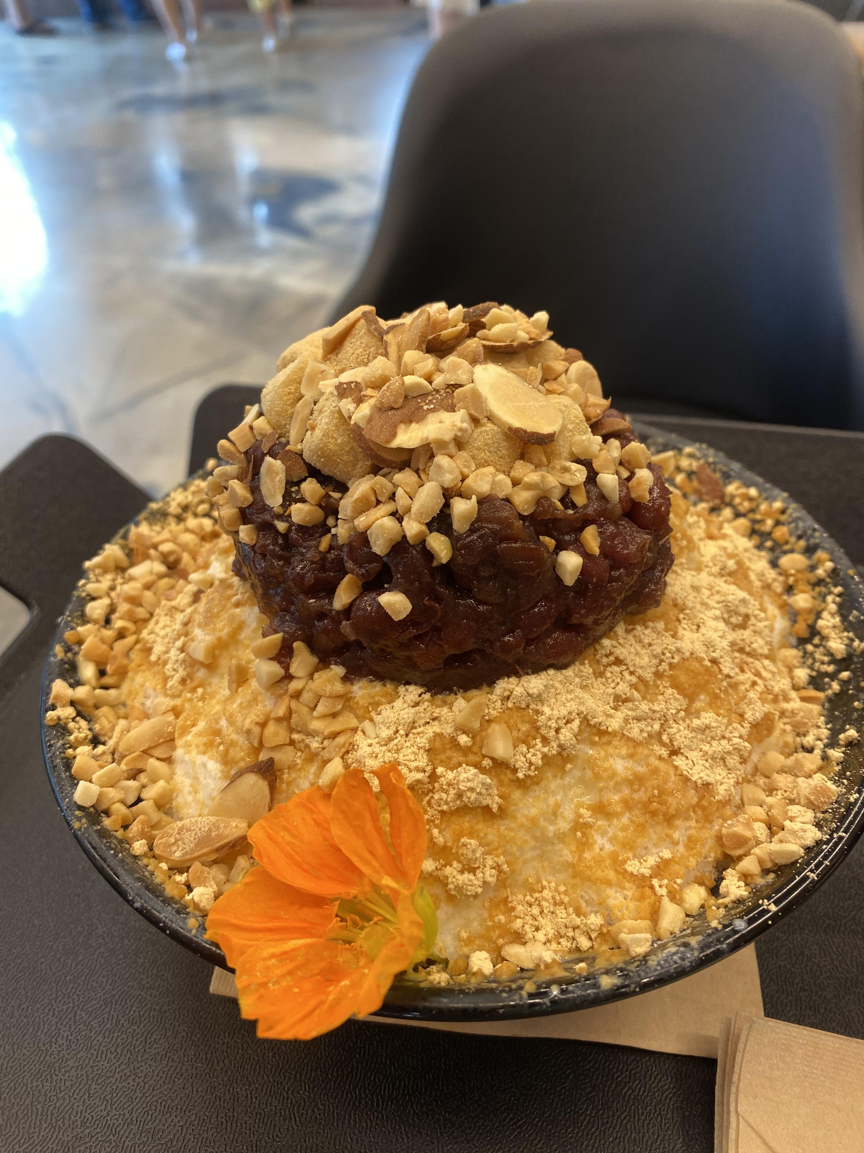 인절미 팥빙수가 나왔는데 데코로 장식한 이름 모를 생화가 너무 예뻐서 팥빙수 먹기가 미안하더군요. 그리고 커피는 청량 248 시그니처 아이스 터키커피로 한잔 주문을 했습니다.