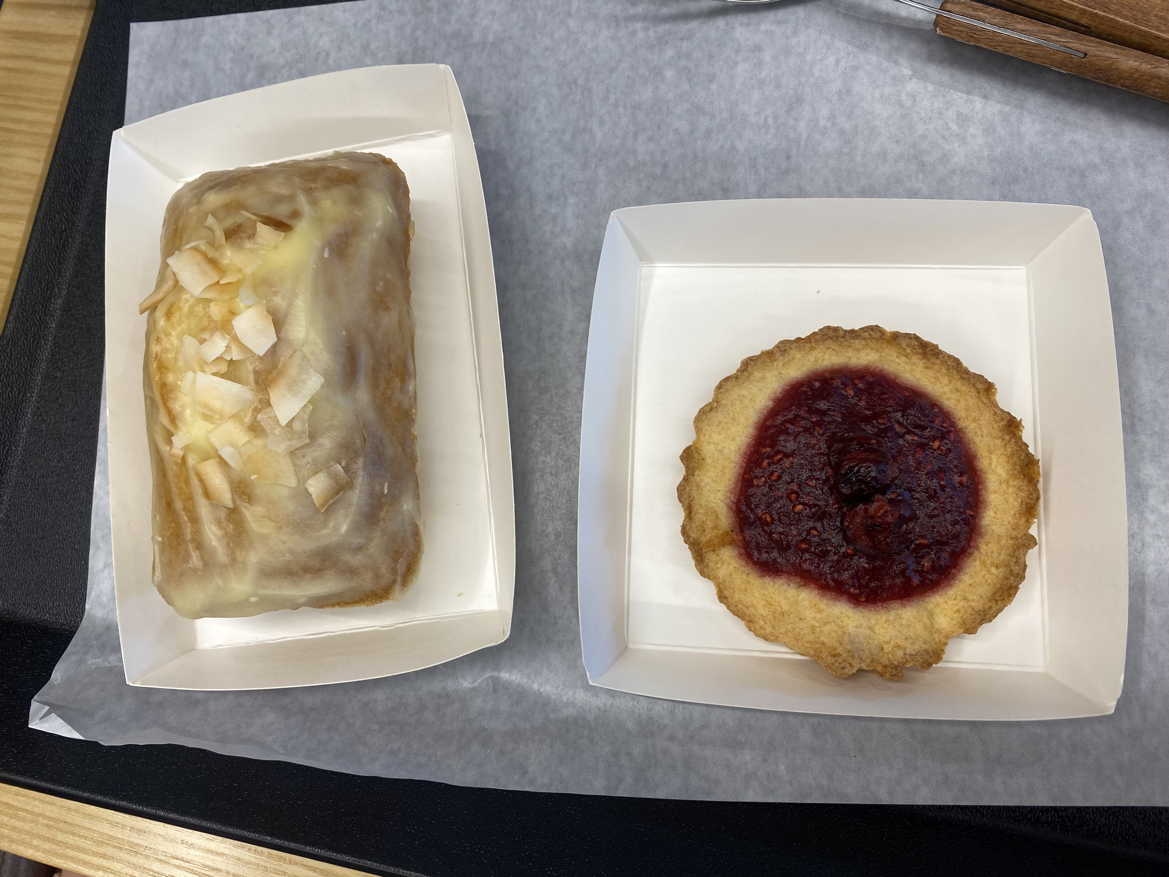 너무 많은 방문객들로 빵은 그나마 입맛에 맞을 거 같은 걸로 선택을 해봤습니다. 왼쪽은 코코넛크림 케잌이고 오른쪽은 일종의 타르트 같은 종류였습니다.