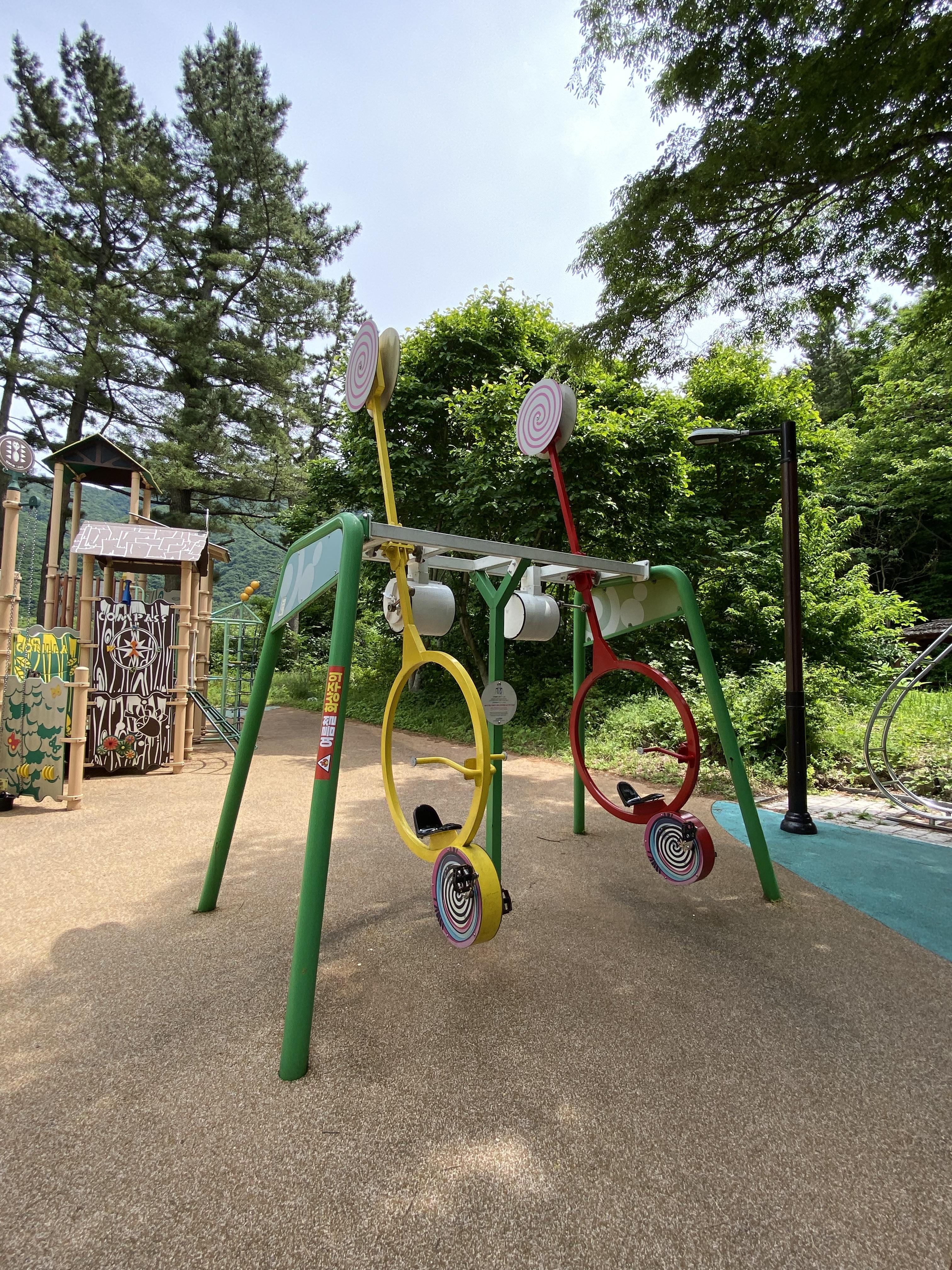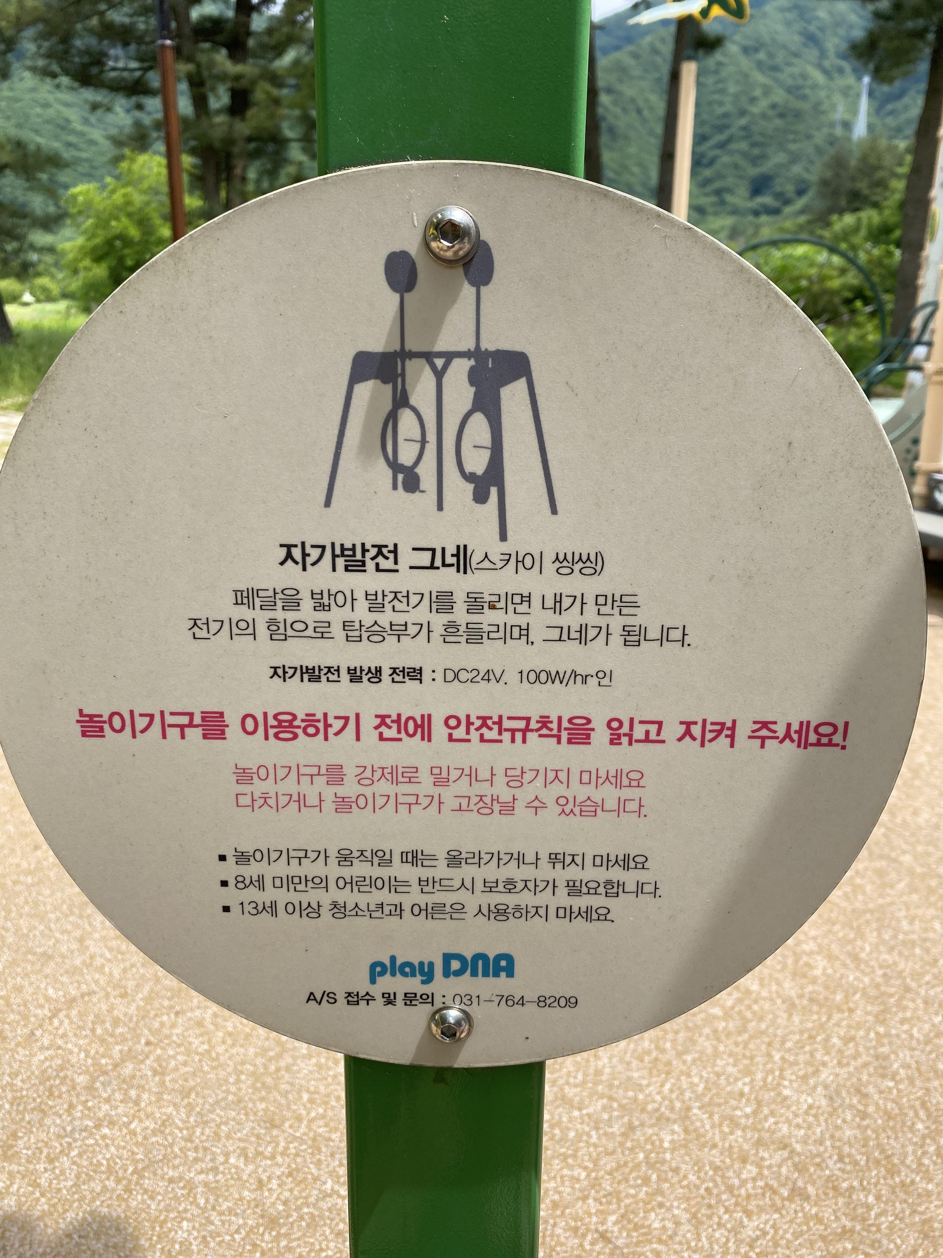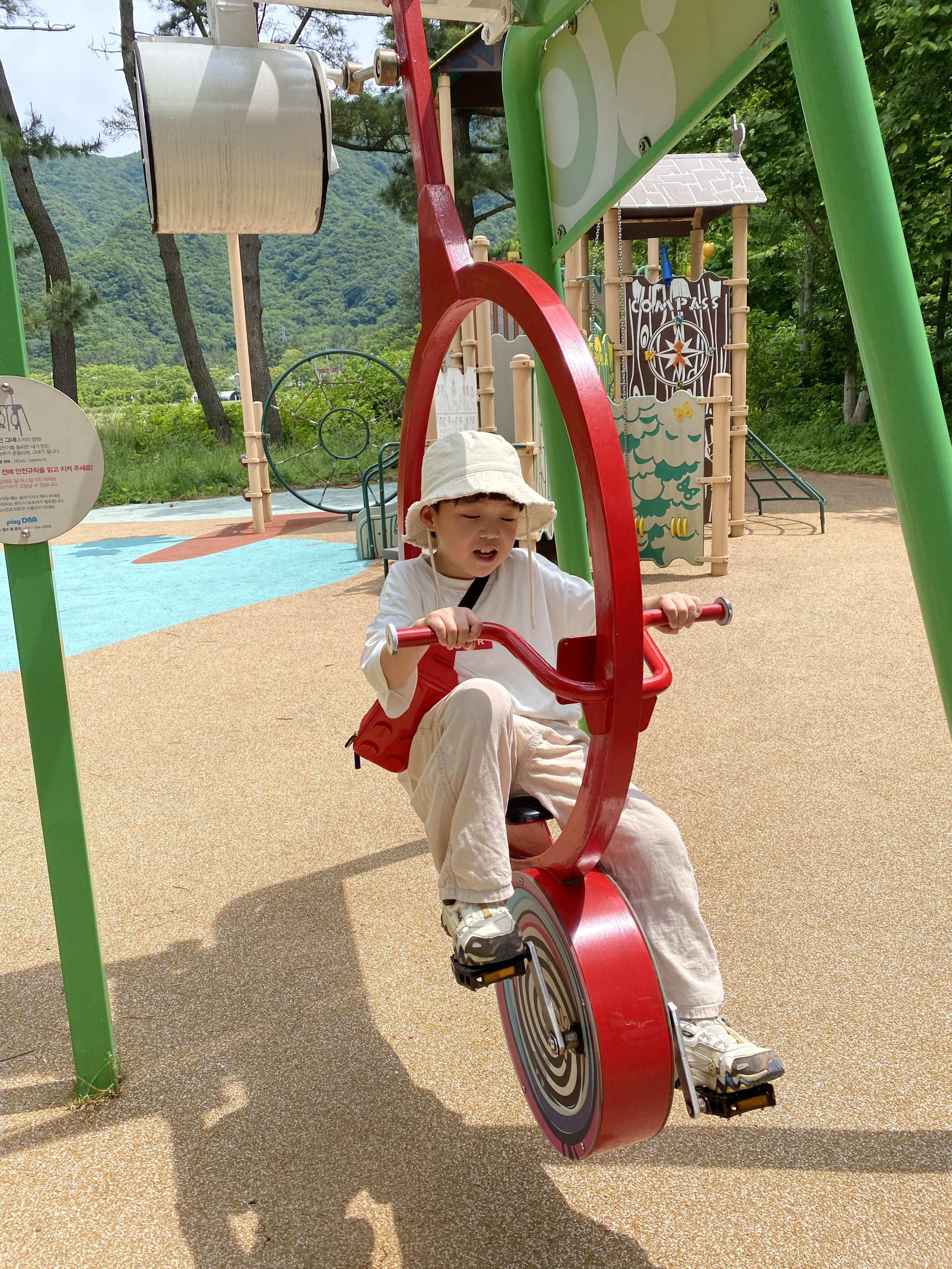 이곳을 소개하기로 맘먹은 가장 큰 이유는 바로 요 놀이 기구 때문에 그렇습니다. 명칭은 자가발전 그네라고 되어 있는데요. 페달을 밟아 발전기를 돌리면 앞뒤로 움직이는 그런 그네인데 저도 이런 그네는 생전 처음 보는 기구라 무척 신기했는데 아들은 어느 정도였을까요? 당연 처음 겪어보는 자가발전 그네가 무척 마음에 들었는지 한참을 그곳에서 떠나질 않습니다.