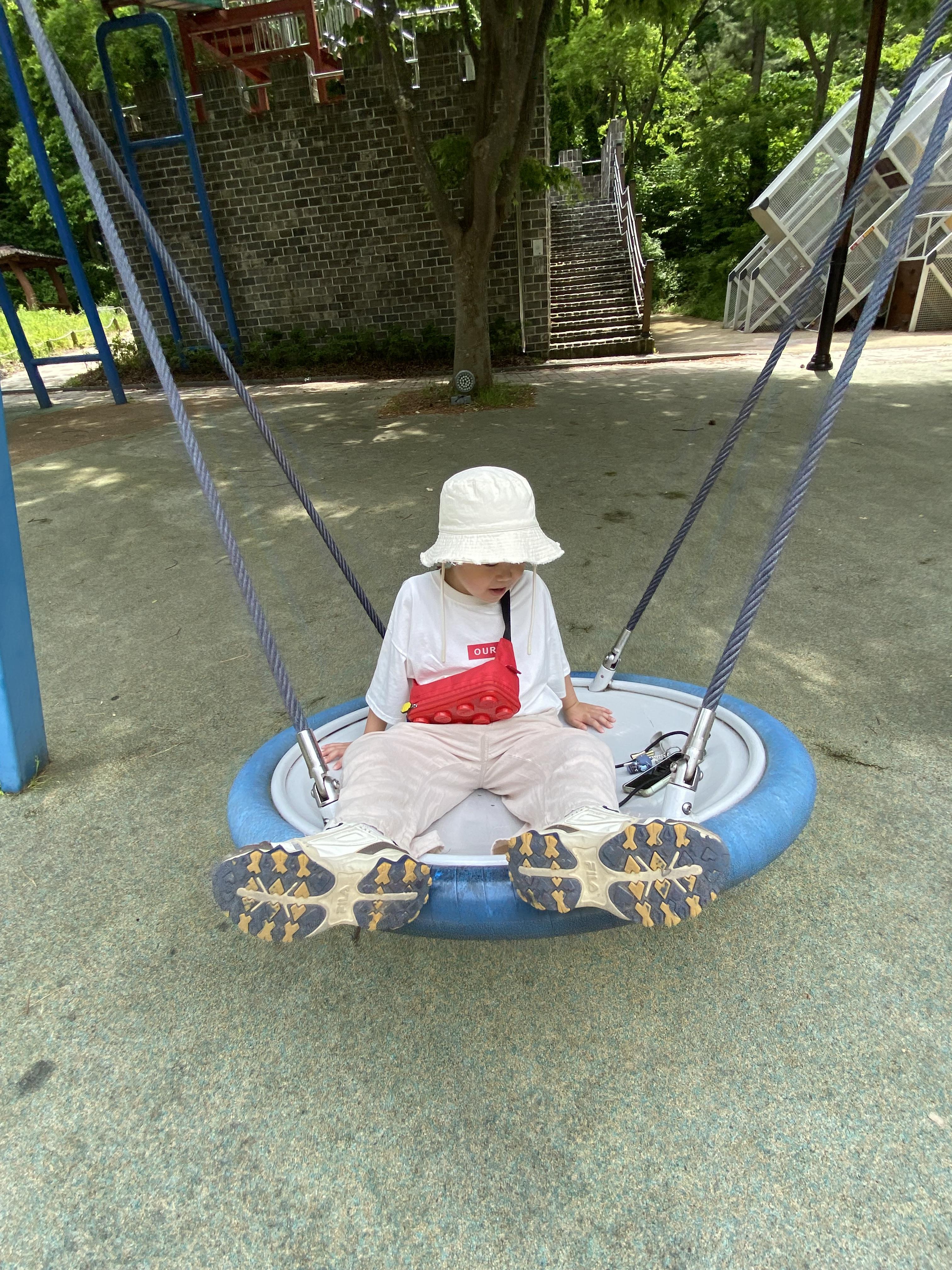 놀이터 시설이 굉장히 넓고 다양한 놀이 기구들이 마련되어 있어서 아이들이 무척 좋아할 거 같았는데 생각보다 어린아이들과 함께 온 가족이 몇 팀 안되었습니다. 그래서 자연스럽게 놀이터는 아이들과 어른이 함께 공존하는 쉼터 겸 놀이터로 운영이 되고 있었는데 우측 사진에 좀 특이한 그네가 있는데 여기 어른들이 편히 누워 잠시 쉬는 휴식 공간으로 활용이 되더군요.