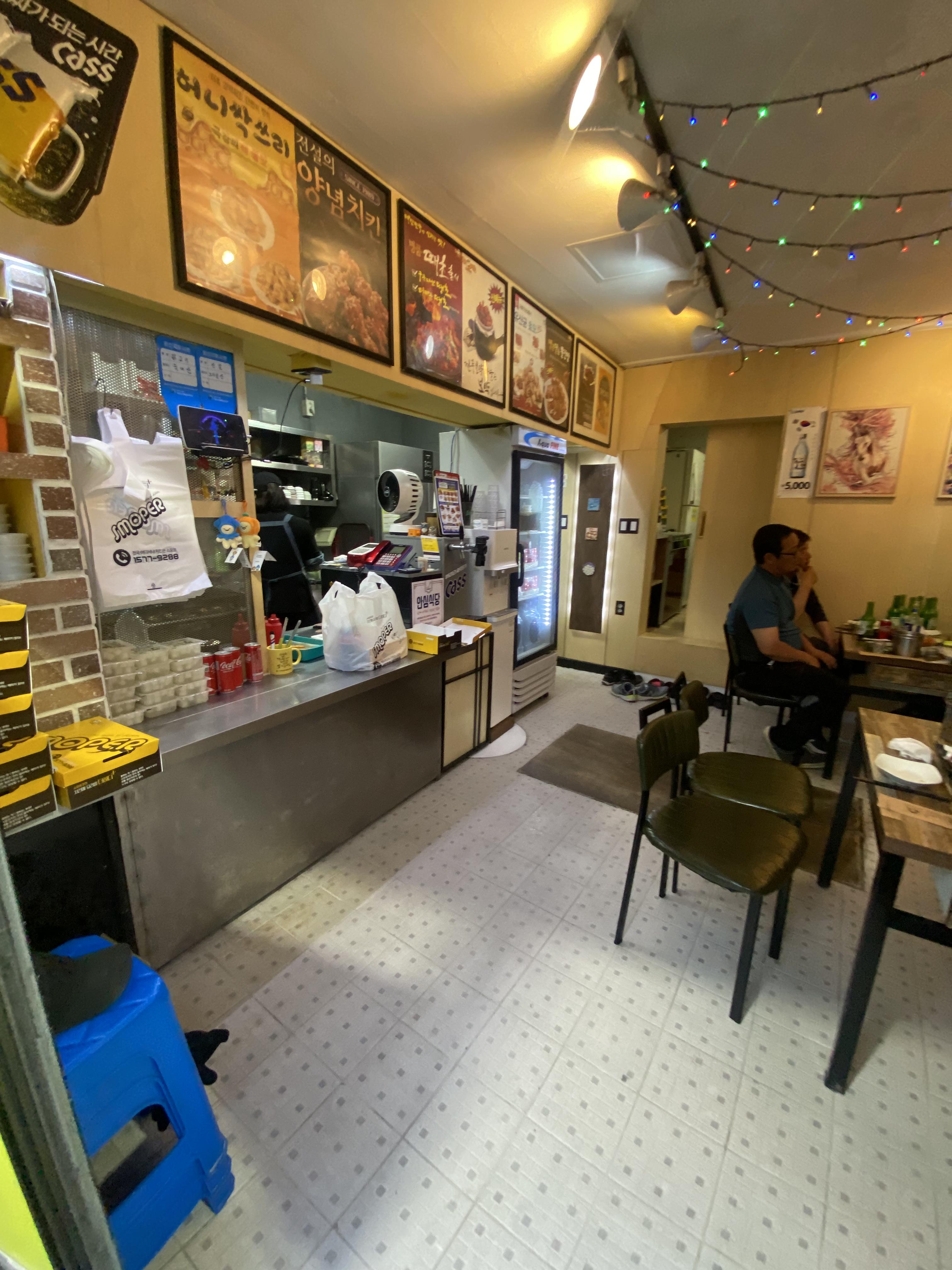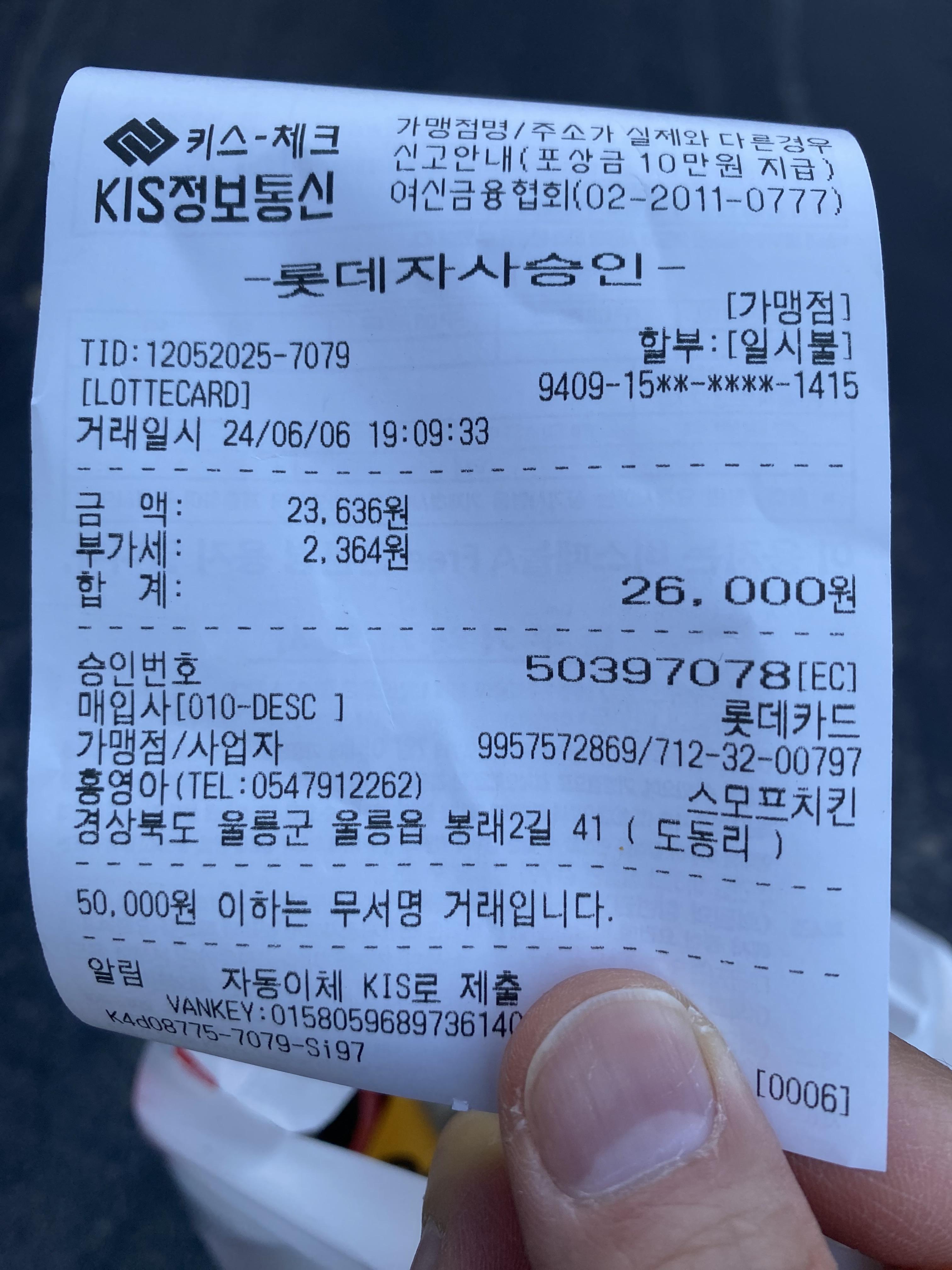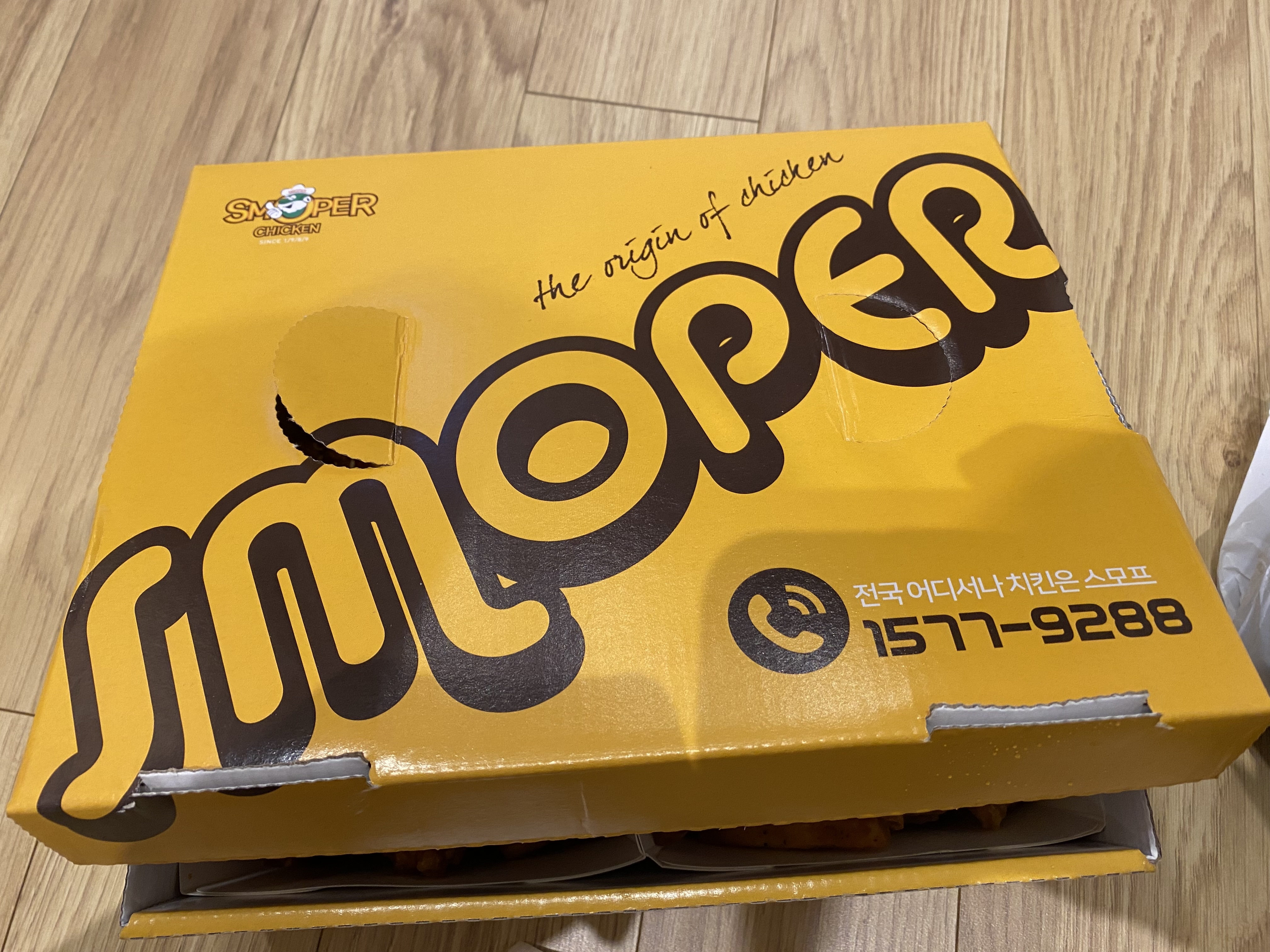 울릉도 저동항에서 마지막 하루가 끝나고 있는데요 그 마지막 밤 만찬을 즐기기 위해 하루 종일 투어 다니느라 고생한 아들에게 조그마한 선물 같은 음식을 주문했습니다. 초2 아들에겐 최애 음식 중에 하나인 치킨인데요, 저동항 호텔에서 가장 가까운 인근에 있는 치킨집으로 그냥 선택을 했지요. '스모프치킨'되겠습니다. 전화주문으로 가장 빨리되는 메뉴를 선택했고 치킨은 뭐니 뭐니 해도 후라이드/양념 반반 아니 긋습니까? 요걸 딱 먹어봐야 치킨집 맛집인지 아닌지 바로 알 수 있는데요 30분 걸린다고 알려줍니다.