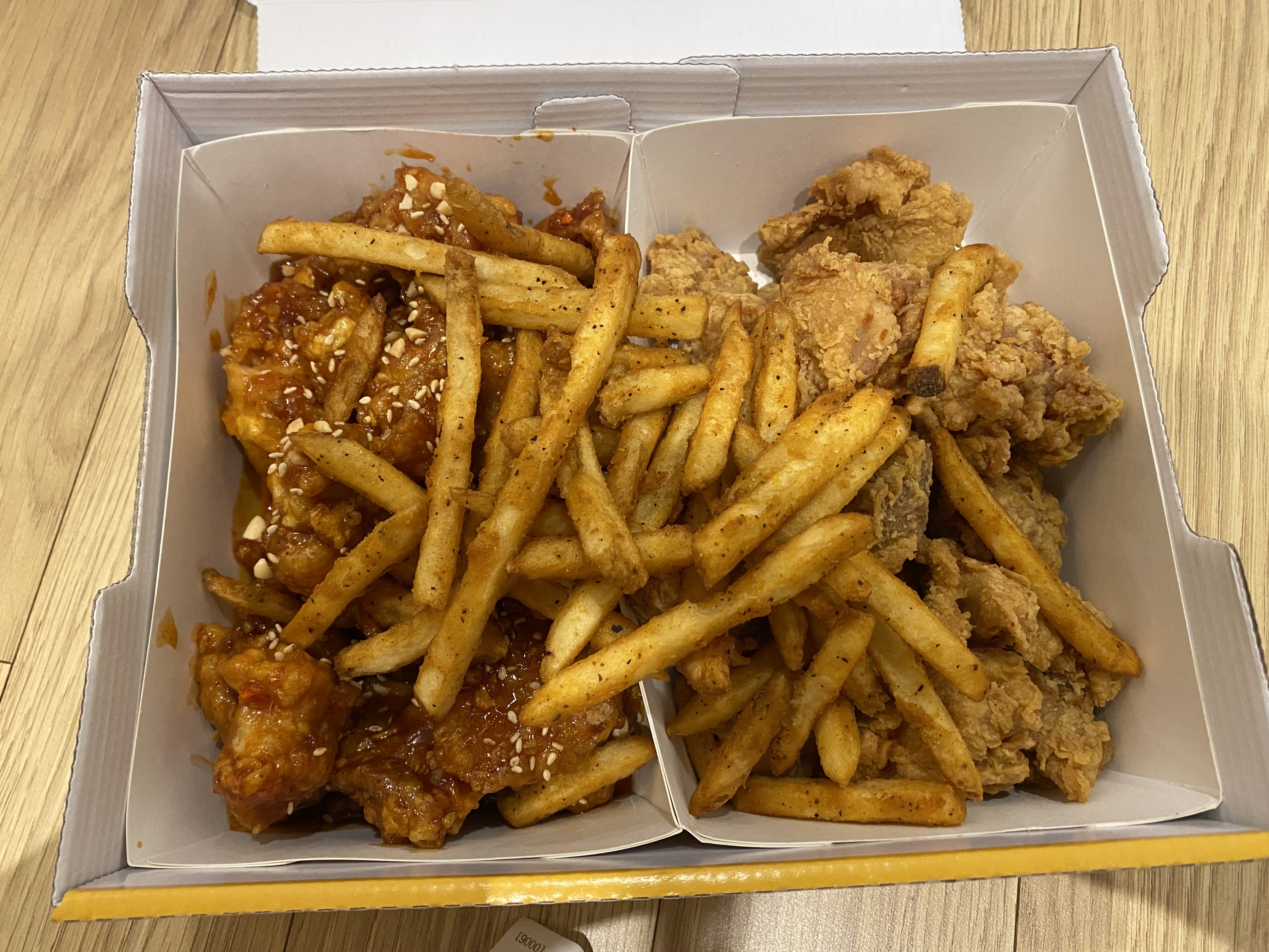 저는 부랴부랴 반반 치킨을 찾아왔고요~~ 숙소에 다시 복귀해서 8층 옥상에 올라가 저녁 만찬을 즐겼습니다. 스모프 치킨은 감자 후라이드가 같이 들어가 있어서 아들이 더더욱 좋아했던 거 같습니다. 후라이드는 바사삭, 양념은 초2 아들이 먹기에 딱 좋은 살짝 매콤달다구리한 양념치킨이었네요.