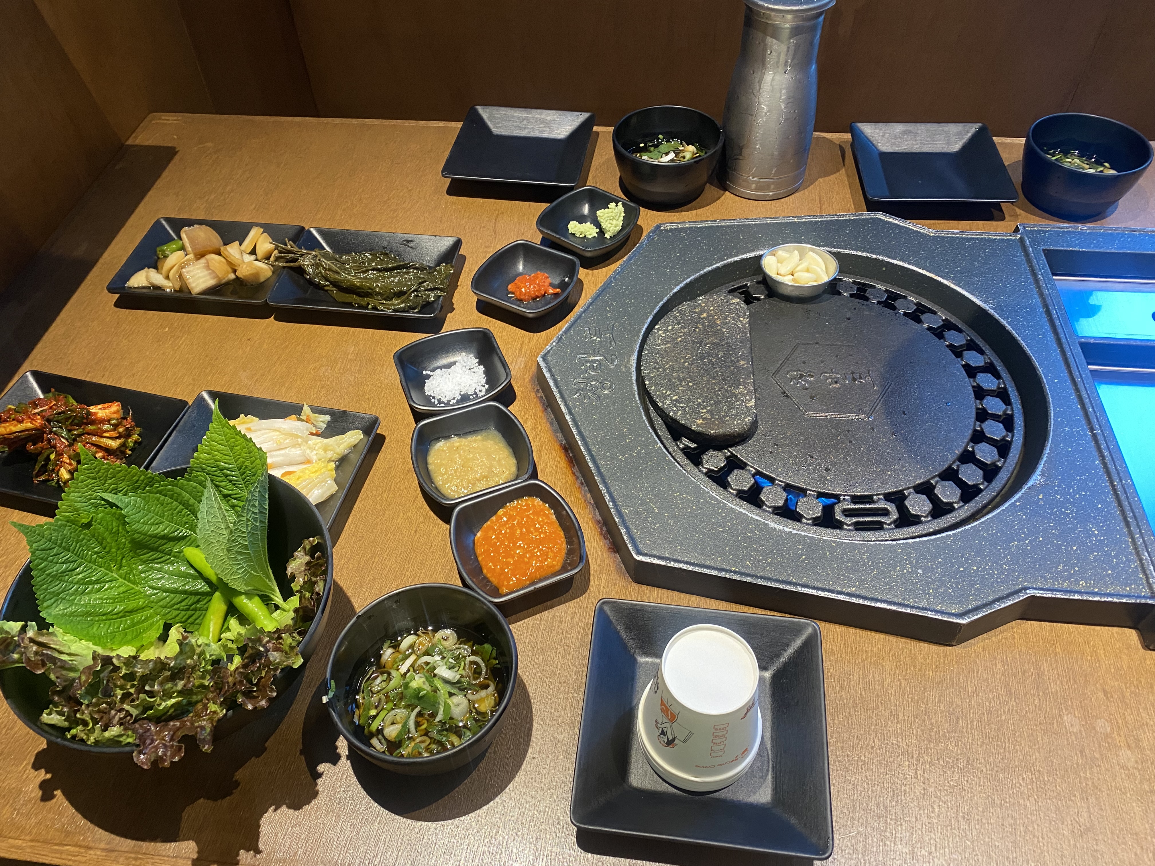 특이한 불판에 알차게 기본 찬들이 셋팅됩니다.