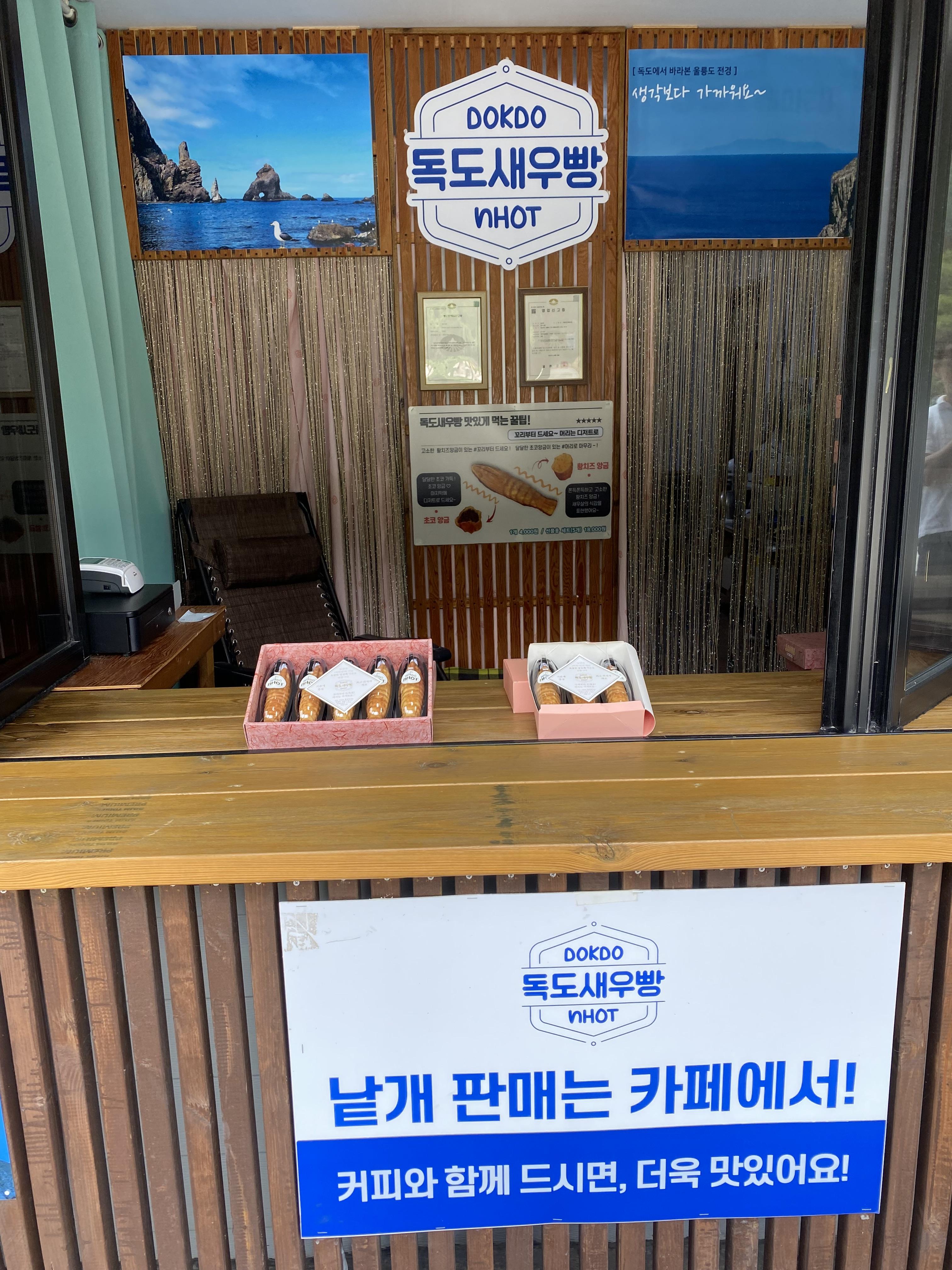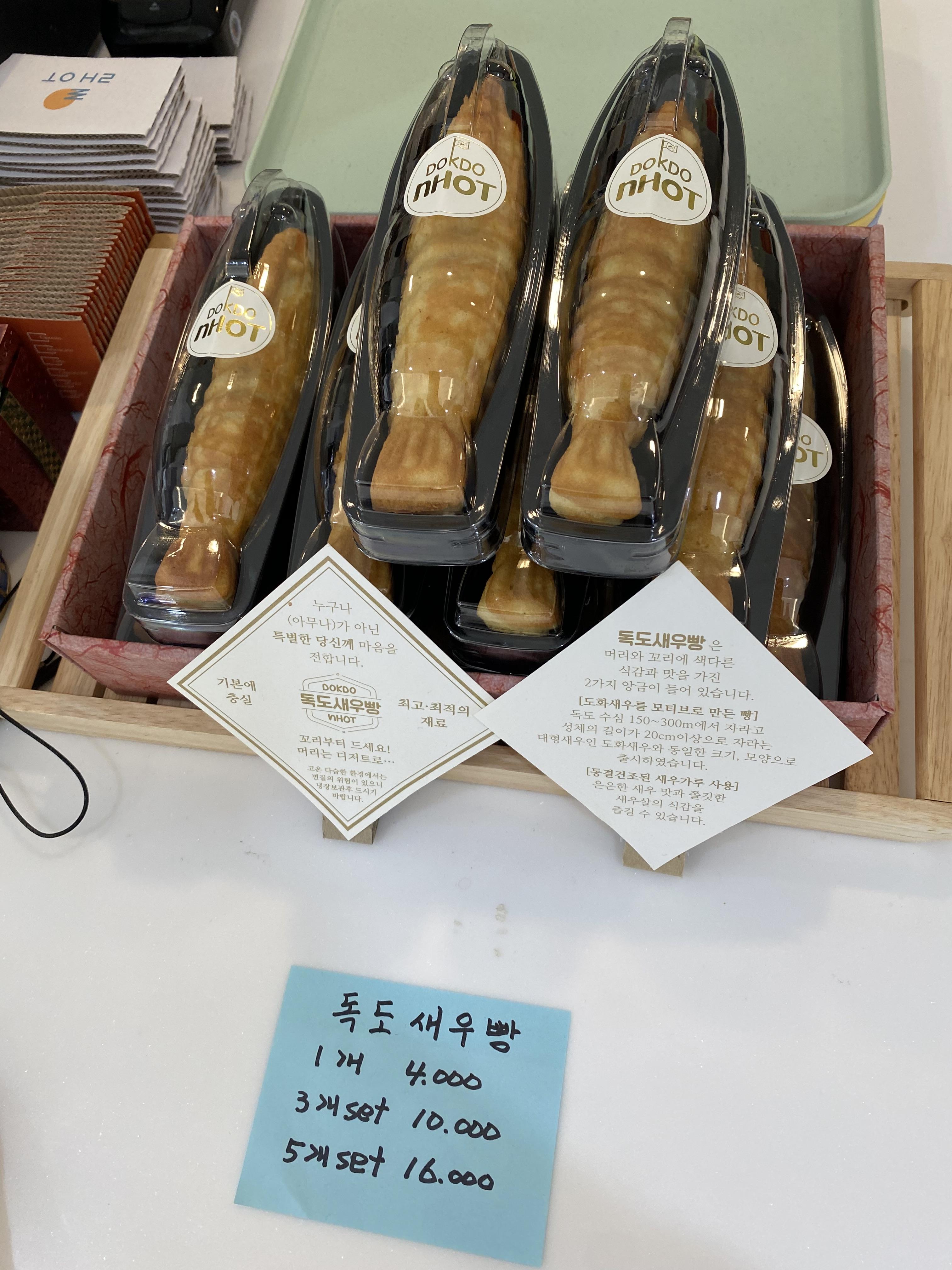 꼬리부터 먹으라고 해서 한입 맛봤습니다. 황치즈 앙금이 들어 있네요. 카페 한쪽에는 새우빵만 선물세트로 판매하는 곳이 있습니다. 맛은 말이죠~~ 지극히 개인적인 입맛으로 평가해 보자면 일단 저희는 초콜렛 맛있다고 찾아서 먹지는 않습니다. 그래서 머리 부분 초코 앙금이 들어있다고 하는데 거기 큰 기대를 하진 않았고요, 그저 꼬리 부분 황치즈 앙금 맛이 궁금했습니다. 도대체 얼마나 맛있길래 인스타에 올라와 있는 건지.... 결과는 일단 저희 집 입맛에는 안 맞는 걸로~ 까탈이 아들도 조금 맛보더니 바로 고개를 획~! 치즈 좋아하는 와이프님도 황치즈 맛은 별로였던 거 같습니다. 그럼 독도 새우빵이니 독도 새우가 들어가 있어서 새우 맛이 나느냐~ 폭신한 새우깡에 치즈랑 초코가 들어가 있는 맛이랄까요? 암튼 그랬습니다. 궁금하면 가보시는 걸로^^