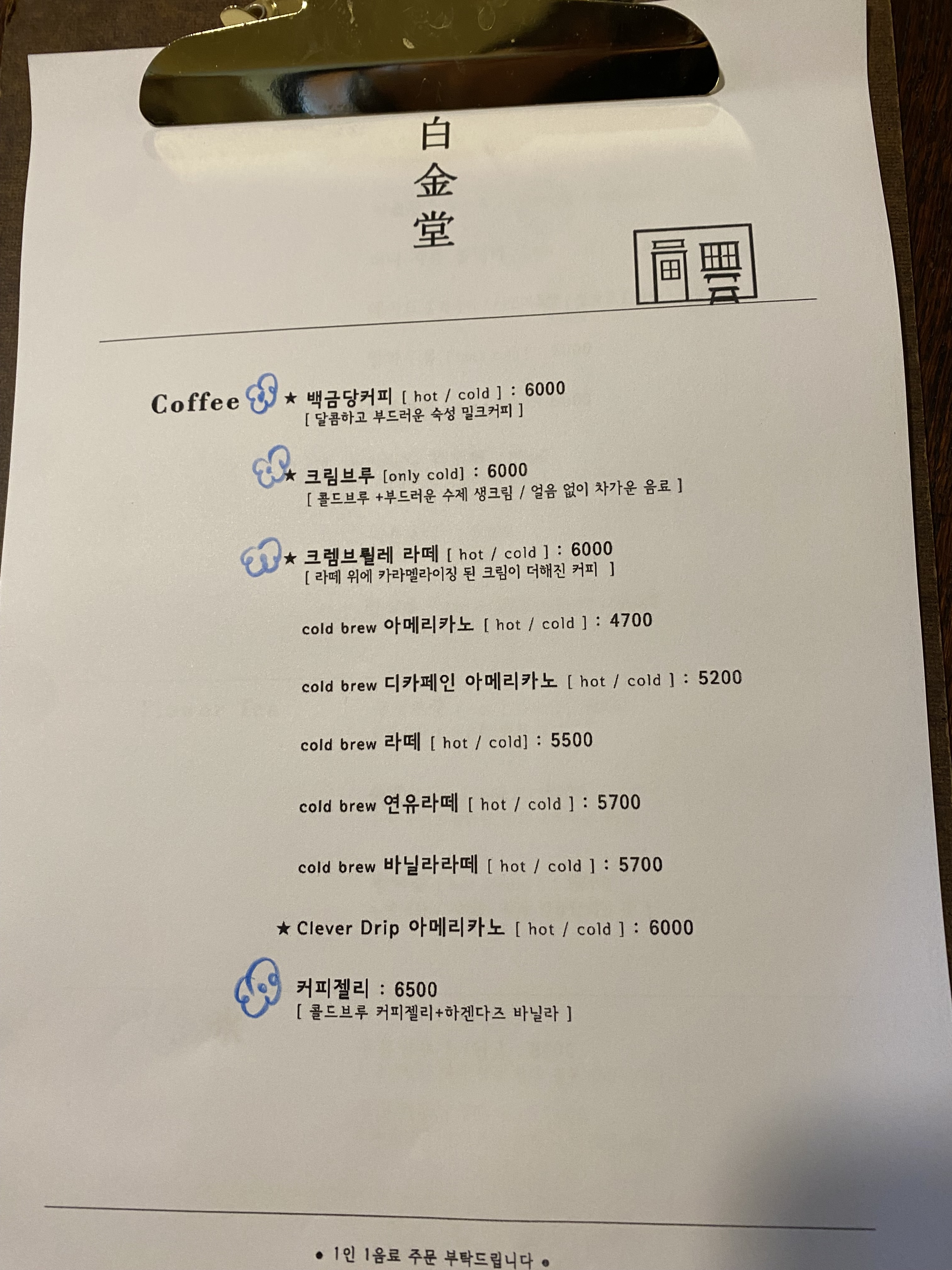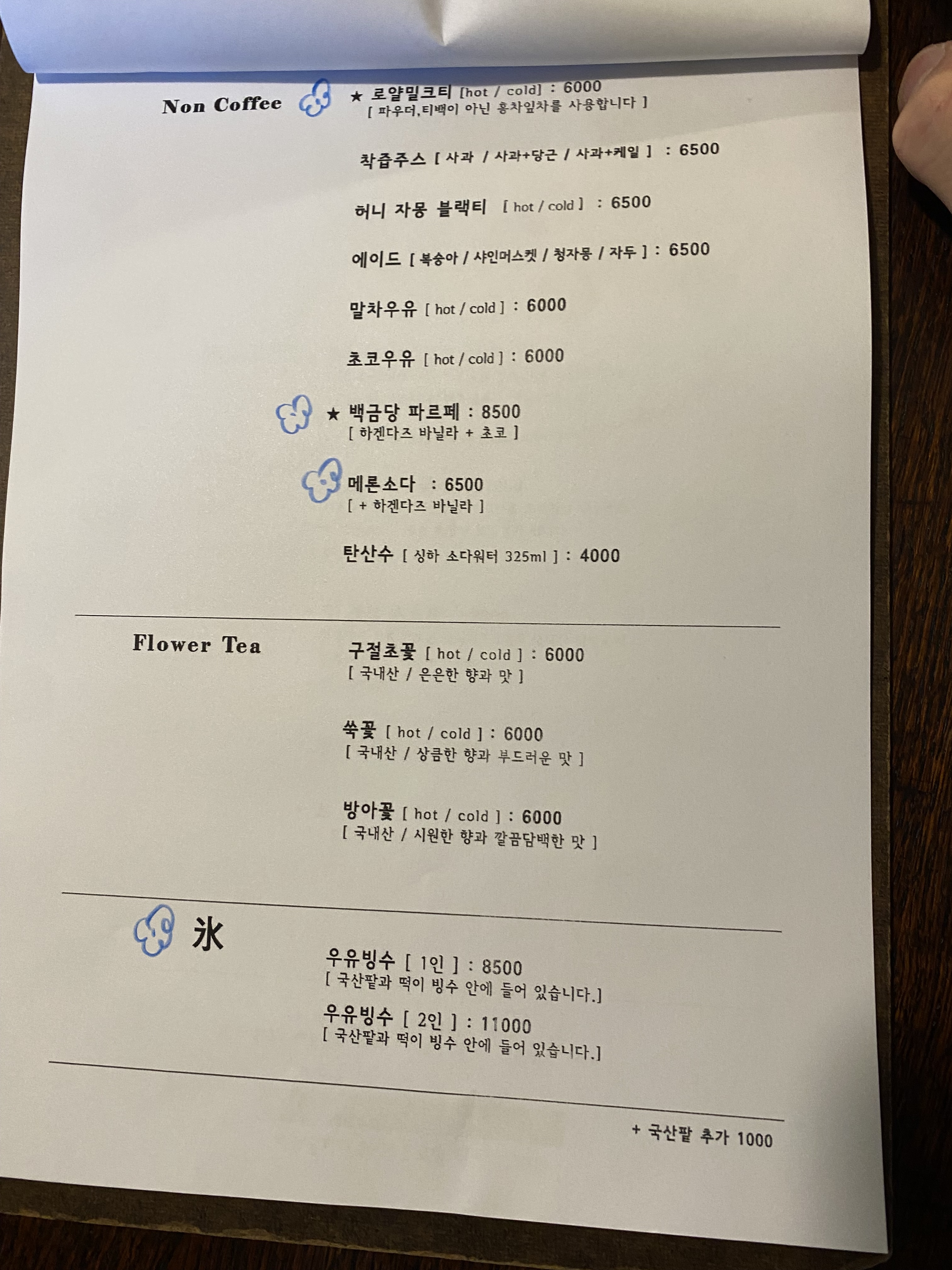 메뉴를 보니 맛있는 거 많아 보이는데요 빙수 먹으러 갔으니 우유빙수 2인분 하나 시키고 아아 한 잔을 주문합니다.