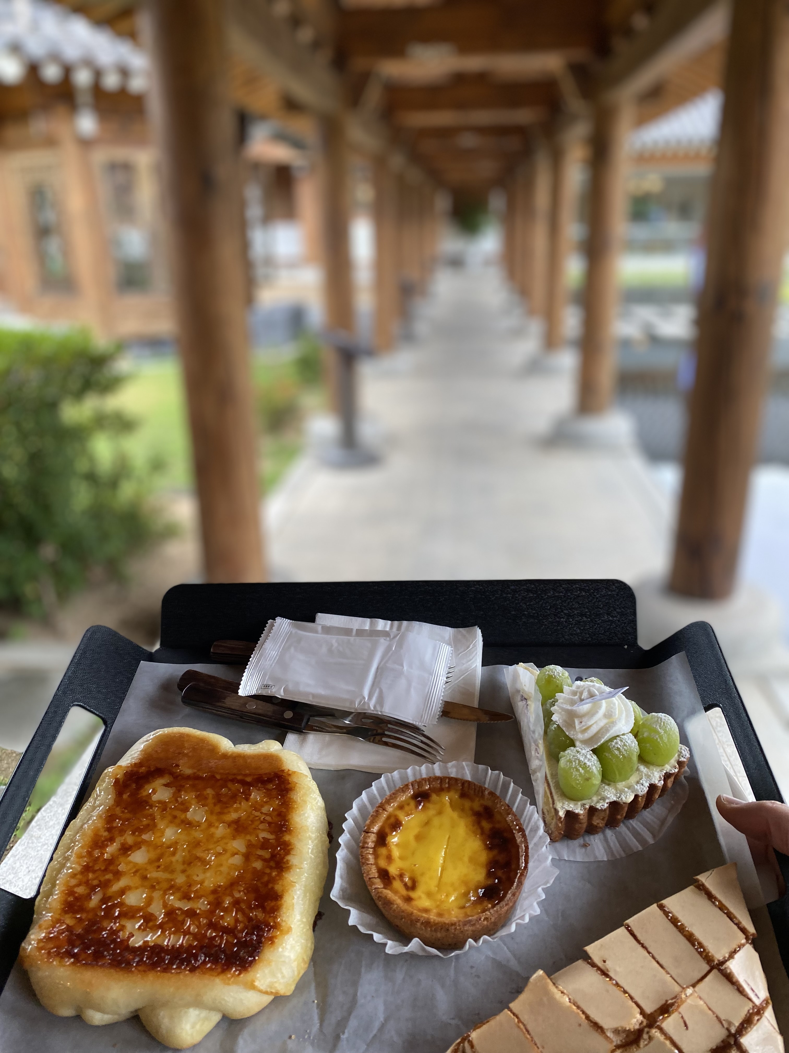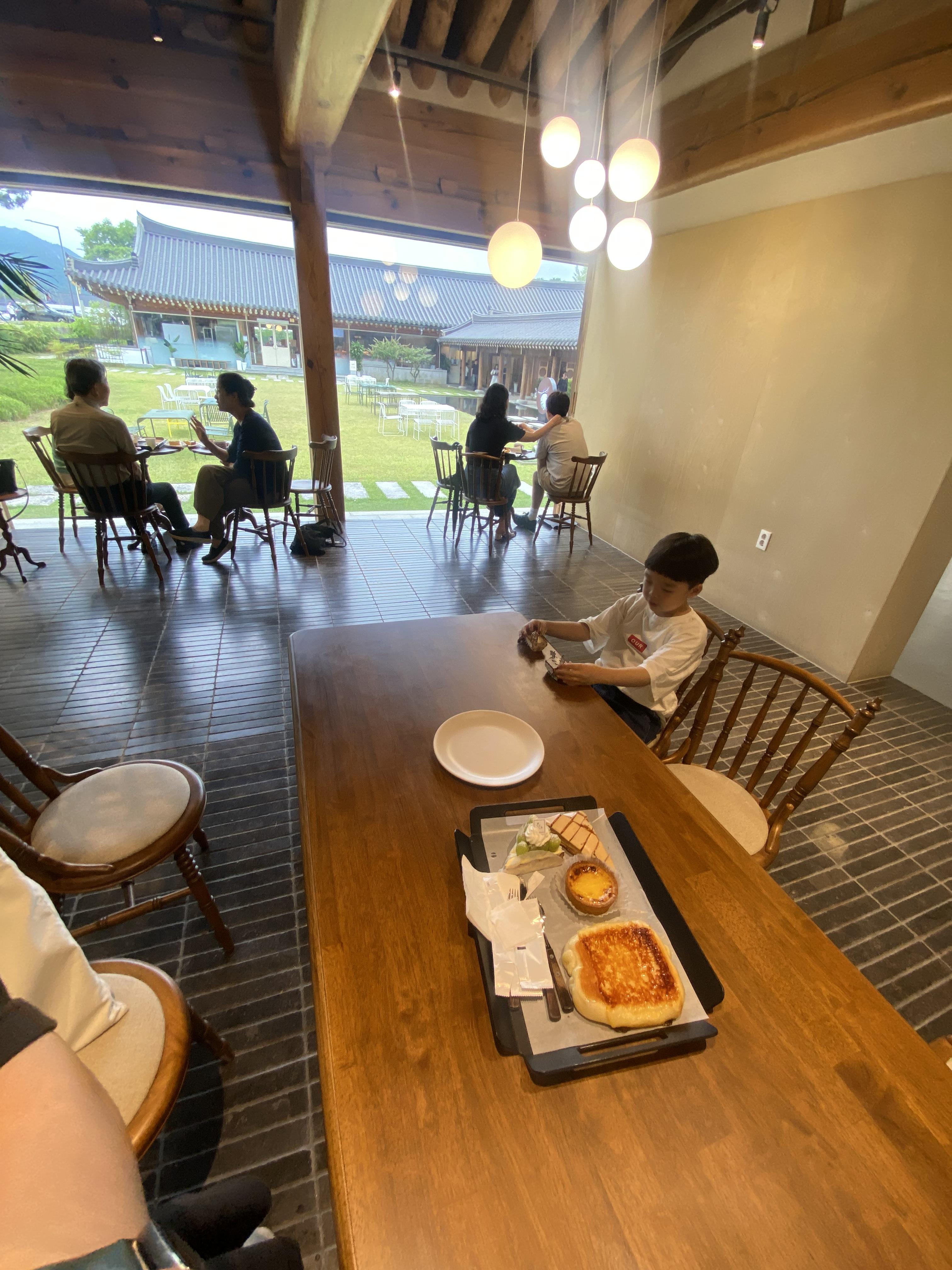 에그타르트, 조각케잌 그 외 두 가지 빵을 더 담았고, 아아 두 잔과 아들 음료수 한잔 시켰습니다. 그랬더니 가격이 웬만한 점심 밥값만큼 나왔네요. 디저트로 나오는 빵들은 매우 맛있었고 아아도 기대 이상으로 맛이 좋았습니다. 넉넉하게 편히 쉬다 올수 있는 한옥카페 '폼드팡 경주점' 강추합니다.