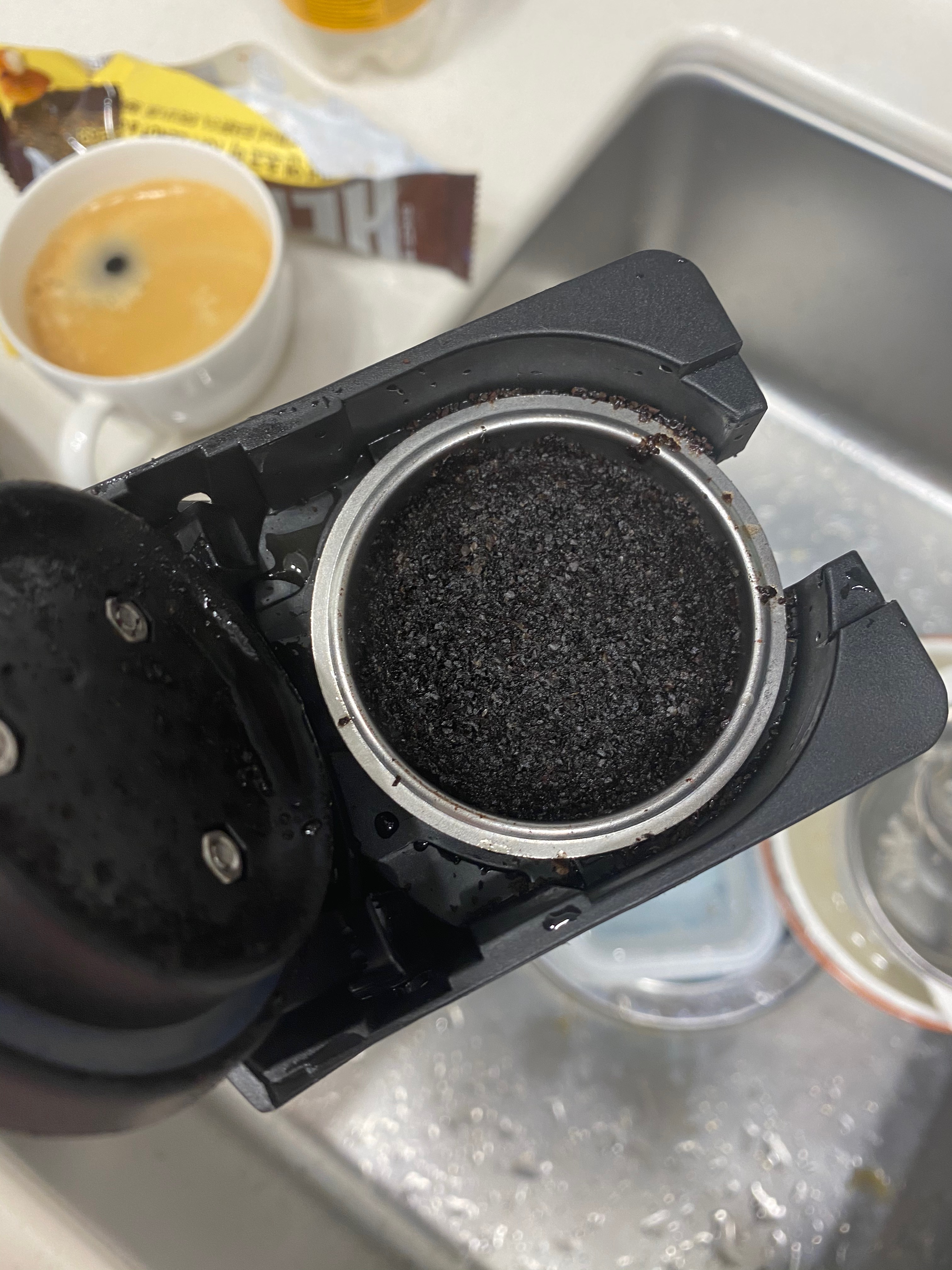 두 숟갈 가득 넣어서 꾹꾹 스탬핑 해준 다음 커피를 내려 봤더니 쨔잔~~ 캬~~~ 오른쪽 사진은 찌꺼기가 되어버린 커피가루 되겠습니다. 아래 동영상은 실제 커피를 내리는 모습을 담아봤습니다.