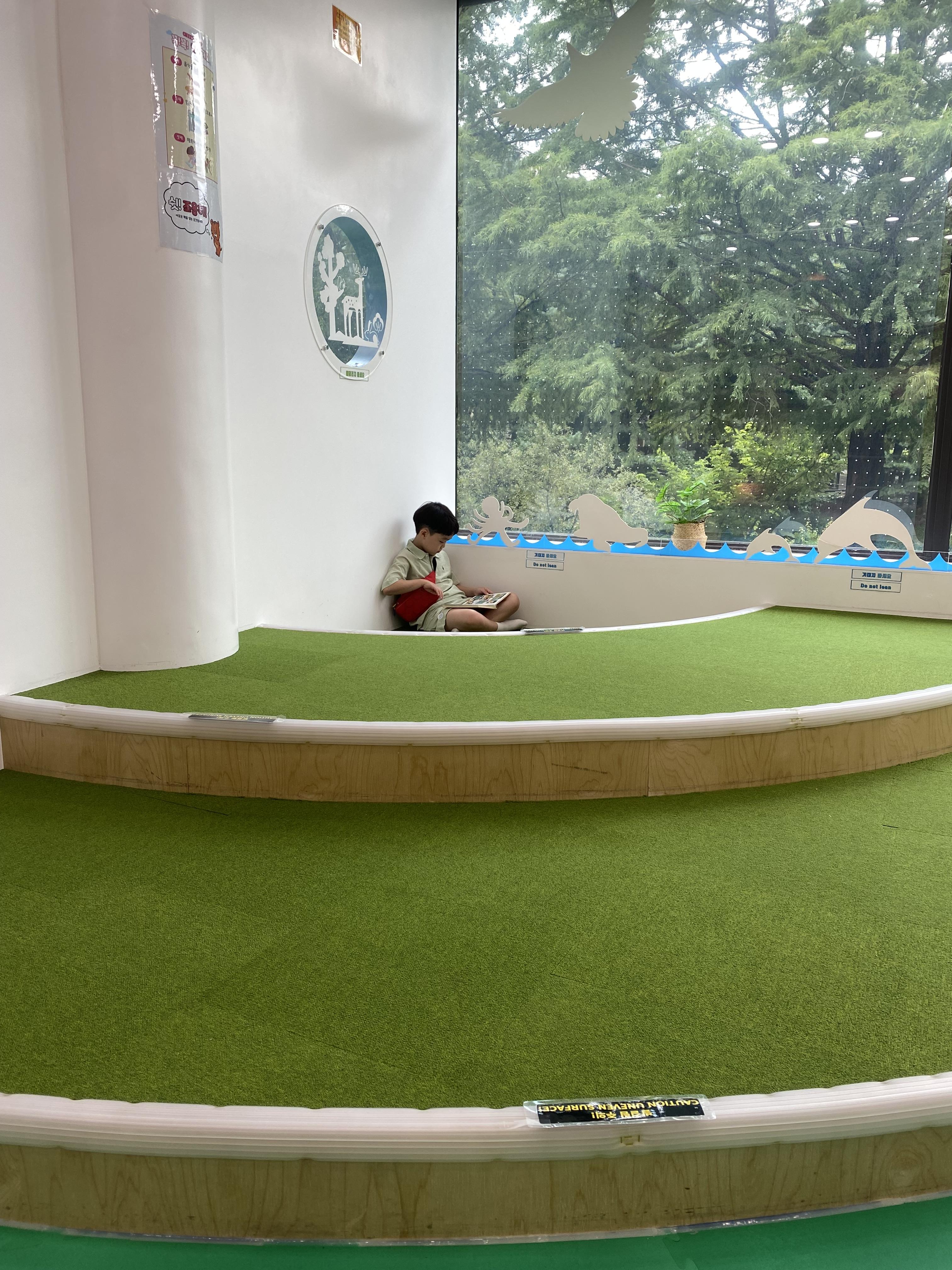 대부분 동물들이 더워 그늘에 피신 중이었는데 콘도르는 더위에 강한지 아님 햇살을 즐기는지 나와있습니다. 우측 사진은 동물원 해양관에 마련된 도서관인데요, 아들이 책 읽기 좋아해서 덕분에 체력도 보충하고 땀도 식힐 겸 잠시 휴식시간을 가졌습니다. 의외로 동물원 방문객에 비해 도서관은 그야말로 조용~~ 저희밖에 없었습니다.
