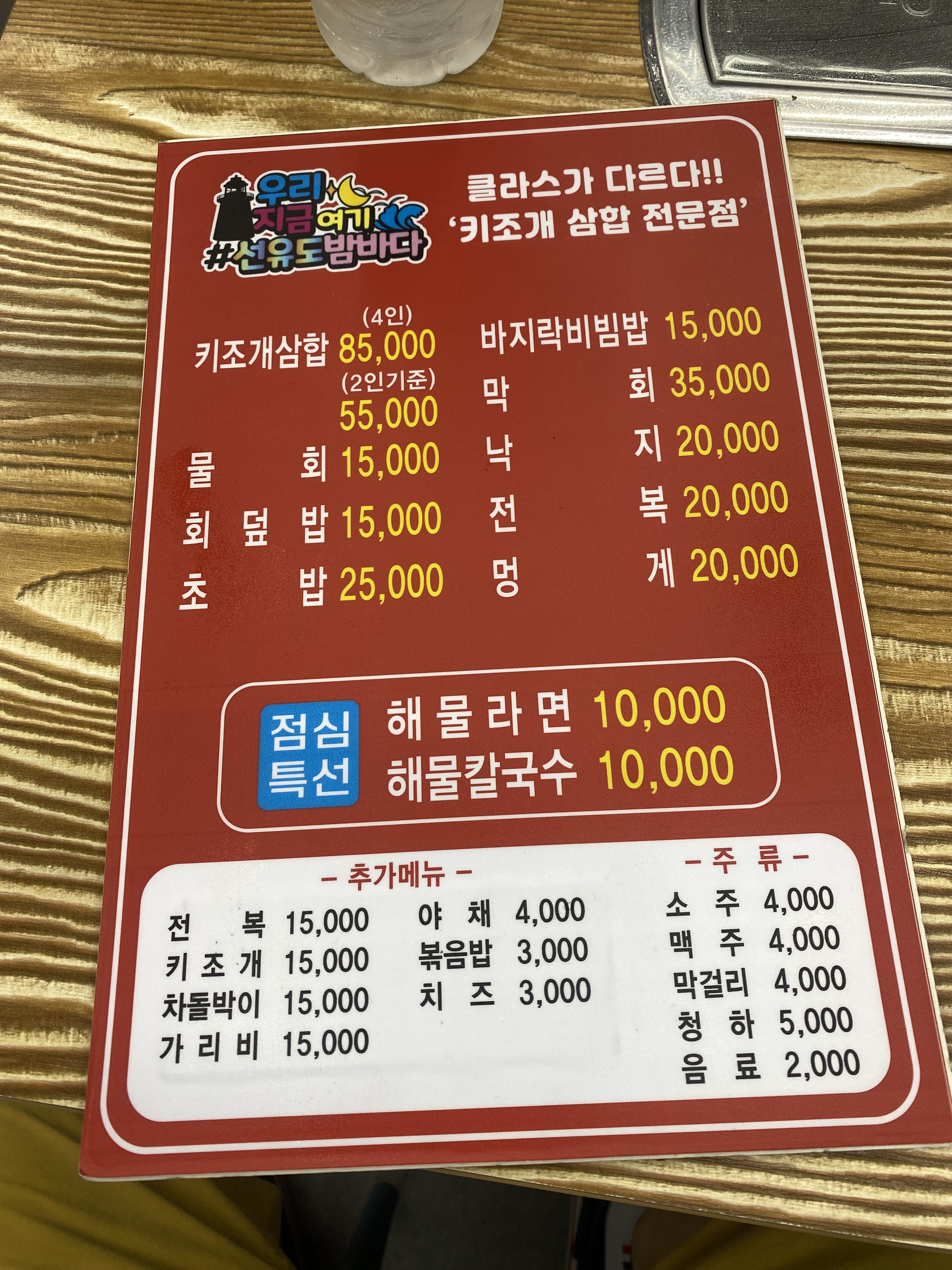 군산 시내에서 벗어나서 다시 선유도가 있는 동네 고군산군도라고 불리는 곳. 여행 마지막 숙소인 신시도 자연휴양림에 체크인을 하고 나서 본격적인 고군산군도 섬을 이곳저곳 탐방을 해봤습니다. 그중 낙조가 너무 예뻐서 기억에 남은 장자도가 있는데 거긴 군산 여행 후기로 남겨놓기로 하고요, 오늘은 3박 4일 여행 중 마지막 석식을 즐겼던 친절함의 끝판왕으로 기억되는 '선유도밤바다' 키조개삼합 전문점을 소개합니다.