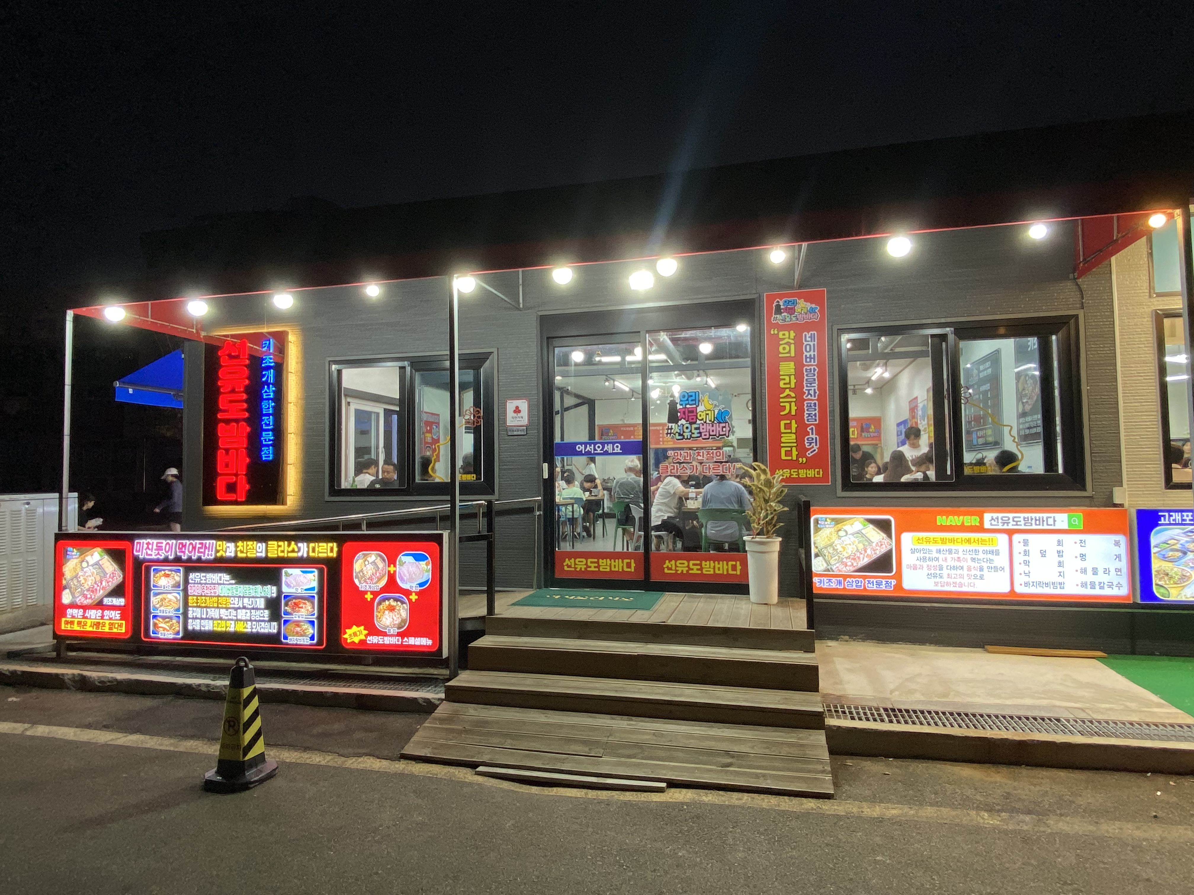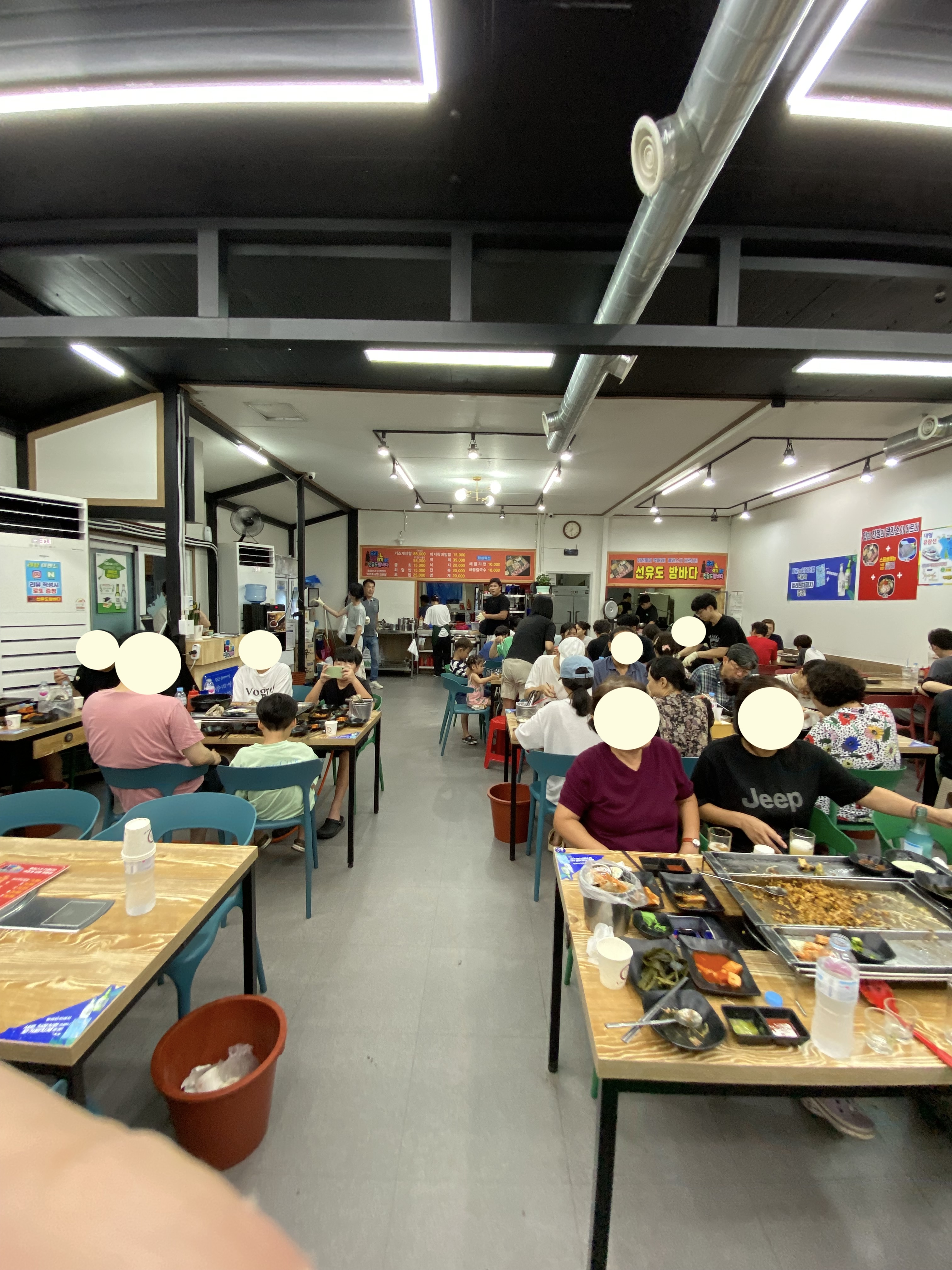 이런 우연히 있나~ 여행 첫 끼로 점심을 먹었던 선유도 고래포차 바로 옆 가게가 선유도밤바다 입니다. 군산 여행의 첫 끼와 마지막 저녁 식사를 같은 장소에서 하다니~~!!! 3박 4일 동안 식사시간은 조금 일찍 한다는 기분으로 식당을 찾아다녔는데 마지막 석식은 말이죠~ 장자도 낙조에 넋이 팔려 그만 저녁 7시가 약간 넘은 시간에 식당에 도착을 해버렸지 뭡니까??!! 우와~~ 대기 줄이 어마어마하고 여행객들로 식당 내부는 그 열기가 후끈후끈~ 찜통 같은 더위에 사우나를 하러 온 건지 밥을 먹으러 온 건지 헷갈릴 정도의 더위였습니다. 대기는 30분 정도를 해야 한다고 안내를 받고 원래 이렇게 웨이팅 긴 곳은 그냥 지나치는데 저녁 식사시간이 좀 늦기도 했도 동네 주변에 식당을 찾기도 힘들어서 그냥 기다리기로 했습죠.