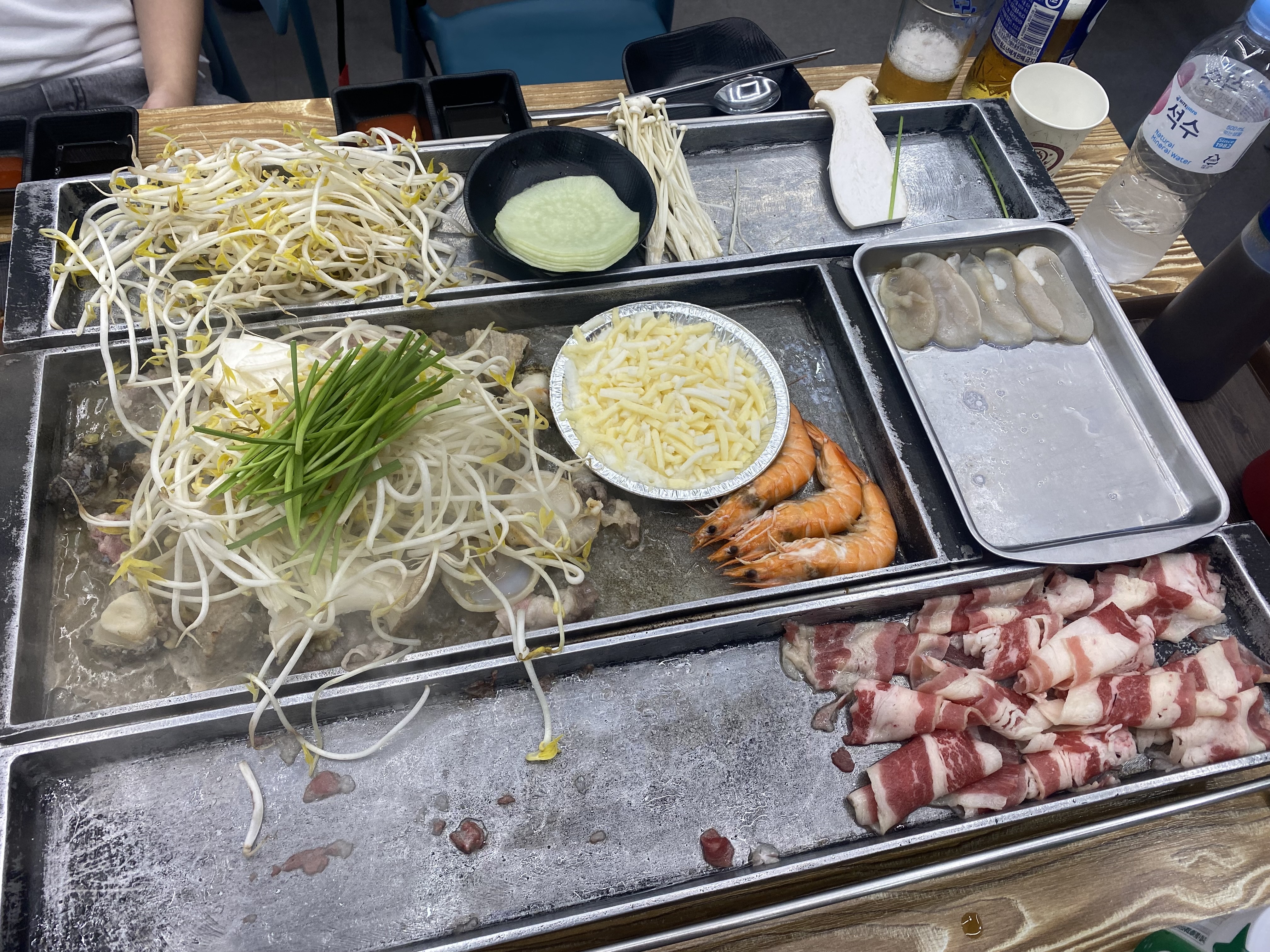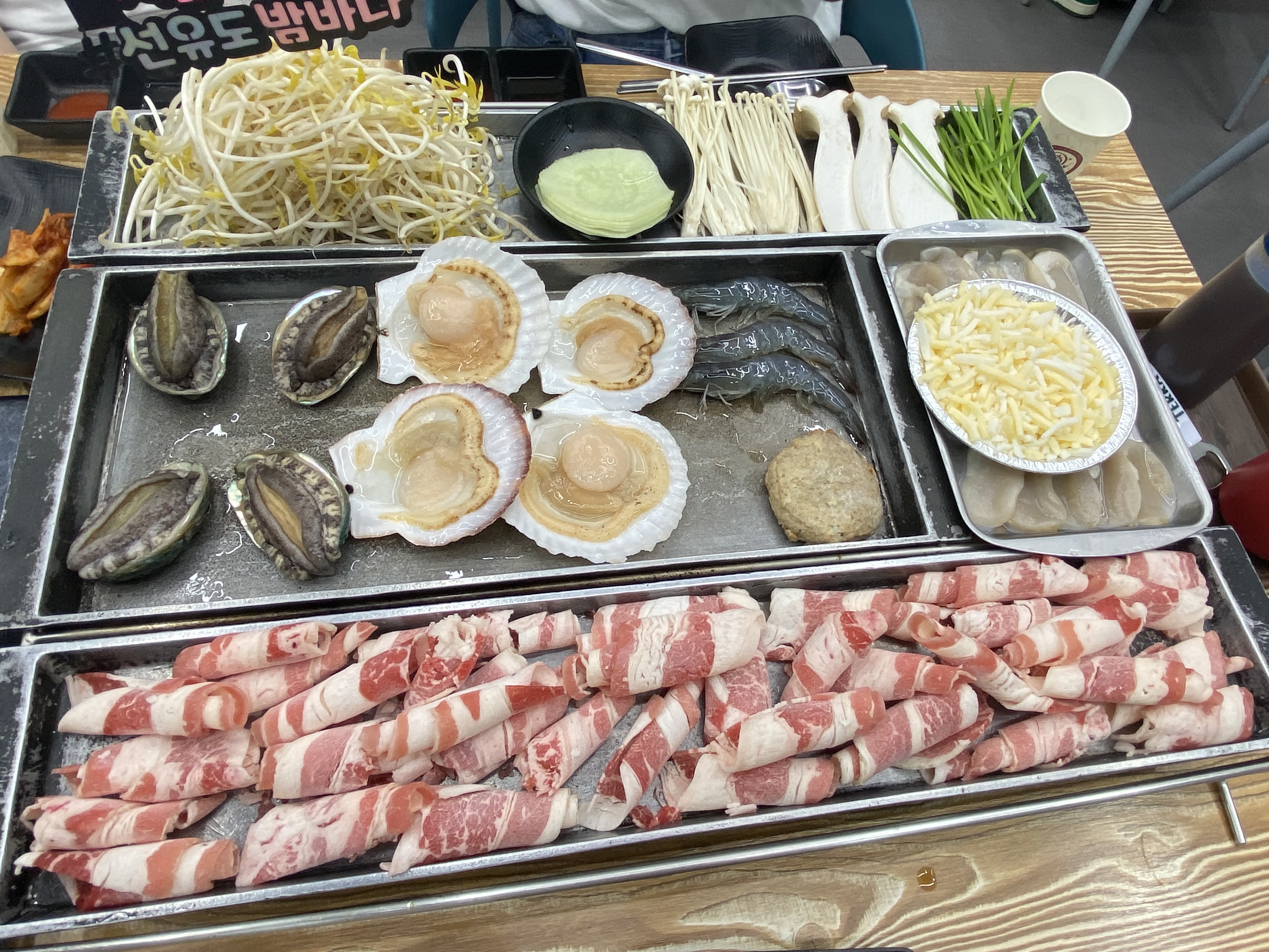 그렇게 많은 주문과 요청 사이에도 모든 직원들은 한결같이 밝은 웃음에 정성껏 대하는 테이블 서비스에 그저 감탄할 따름이었죠. 그러는 사이에 저희가 주문한 키조개삼합 2인분이 나왔습니다. 전복, 키조개, 새우, 차돌박이, 각종 야채에 치즈까지~~ 한 테이블 꽉 들어찹니다.