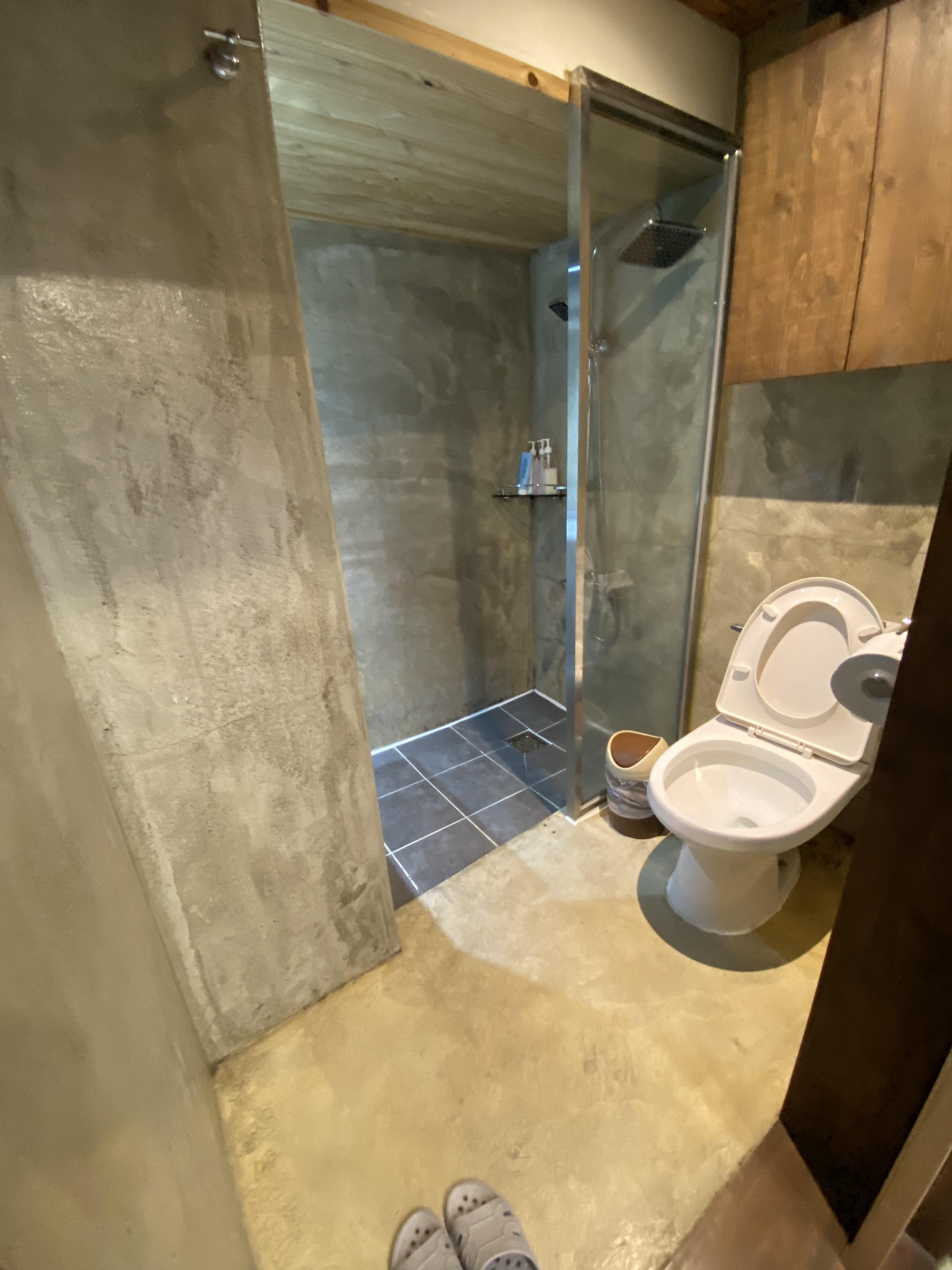 실내로 들어가니 3인 침구가 잘 정돈되어 있고 실내에 화장실 겸 샤워실도 함께 구비되어 있어서 무척 마음에 들었습니다. 저희 세 식구 하루 이용하기 정말 딱인 곳이었죠.