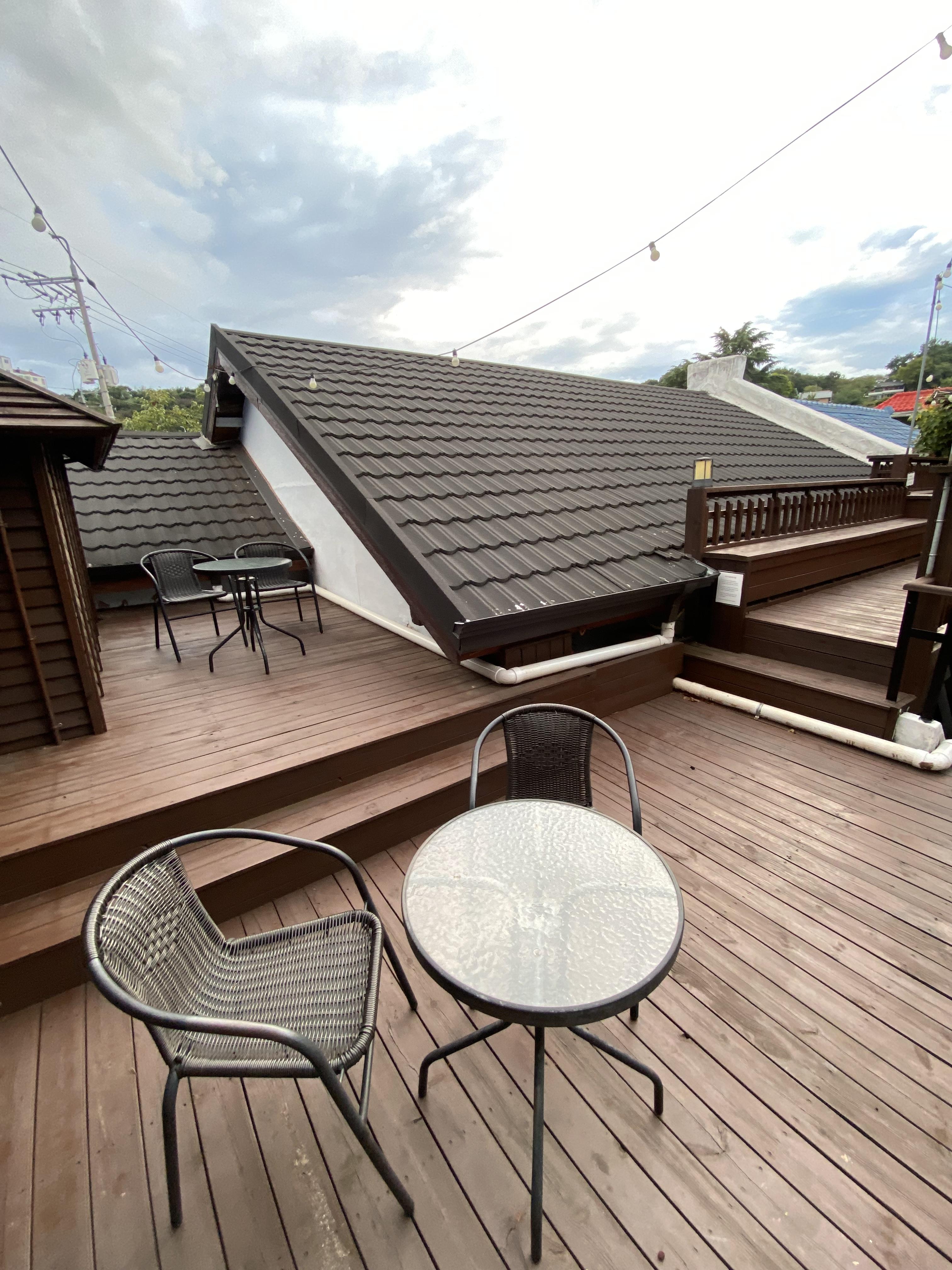 옥상에 올라가면 테라스가 마련되어 있고 담장 너머엔 동네 관광지인 신흥동 일본식 가옥이 바로 보입니다. 게스트 하우스 이웃의 옥상 뷰 맛집이라고 해야 할까요? 바로 옆에 있어서 그런지 게스트하우스는 일본식 가옥이 느낌적 느낌으로다가 좀 덜한데 담장 너머에 진짜배기 일본식 가옥이 있어서 분위기가 업된다랄까요? 하지만 저희가 방문했던 시기는 모기떼가 극심하던 그런 시기라 옥상에서 맥주 한 잔(?) 뭐 이런 로맨틱을 즐기기엔 모기 밥 신세가 너무 눈에 뻔하게 보여서 그냥 잠시 눈으로 즐기고 말았답니다. 모기 시즌 제외하고 여기 방문하시면 꼭 루프탑 맛집을 즐겨보세요. 숙소는 더할 나위 없이 깨끗하고 쾌적했으며 숙소에서 도보로 웬만한 골목길 구석구석은 다 누리며 군산의 근대도시 야경투어를 원 없이 즐겼던 그런 숙소였습니다. 1박에 10만 원도 안 하는 가격으로 너무너무 즐거운 군산 도심지 야경투어였습니다. 숙소로 초강추 합니다!!!