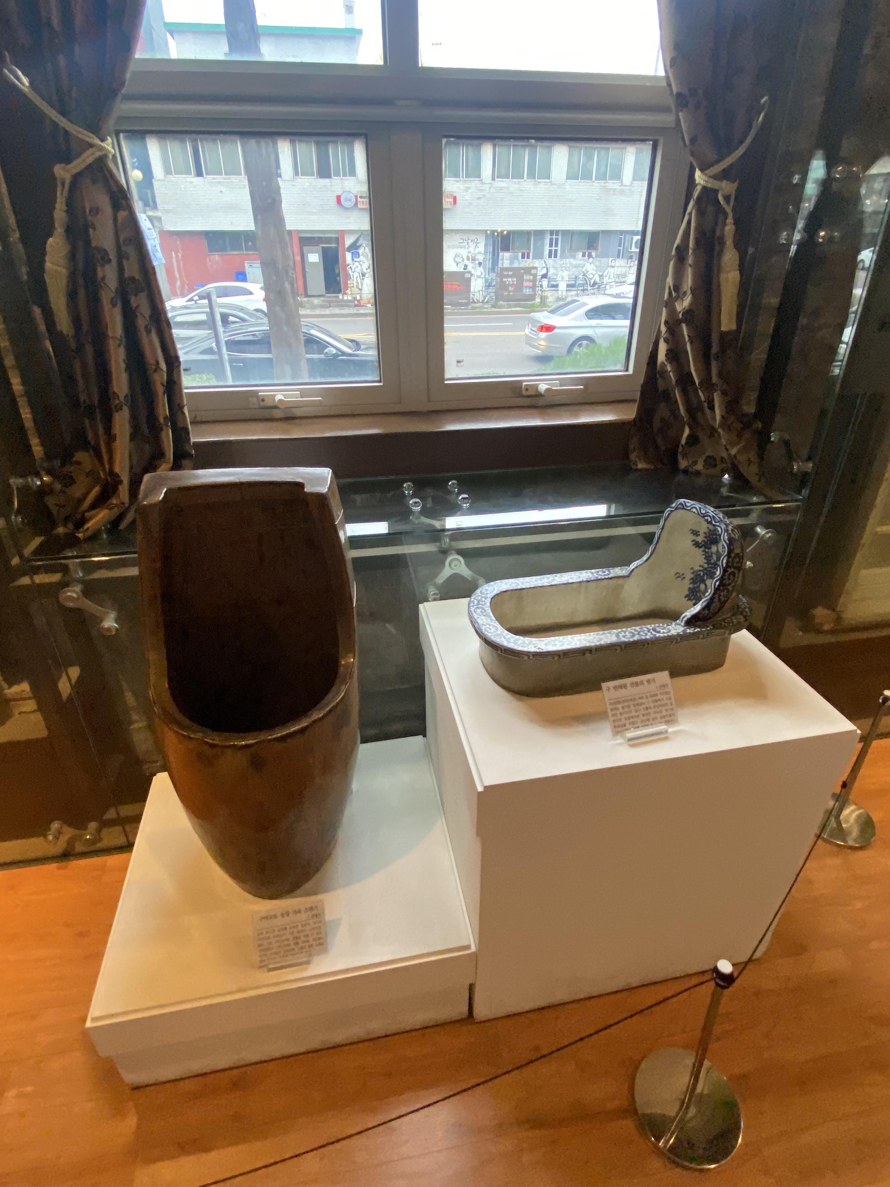 그 당시 사용했던 건물의 잔해와 화장실 변기가 전시되어 있습니다.