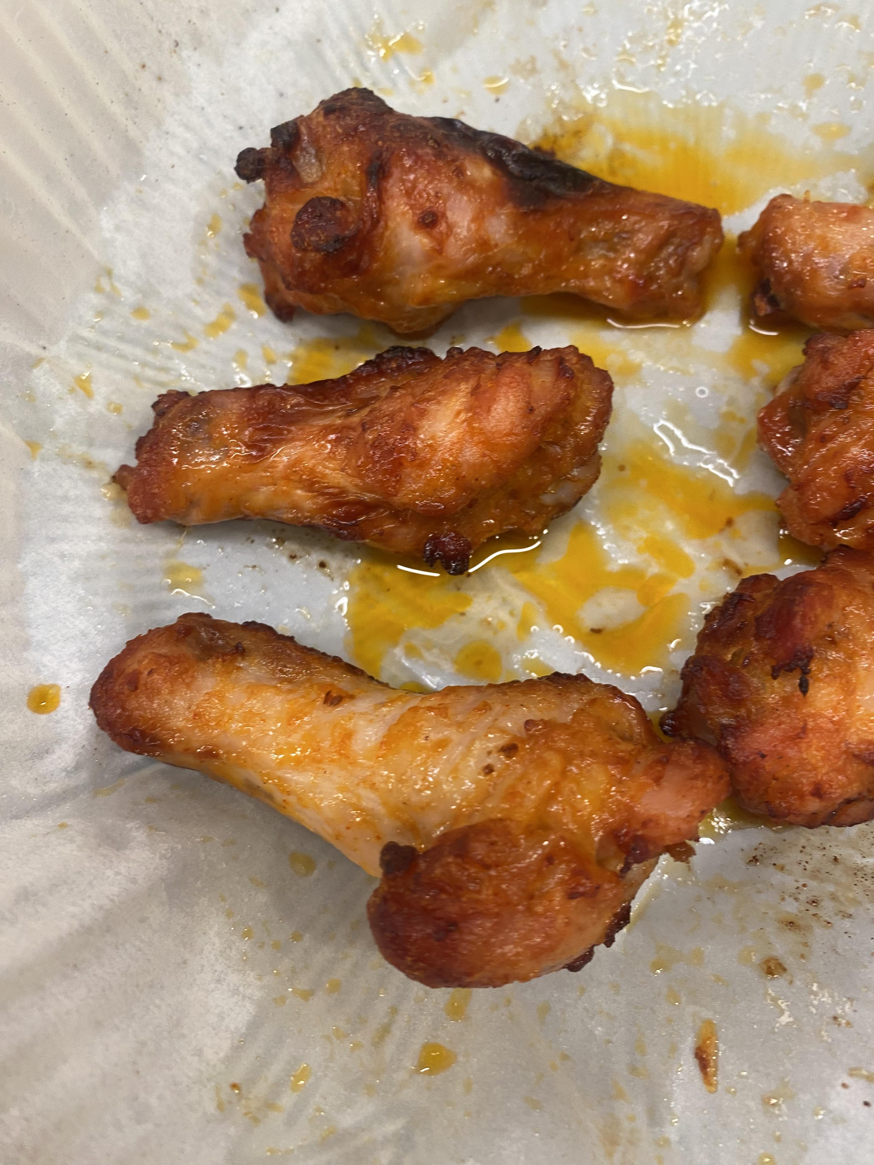에어프라이어에 냉동된 닭봉을 넣고 그 위에다 살짝 오일을 뿌려 줍니다. 그리고 15분 동안 230도 온도로 구워주면 되는데 정확히 중간 정도 지난 시간에 한 번만 뒤집어 주면 요렇게 맛있는 버팔로봉이 완성됩니다.