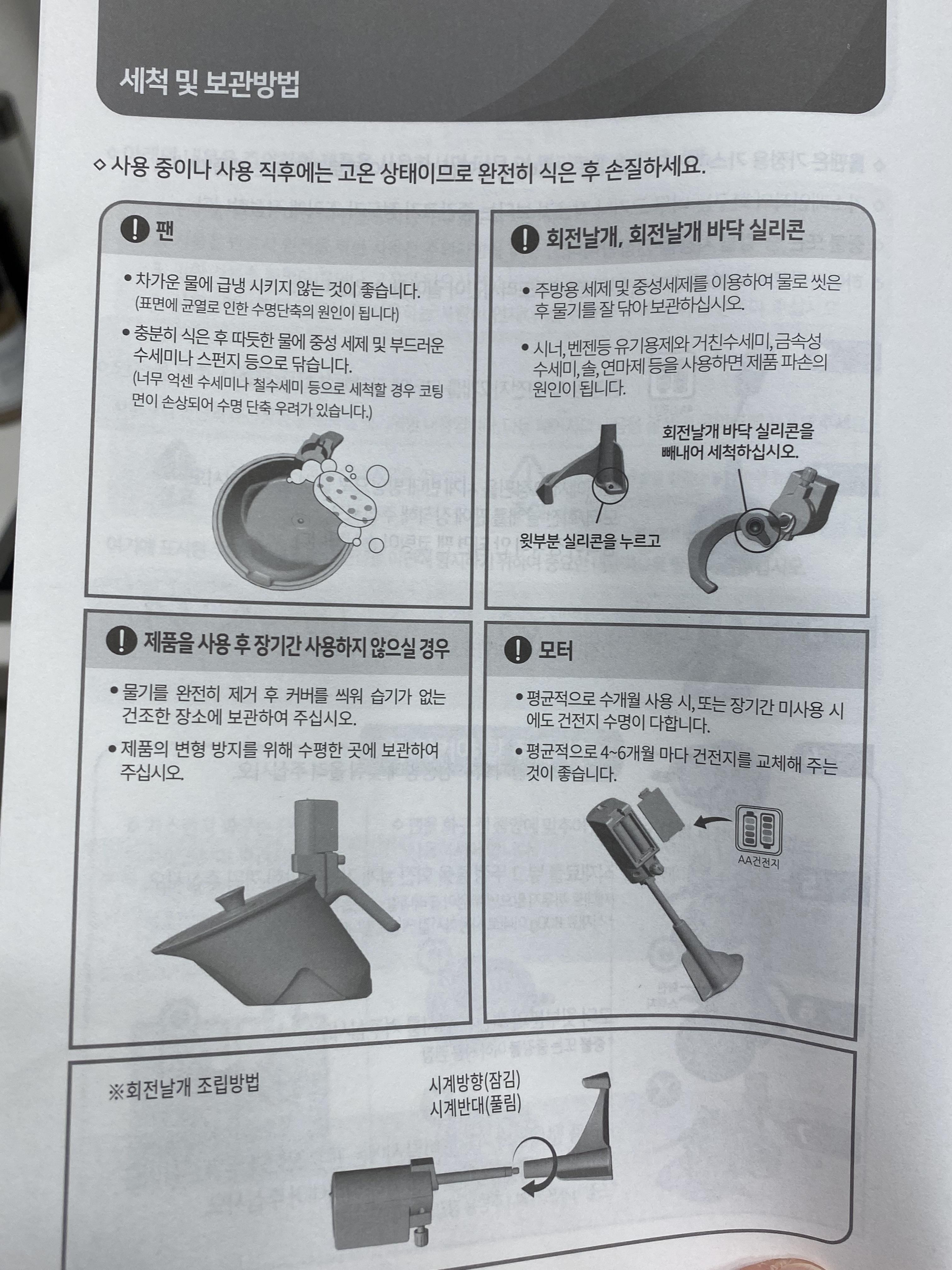 사용방법 및 보관방법 잘 보셔야 듯. 특히 회전날개와 바닥 실리콘 잘 보세요. 울 와이프님 그냥 보지도 않고 제가 세척시키고 말려놨는데 바닥 실리콘 하마터면 버릴 뻔 했습니데이.