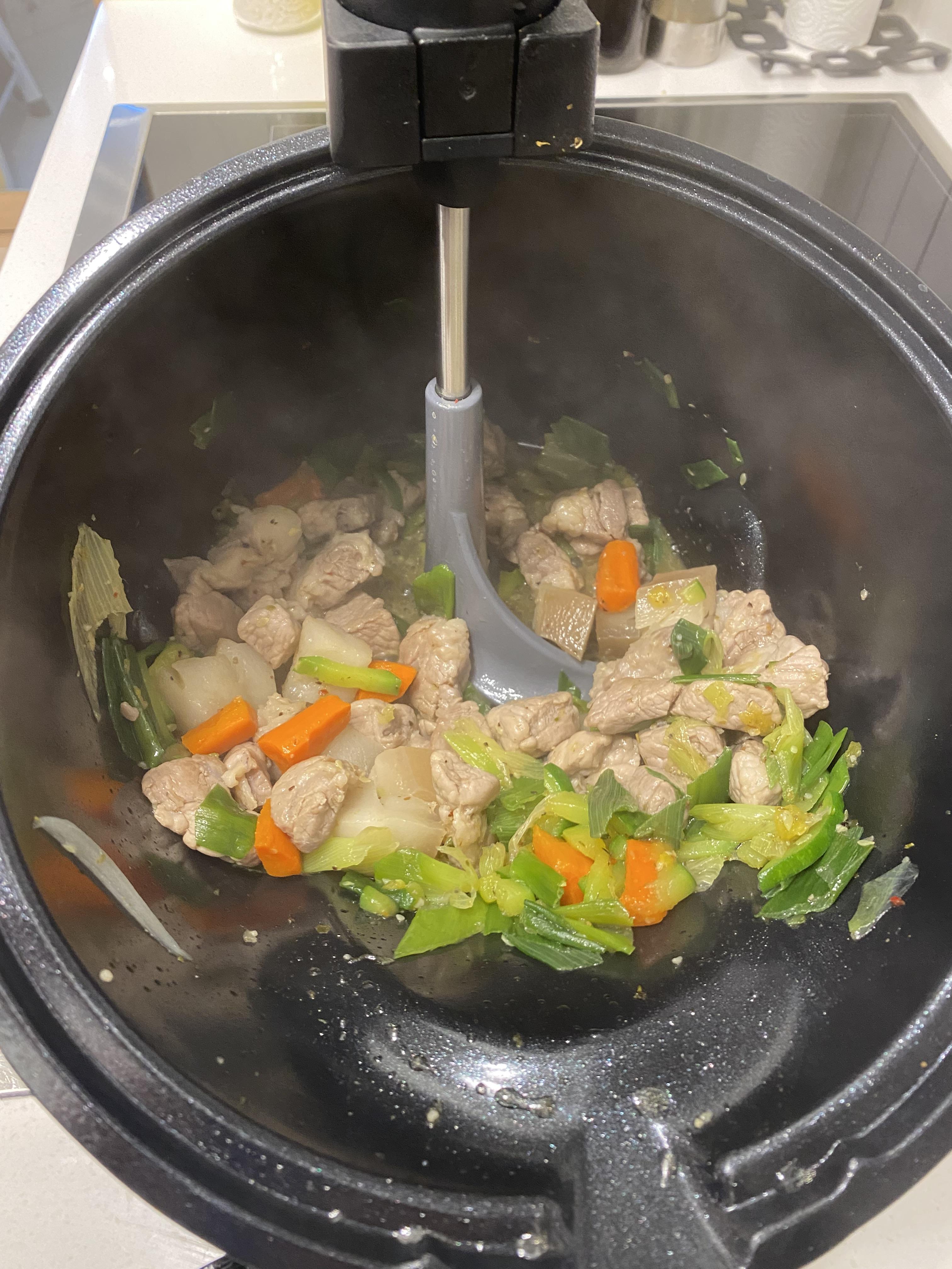 새로운 팬이 왔으니 얼마나 요리가 잘 되는지 실력 테스트해 봐야겠죠? 마침 집에 두꺼운 목살 400g과 손질해 놓은 야채 꾸러미가 있어서 몽땅 팬에 넣고 요리 시작!!!! 요리 설명서도 들어가 있어서 그거 보고 그대로 따라 해봤는데 말이죠~ 뚜껑 덮어놓고 계속 저어주니 수육이 되더라는~~ 안되겠다 싶어 수분과 기름을 조금 덜어내고 뚜껑 오픈해서 5분가량 충분히 열을 가하면서 계속 회전 기능으로 돌려주니 ......