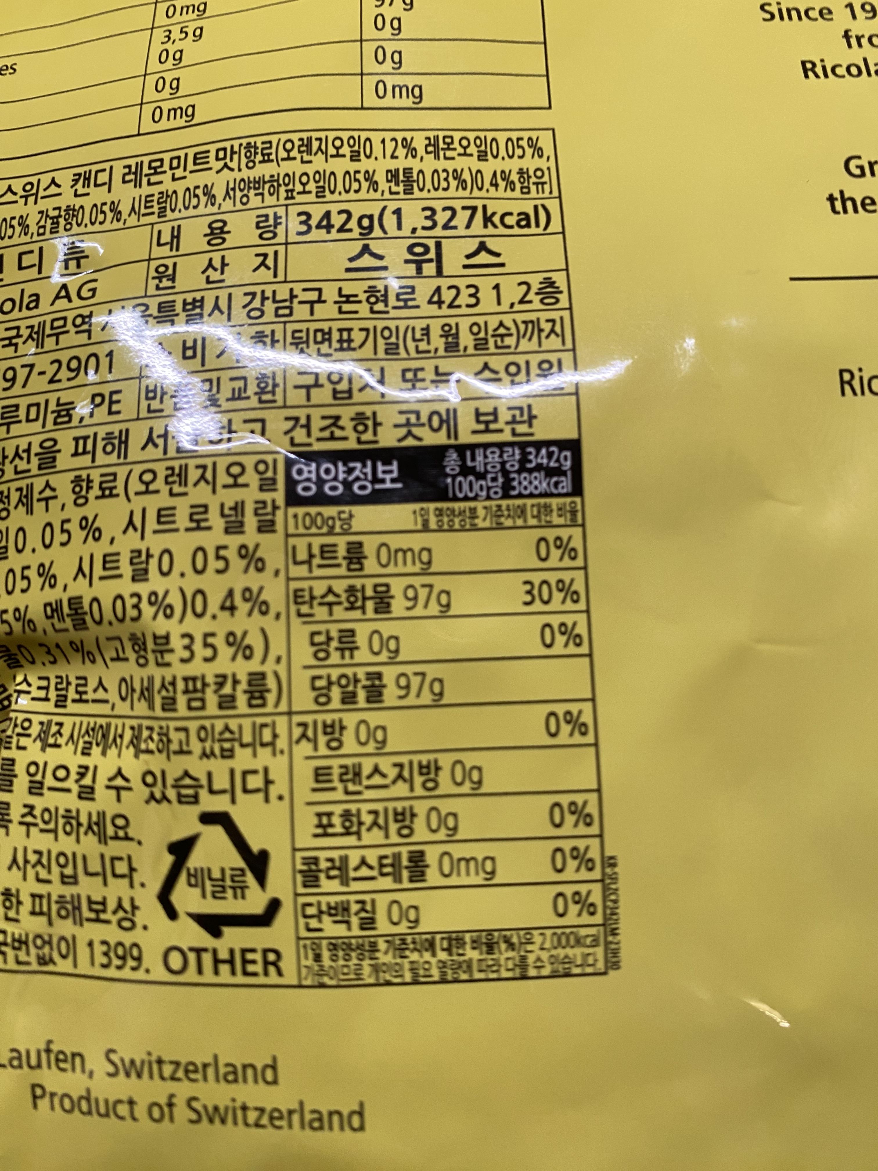 날씨가 건조하면서 쌀쌀해지니 평소 기관지 알레르기를 달고 사는 저로서는 말 많이 하는 날에는 박하부터 다양한 맛을 느낄 수 있는 사탕을 대여섯 개 정도는 기본으로 입에 머금고 있는데요, 지인분께서 그런 모습이 안쓰러웠는지 아니면 걱정이 되었는지 설탕 덩어리 사탕을 그렇게 많이 먹으면 당뇨 걸린다고 신신당부를 하더군요. 그래서 평소에 먹던 사탕을 하나씩 살펴보니 몇 개 브랜드는 설탕 덩어리고 독일제 사탕은 다행히도 무가당 제품입니다. 살짝 배신감을 느끼며 앞으로 먹는 사탕은 전부 무가당 제품으로 하리라 맘먹고 쿠팡에서 이것저것 알아봤습니다. 쿠팡에서 결국 맘에 드는 제품을 구입했는데 '무가당 리콜라 스위스 레몬 민트 맛 342g'입니다. 구입가격은 11,260원 되겠습니다.