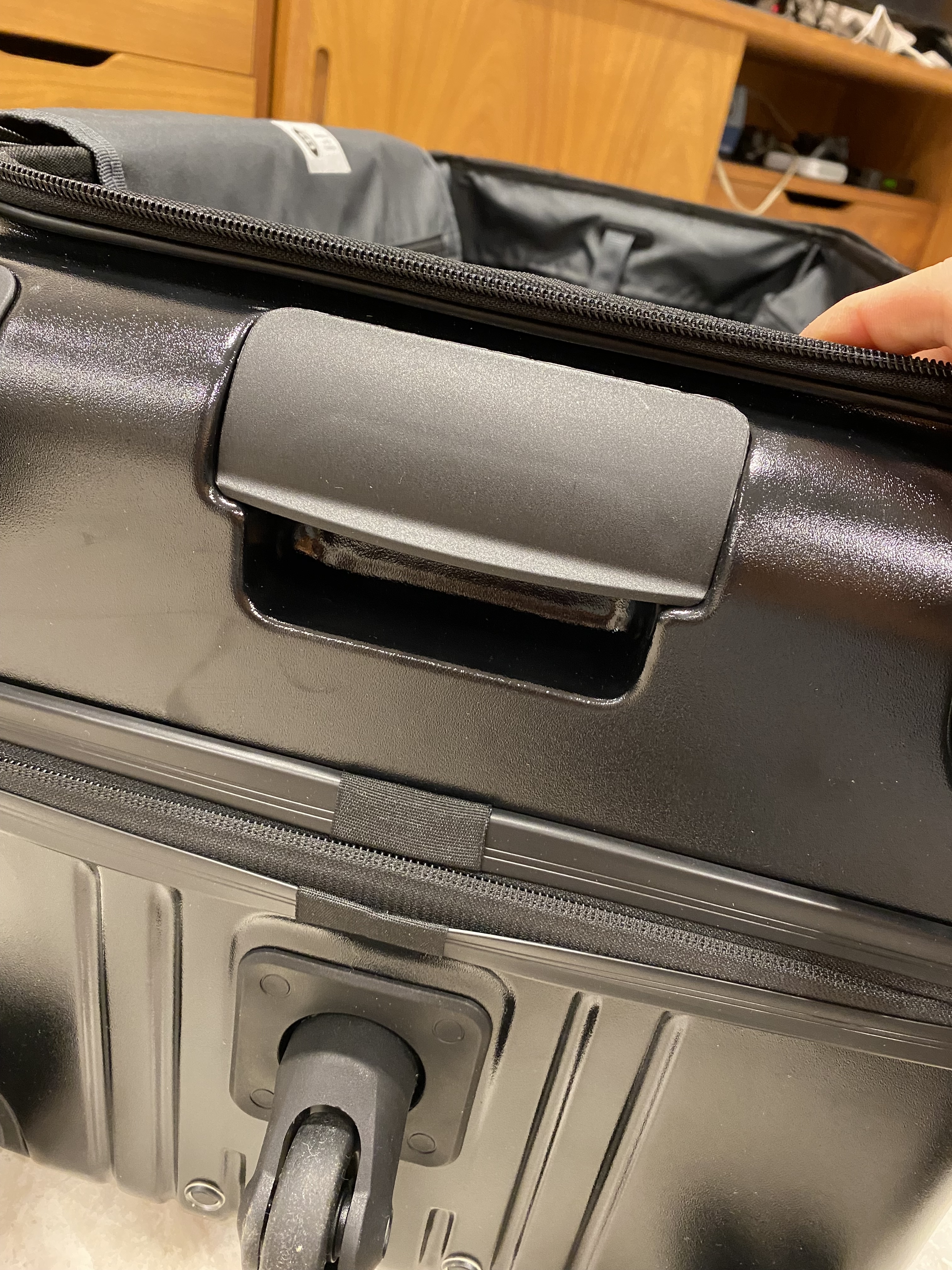 요 부분은 캐리어 아랫부분까지 아주 꼼꼼하게 여행자 입장에서 신경을 쓴 부분인데 옆으로 뉘었을 때 캐리어 손잡이가 있어서 편리하게 짐을 싣고 꺼낼 때 아주 유용한 손잡이 되겠습니다.