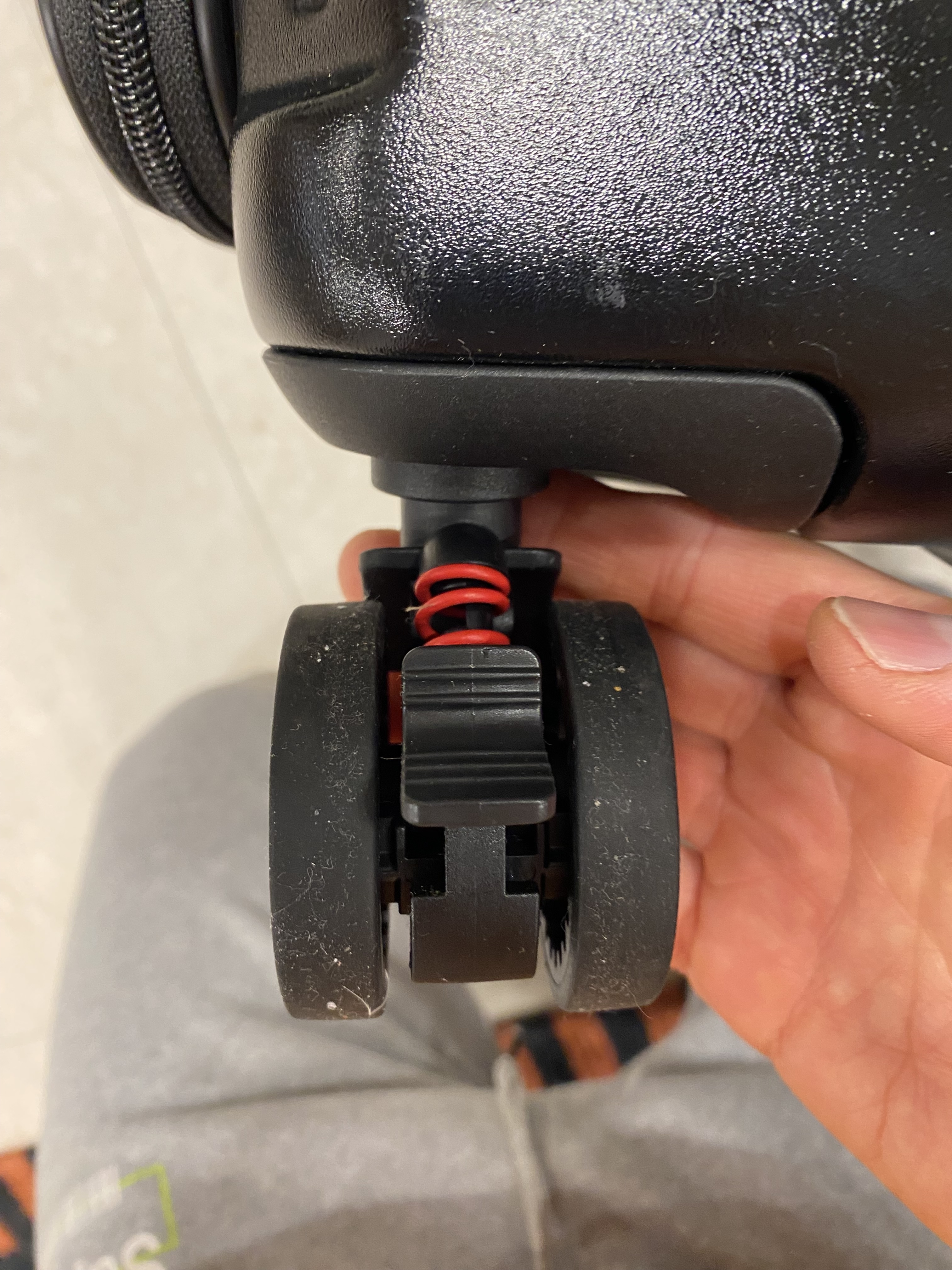 안전 잠금장치 바로 옆에는 USB C & A 타입 충전구가 있어서 내부에 보조 배터리를 넣어두고 간편하게 스마트폰, 태블릿 충전을 할 수 있네요. 그리고 우측 사진 바퀴가 요 캐리어 선택을 하게 만든 이유가 된달까요? 당연히 무소음 휠인데 전면부 바퀴 두 군데에 잠금장치가 있어서 공항에서 짐 붙이기 전 대기 상황이라든지 캐리어 끌고 다닐 때 잠시 쉬는 시간에 락을 걸어놓고 편하게 있을 수 있습니다.