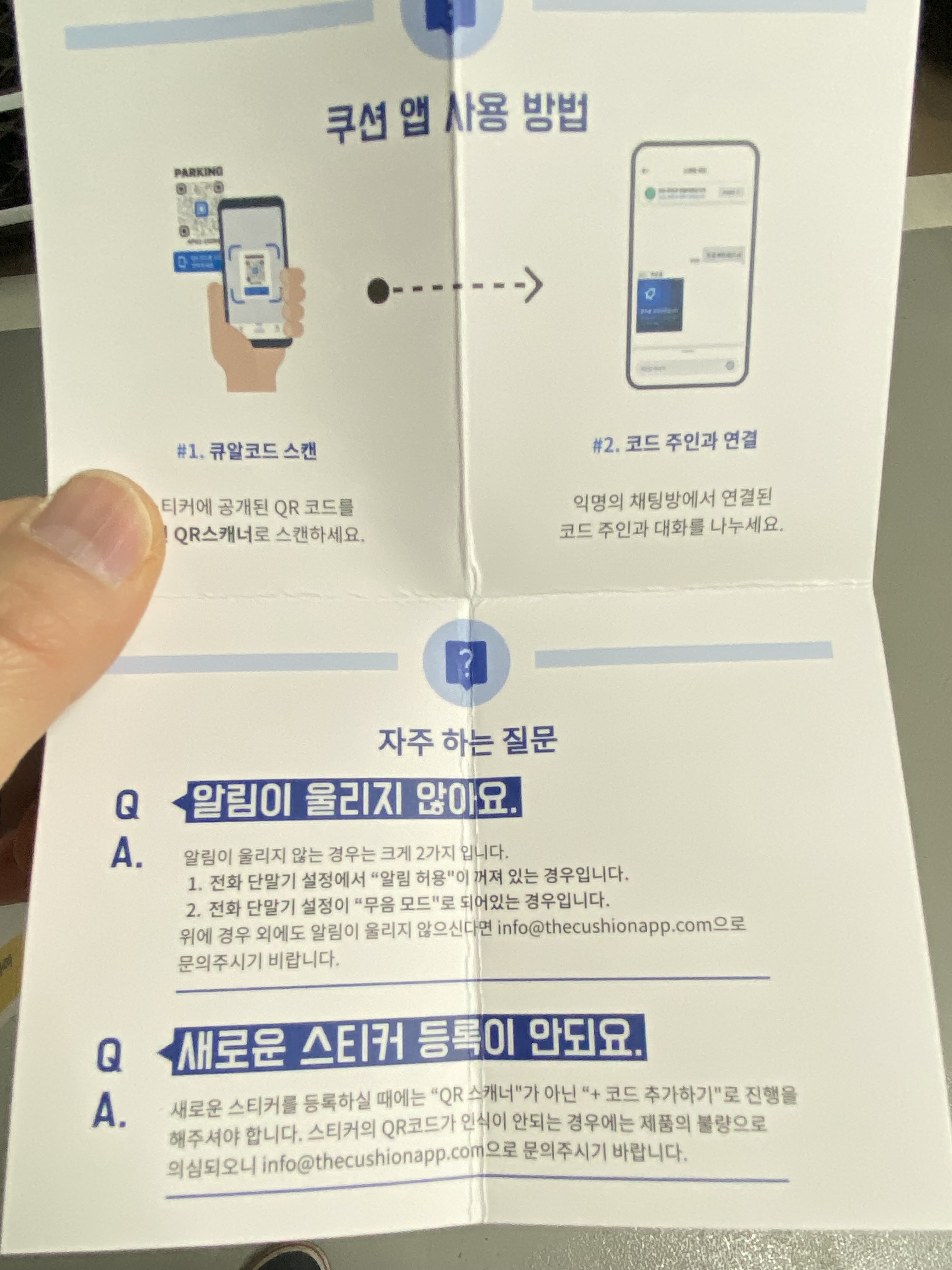 사용설명서는 잘 읽어보시면 되고요, 가장 쉬운 설명으로는 QR 주차 번호 알림판을 사용하는 사람은 반드시 연락을 문자로 받을 수 있는 앱을 하나 깔고 등록을 해야 QR코드가 활성화됩니다. 연락을 해야 하는 사람은 굳이 앱을 깔지 않고도 qr 읽혀서 웹으로 문자 발송이 가능하도록 되어있어서 운전자 입장에서는 찜찜하게 굳이 개인 연락처가 유출되는 불안감 없이 매우 편리하게 안내받을 수 있고, 전화를 걸어야 하는 입장에서는 qr 읽히고 문자로 보내면 되니 일일이 전화번호 눌러 통화할 필요가 없어서 편리하겠죠? 다만, 사용자가 스마트폰을 기본적으로 사용을 할 수 있어야 합니다만..... 암튼 안전하고 안심 qr코드 주차 번호 알림판을 사용할 수 있게 되어 너무 좋습니다. 강추!!!