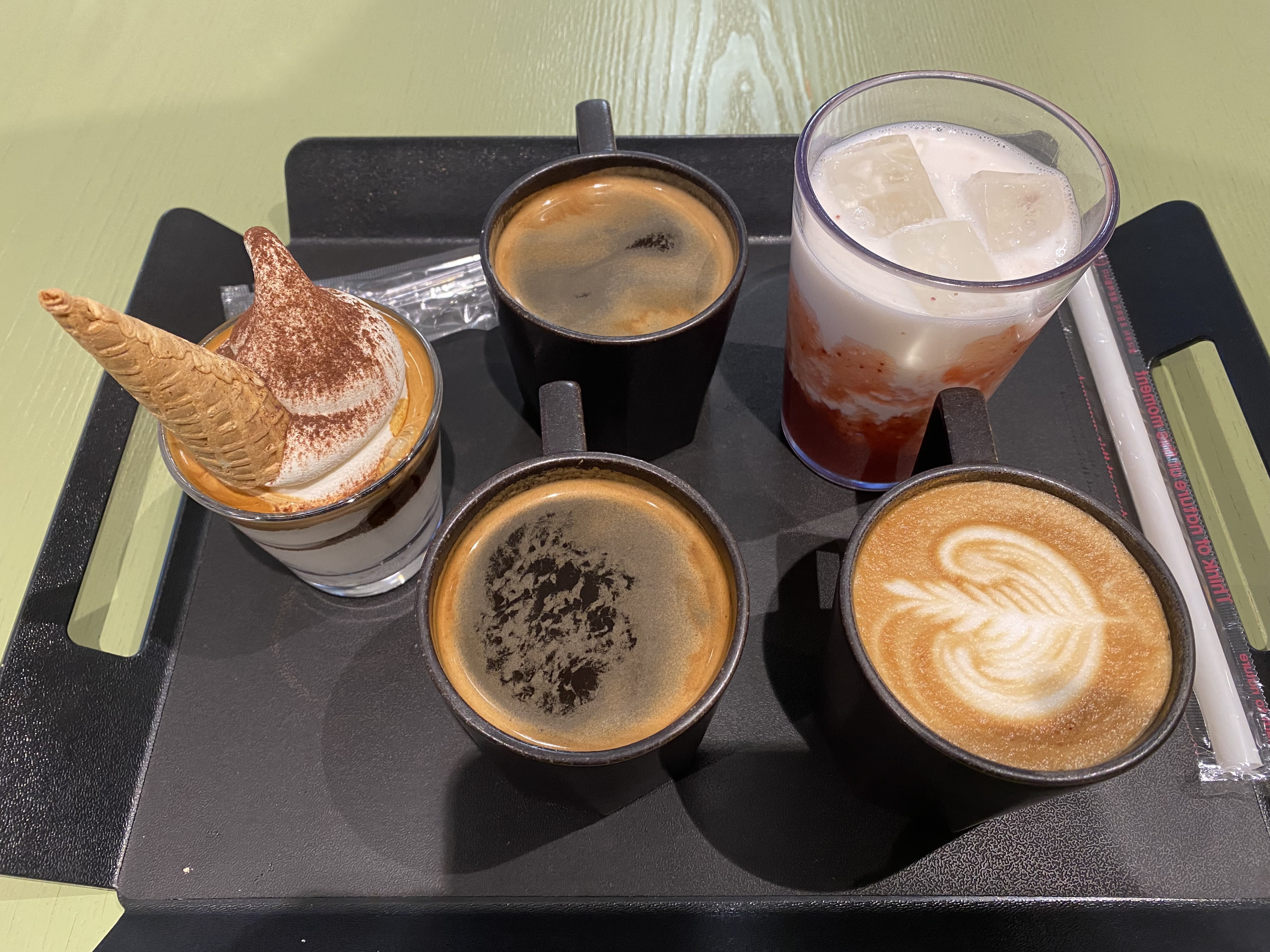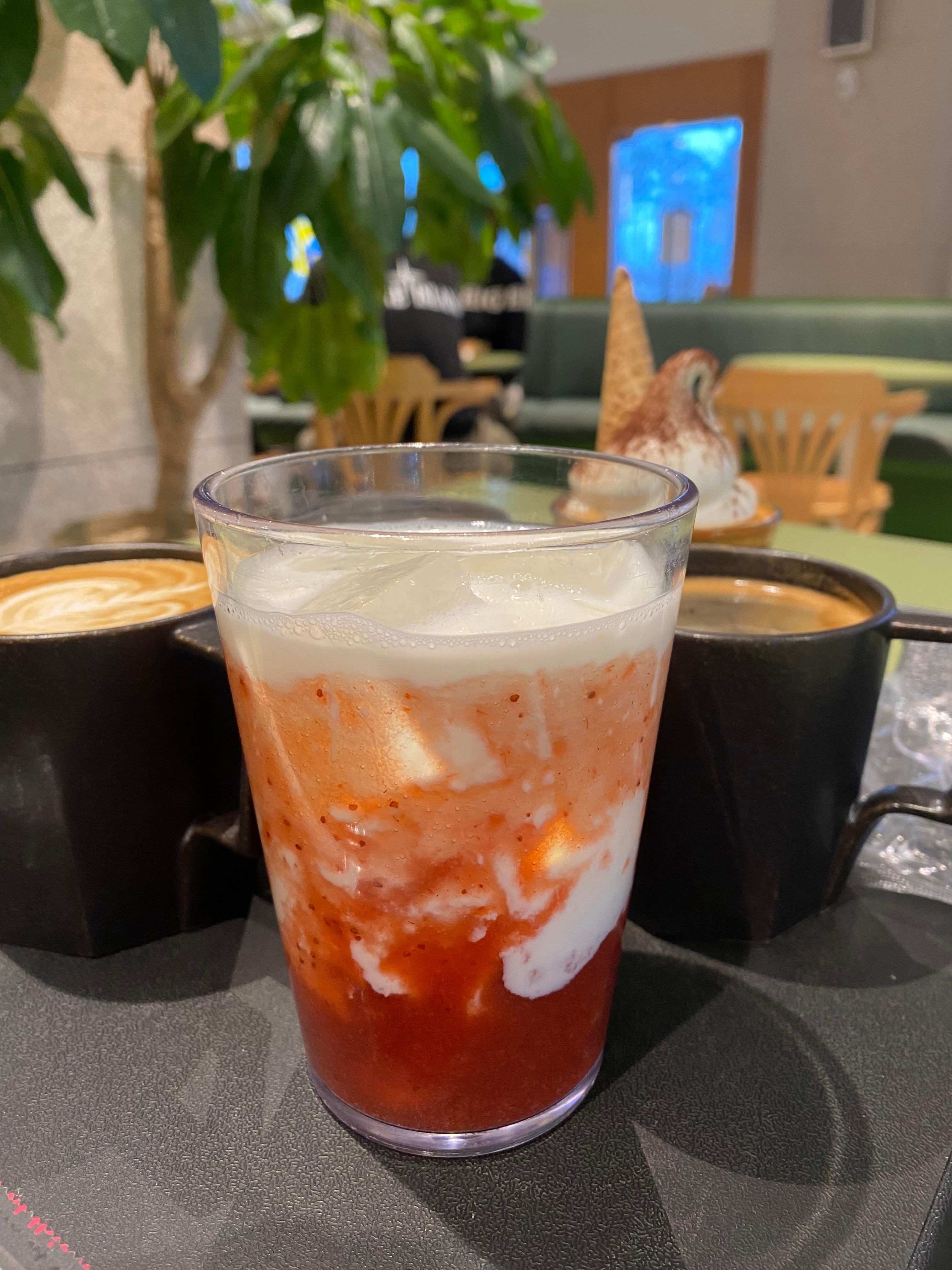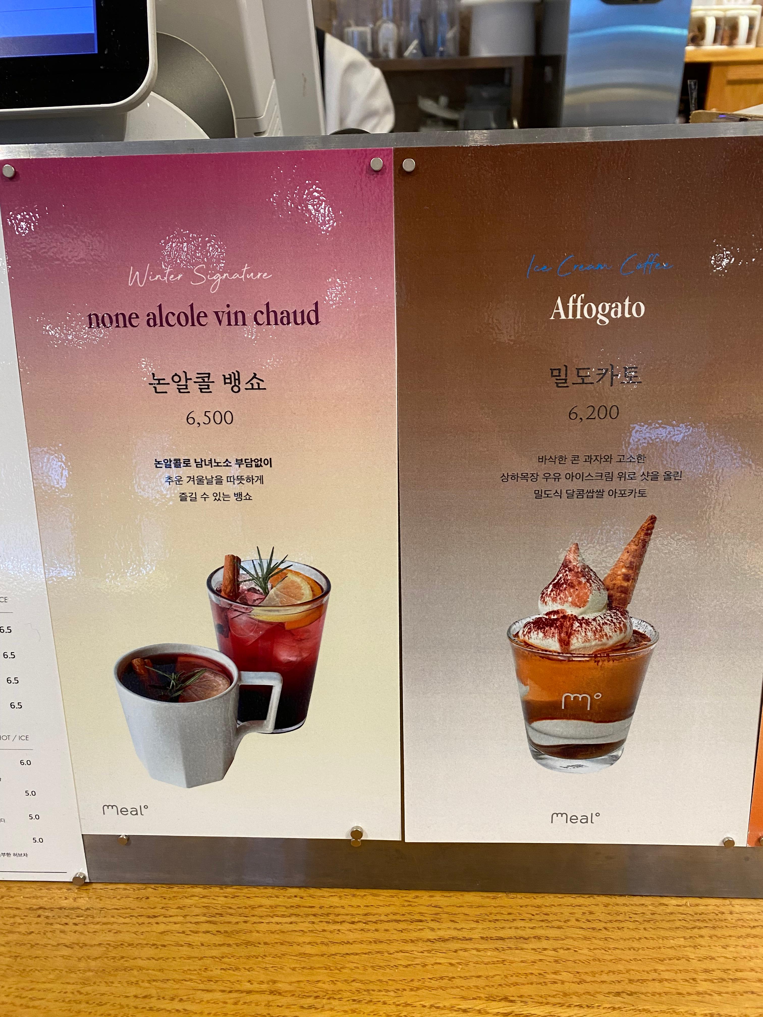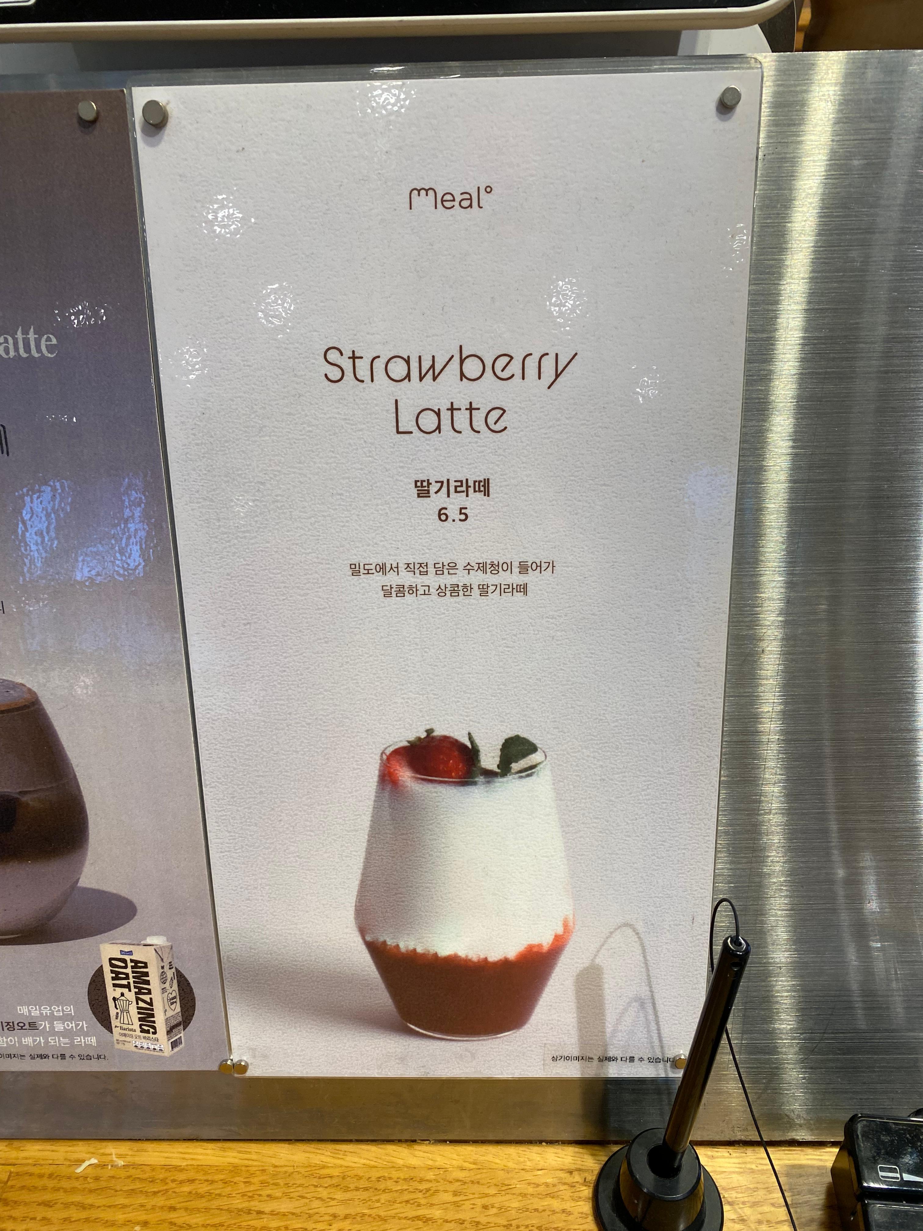 그중 특별하게 눈에 띈 밀도 카토와 딸기 라테를 따로 단독샷 남겨봤습니다. 맛은 말이죠~ 일단 딸기 라테는 메뉴에 찍혀있는 비주얼과는 너무 딴판이어서 정말 실망했습니다. 어차피 맛은 아들 몫이라 입맛에 맞는지 그냥 한큐에 끝내버렸고요, 밀도 카토는 제가 먹고 싶어 주문한 거라 맛을 확실히 평가할 수 있습니다. 비주얼은 메뉴와 엇비슷해 눈으로 보기엔 완전 맛나 보여서 엄청 좋았으나, 요거 생각보다 에스프레소 커피에 비해 아이스크림 양이 너무 많아서 엄청 달고 느끼합니다. 거의 뭐 커피 맛 살짝 나는 아이스크림을 먹는다고 해야 합니다. 투 샷으로 해결할 수 있는 양이 아닙니다. 아이스크림 양을 반 줄이고 에스프레소 커피를 투 샷으로 해야 비율이 맞을 거 같다는 생각이 드네요. 결론은 밀도 식빵 맛은 못 봐서 잘 모름. 커피는 아메리카노 평타에 밀도 카토는 비추! 요렇습니다. 지극히 개인적 입맛이라 차이가 날 수 있어요^^