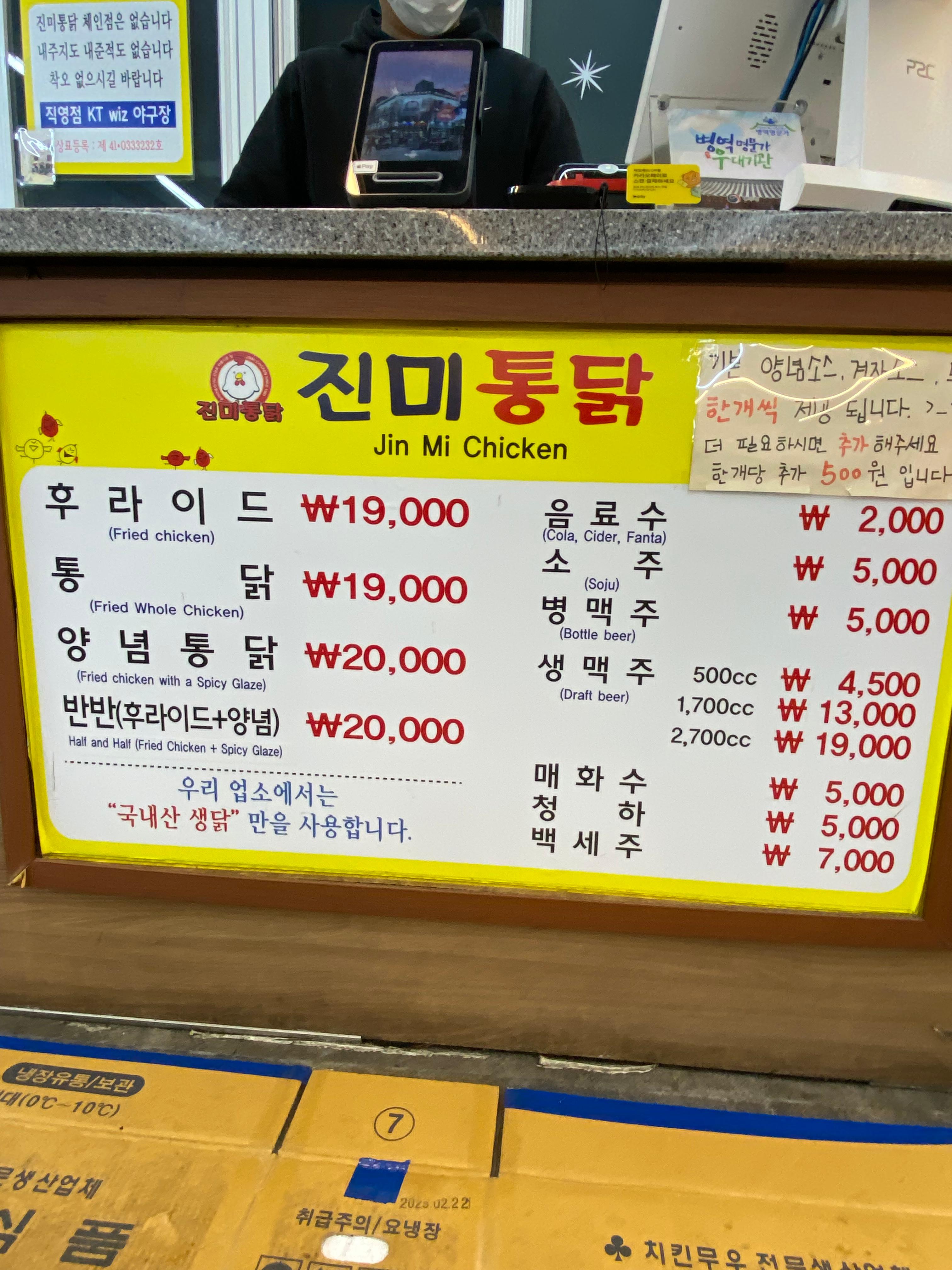 진미 통닭 입구에 요런 안내판이 세워져 있으니 꼭 참고하십쇼. 가격은 요렇습니다. 반반하려다가 처가 식구가 많은 관계로 후라이드, 양념 각 한 마리씩 주문을 했지요.