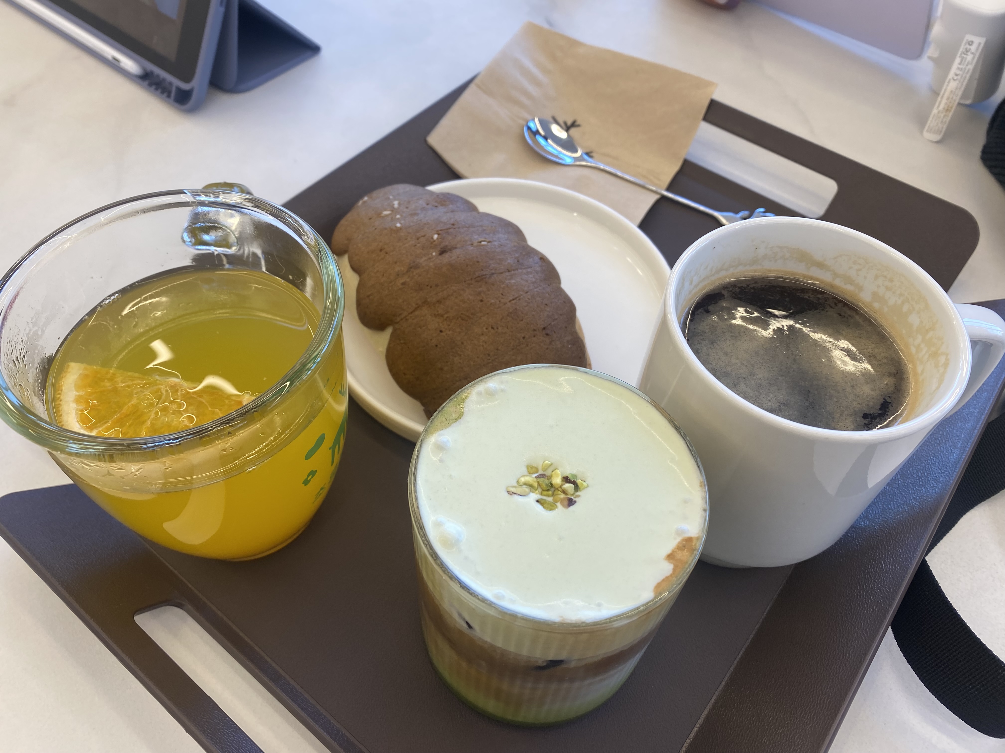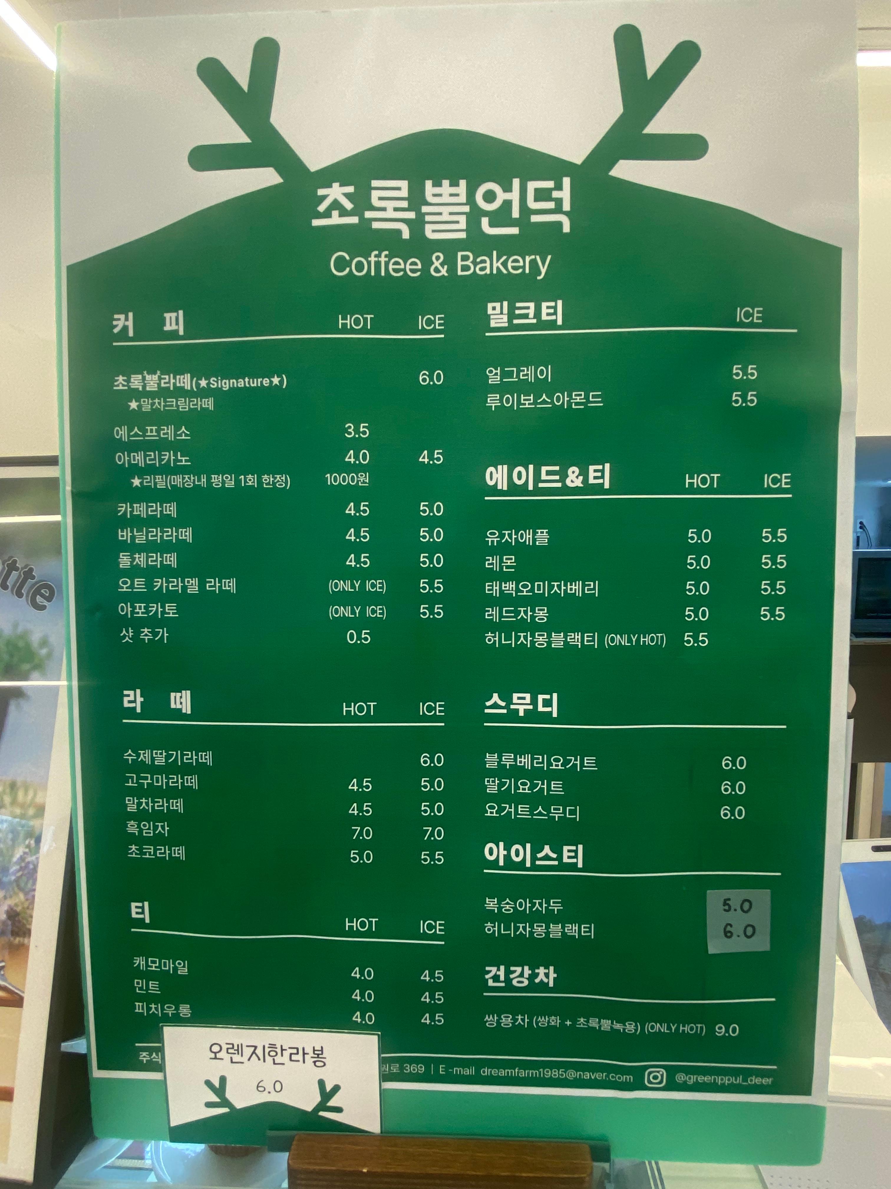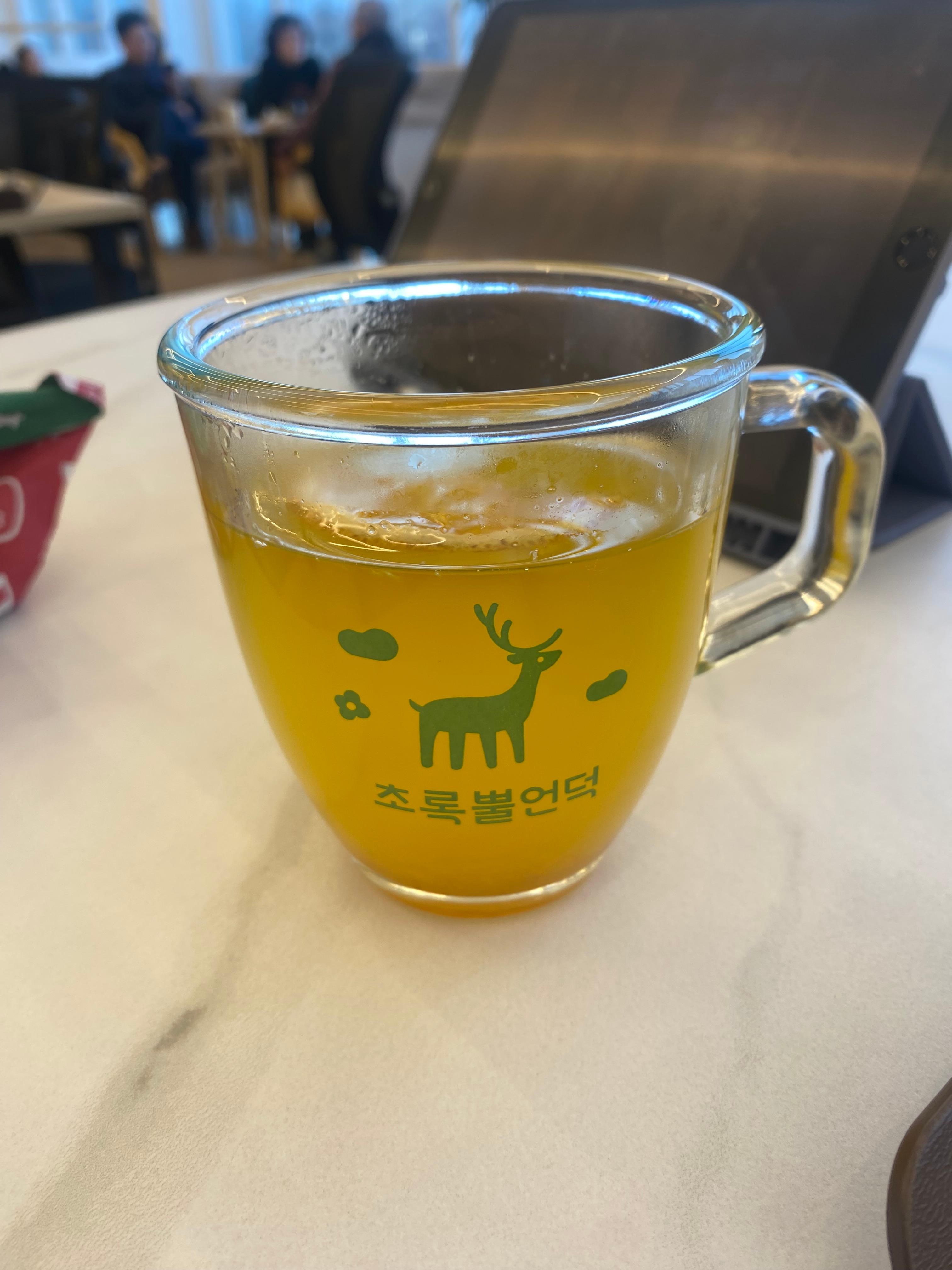 추운 날씨니께 아들한테는 유자 애플티를, 아빠는 요기 카페 시그니처 메뉴인 초록뿔라떼를 주문했습니다. 와이프님 따끈한 아메리카노로 몸 데워 줬고요. 초록뿔라떼 시그니처 메뉴 확실합니다. 마시는 순서도 설명을 해주시는데 위에 크림을 먼저 두세 모금 마시고 나서 스푼으로 휘휘 저어서 마시면 된다고 하더라고요. 지극히 개인적인 제 입맛에는 너무 맛나서 딱 좋았습니다. 굿굿~~!! 강추합니다. 여기 카페 오시면 초록뿔라떼 꼭 한잔 맛보시고 가세요.