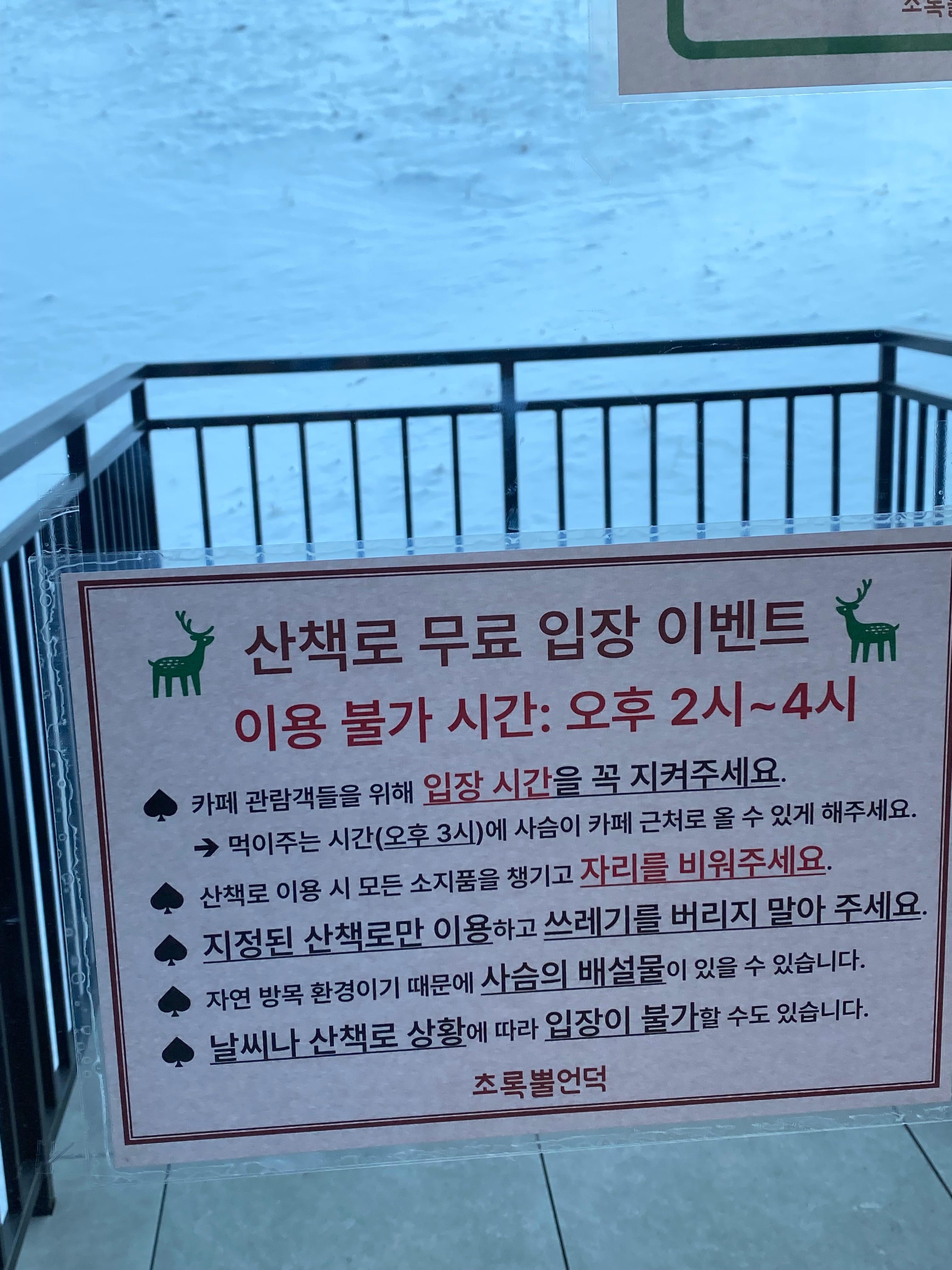 카페 내부에서 외부로 나가는 문이 있는데 언덕이 보이는 쪽에 운 좋게도 사슴 밥 먹는 시간이 되어서 사슴과 함께 포토 타임을 가질 수 있었네요.
