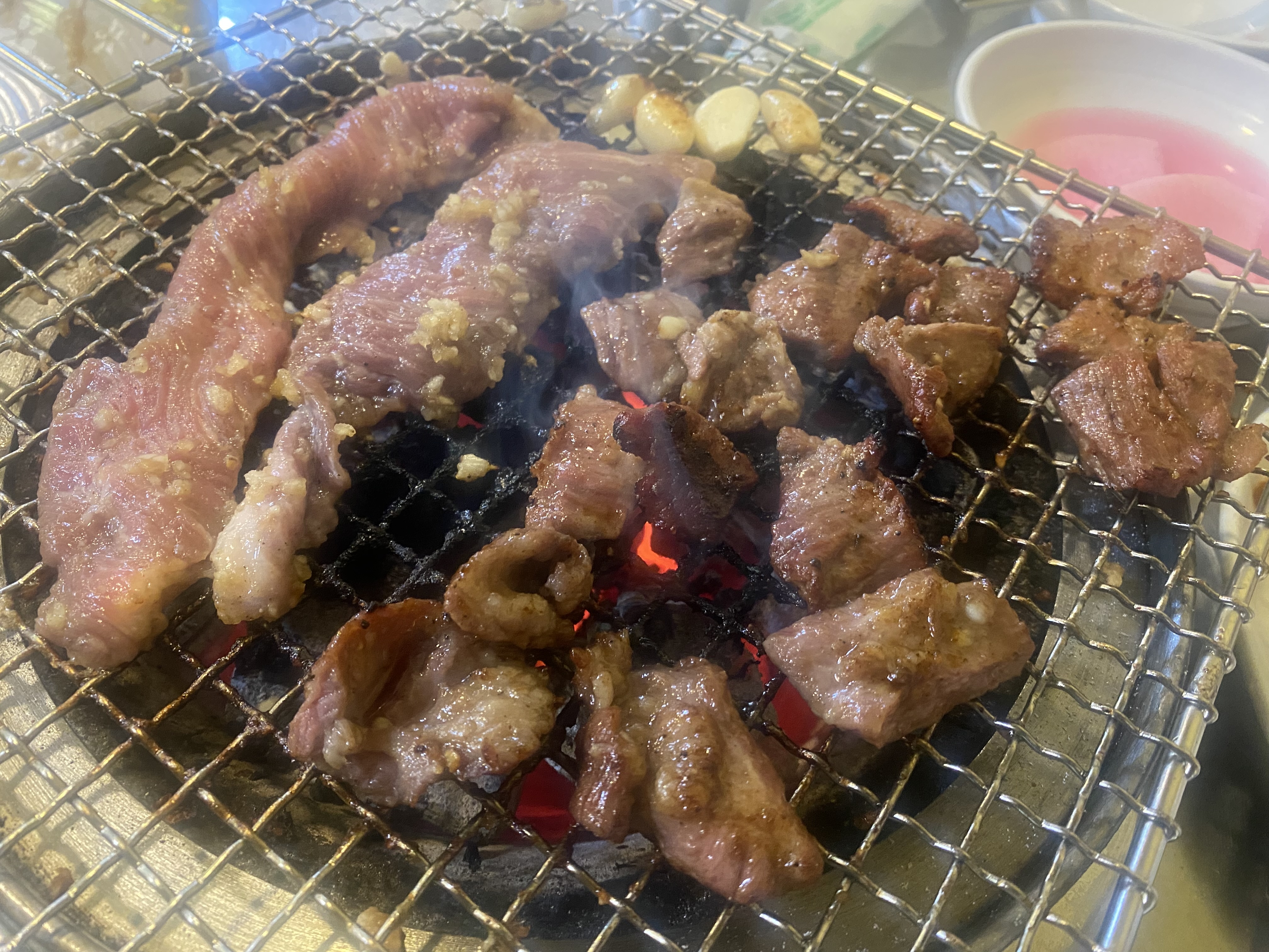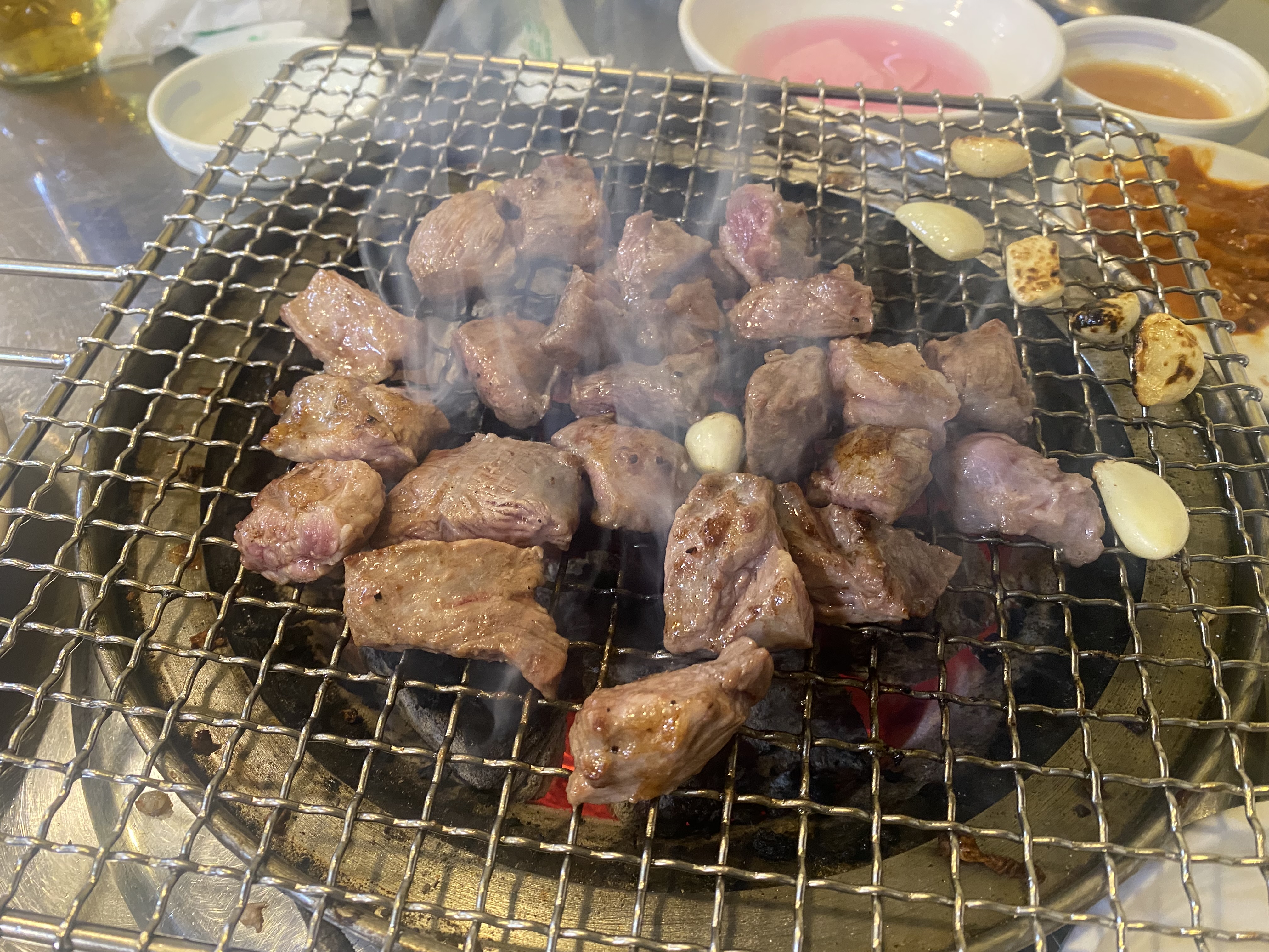 양념 갈매기 5인분 큼지막하게 한판 준비되어 나왔고요~ 열심히 숯불에 구워 맛있게 호호 불며 육즙 가득 갈매기살을 즐겼습니다. 너무 맛있어서 소식좌 가족인데 5인분 순삭~!!