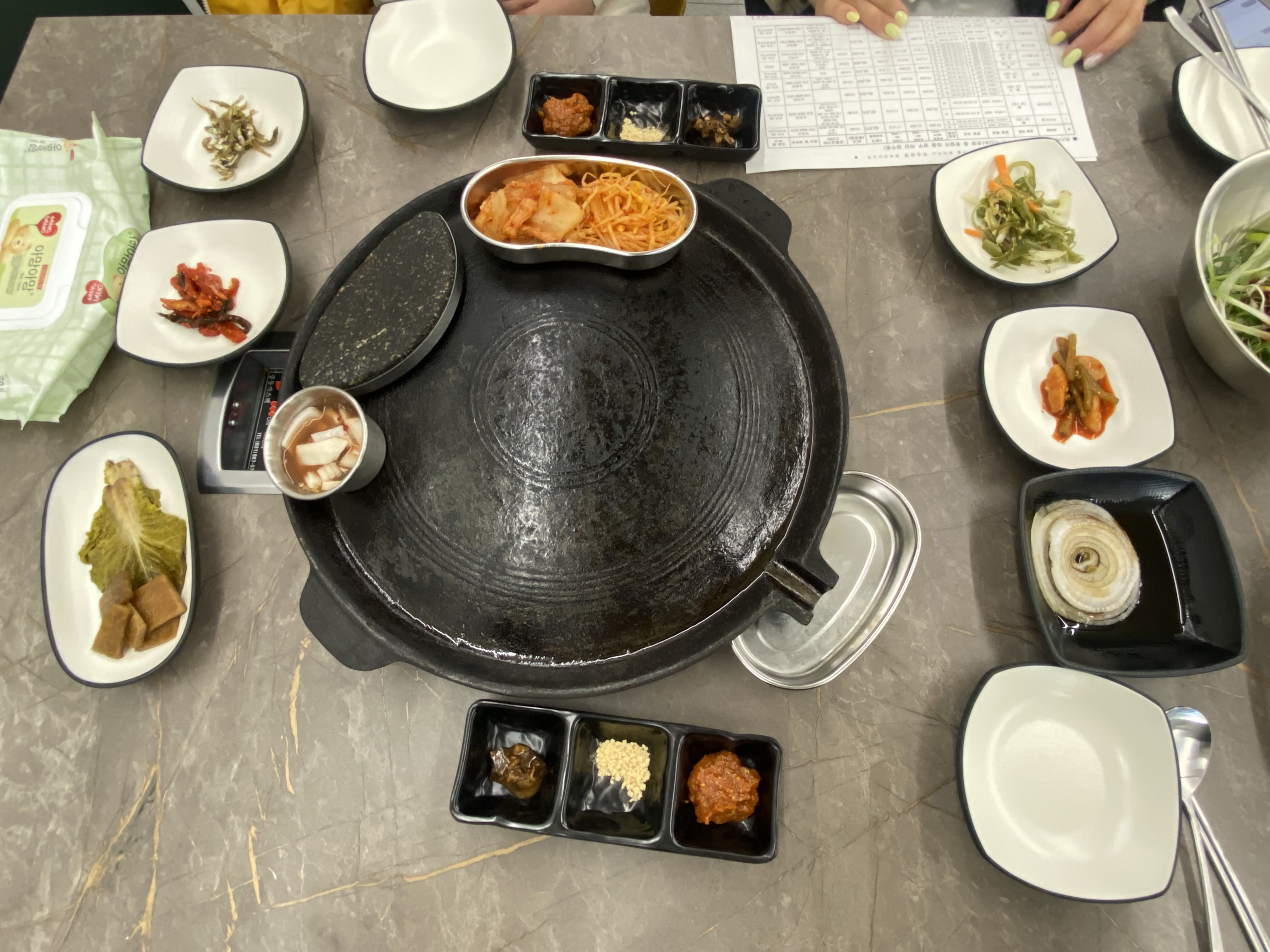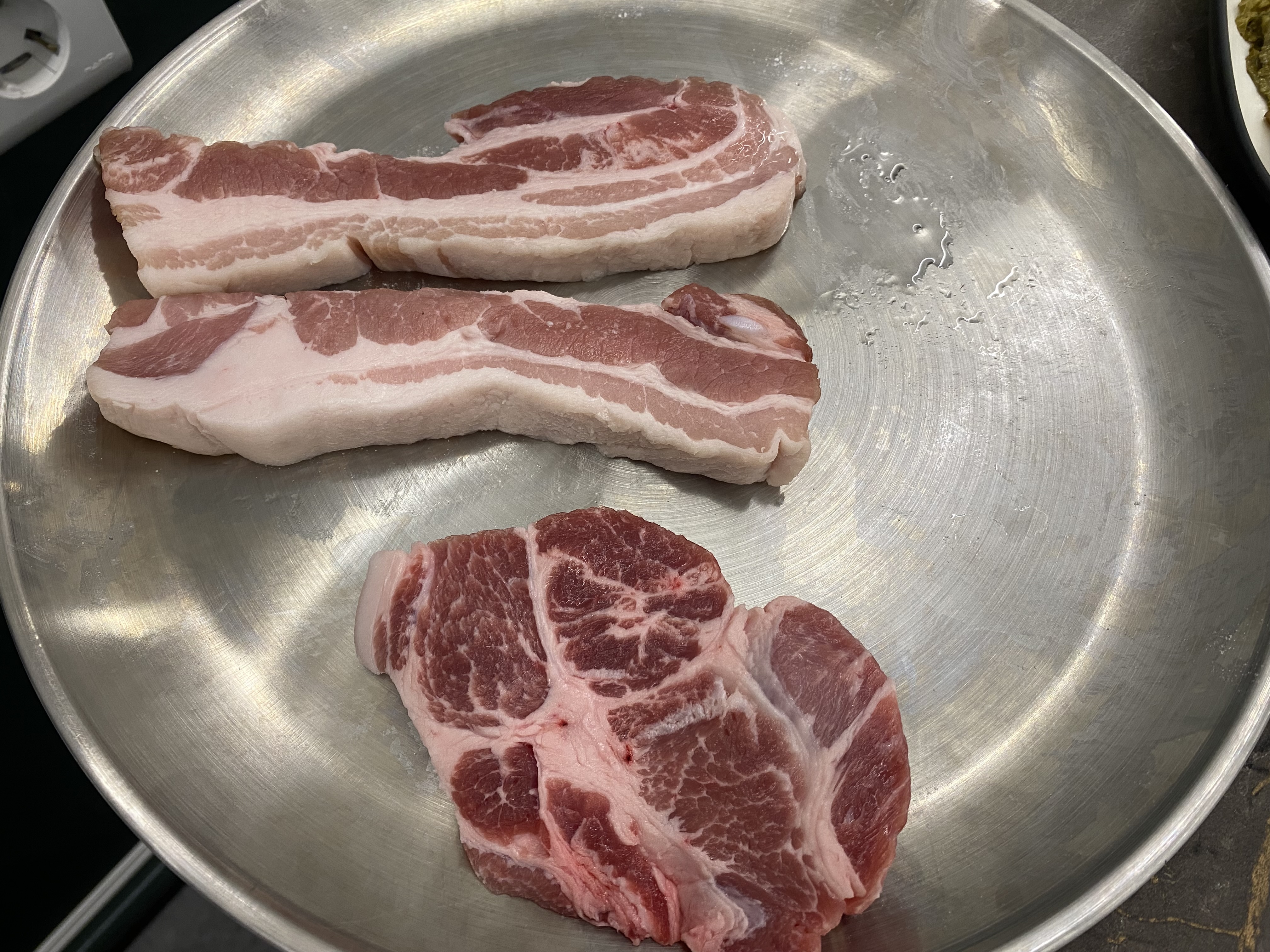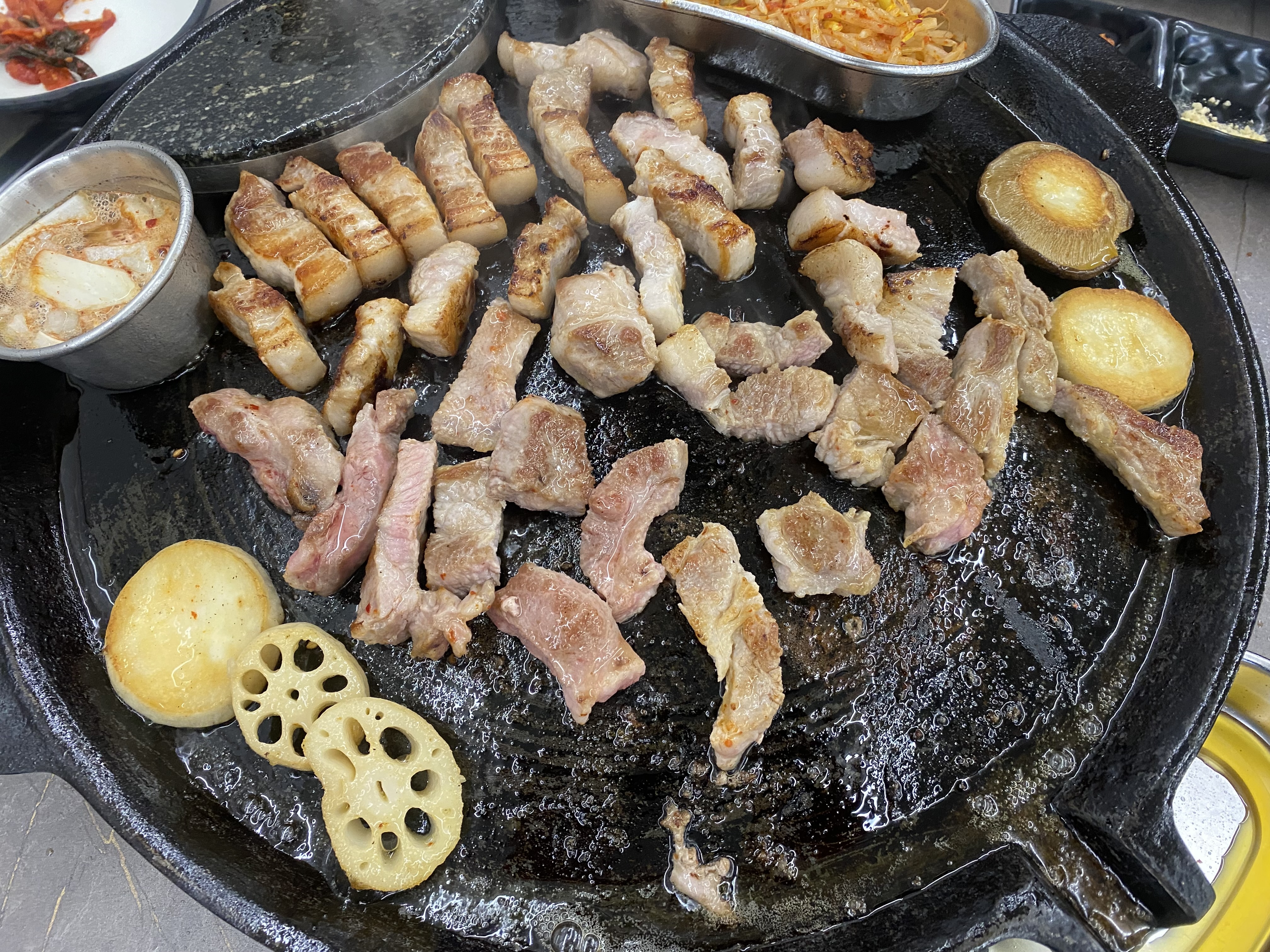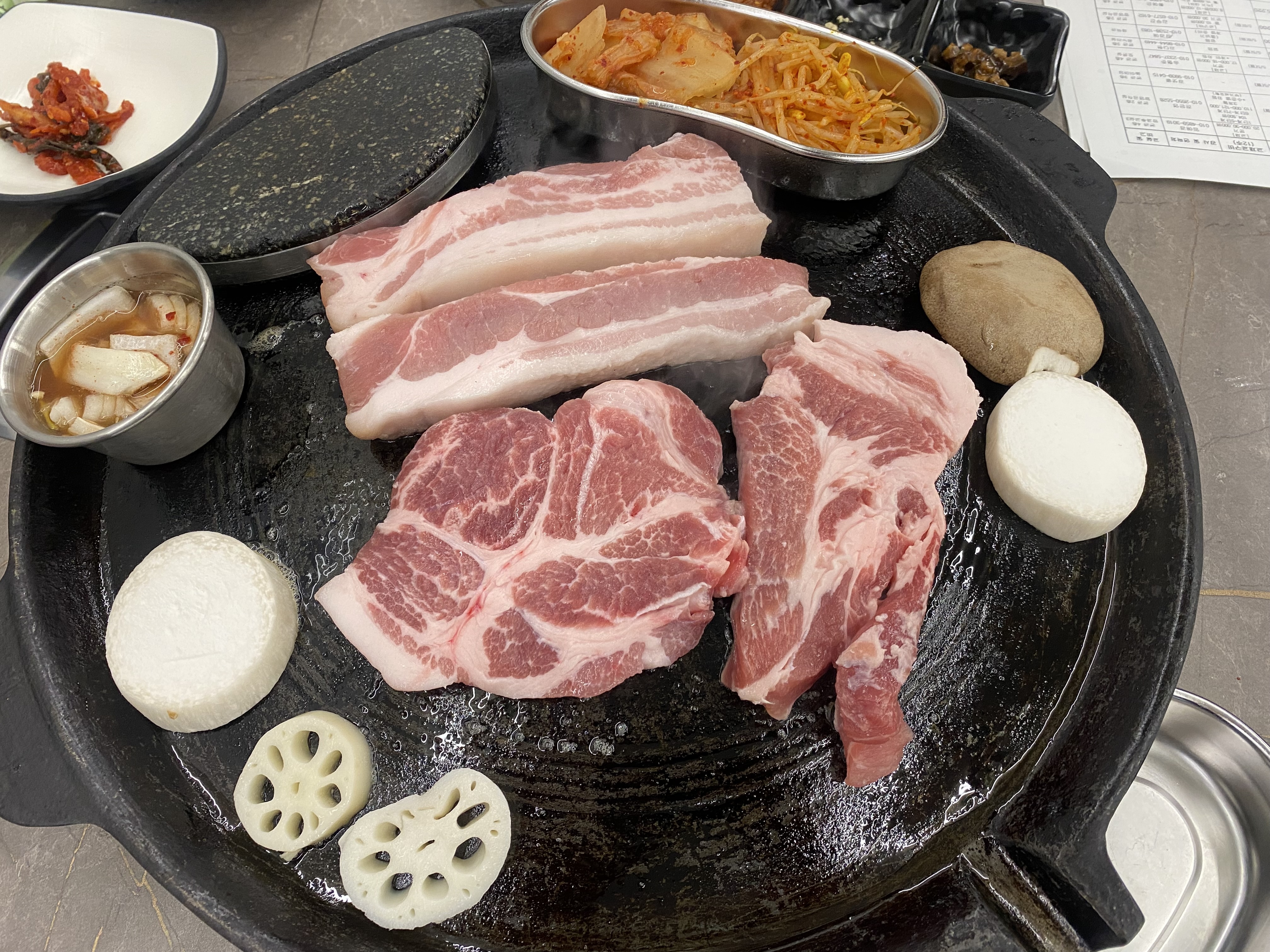 삼겹 3인분 + 목살 2인분 조합으로 주문을 하고 밑반찬 세팅되면서 고기가 나오기까지 잠시 기다림이~~ 불판은 무쇠솥뚜껑에 가스불로 고기를 굽습니다.